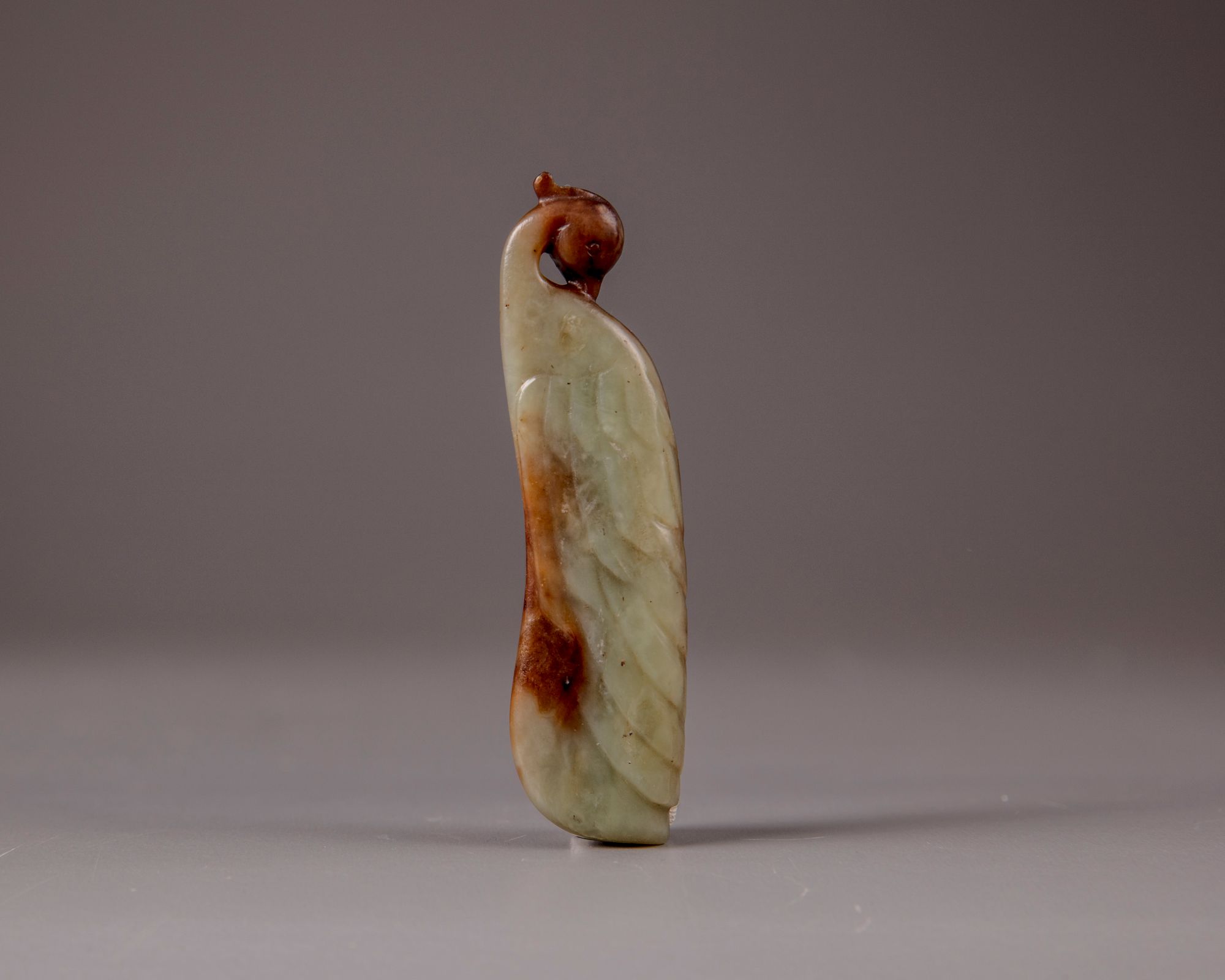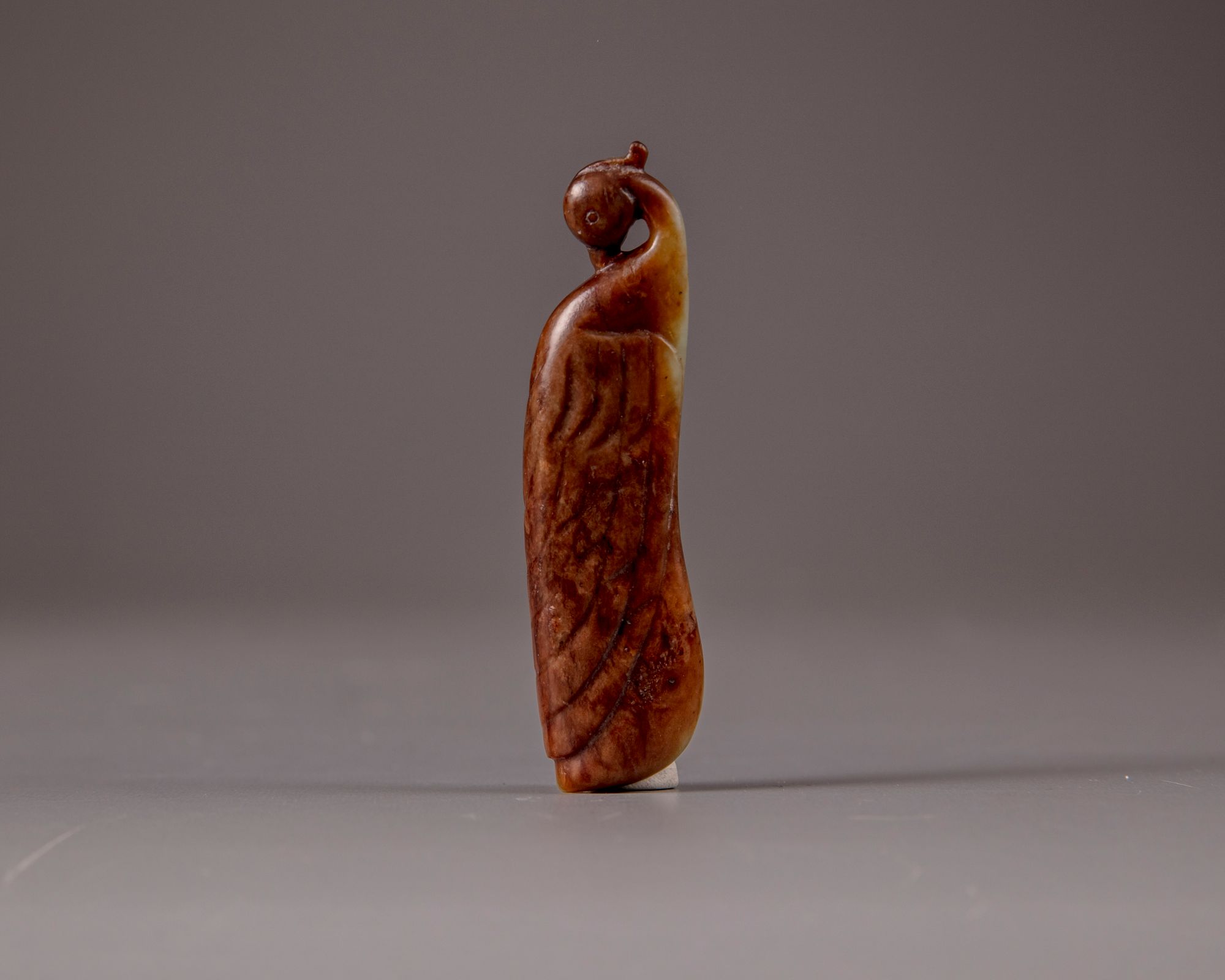 The peacock is smoothly and elegantly carved with its head facing towards its closed wings, the feathers of the wings are finely detailed. The stone is of a celadon tone to one side and a russet tone to the other. Provenance: From the collection of mr. J.E. Vaandrager