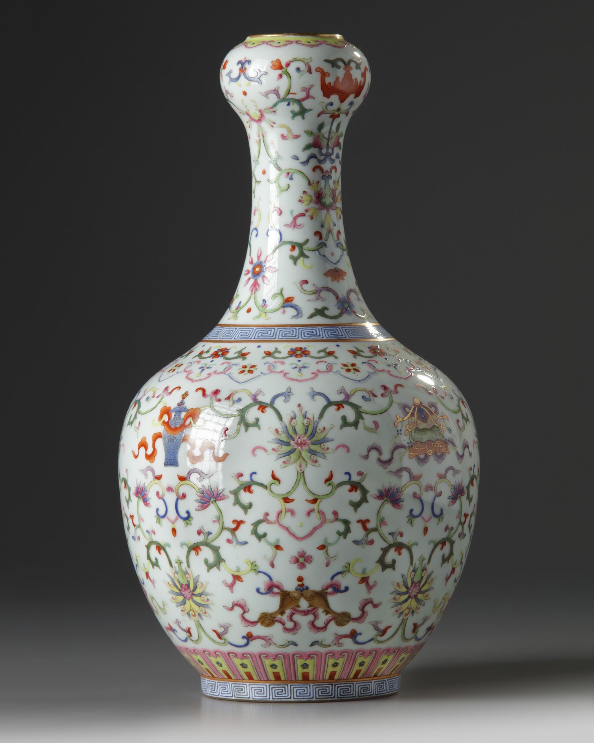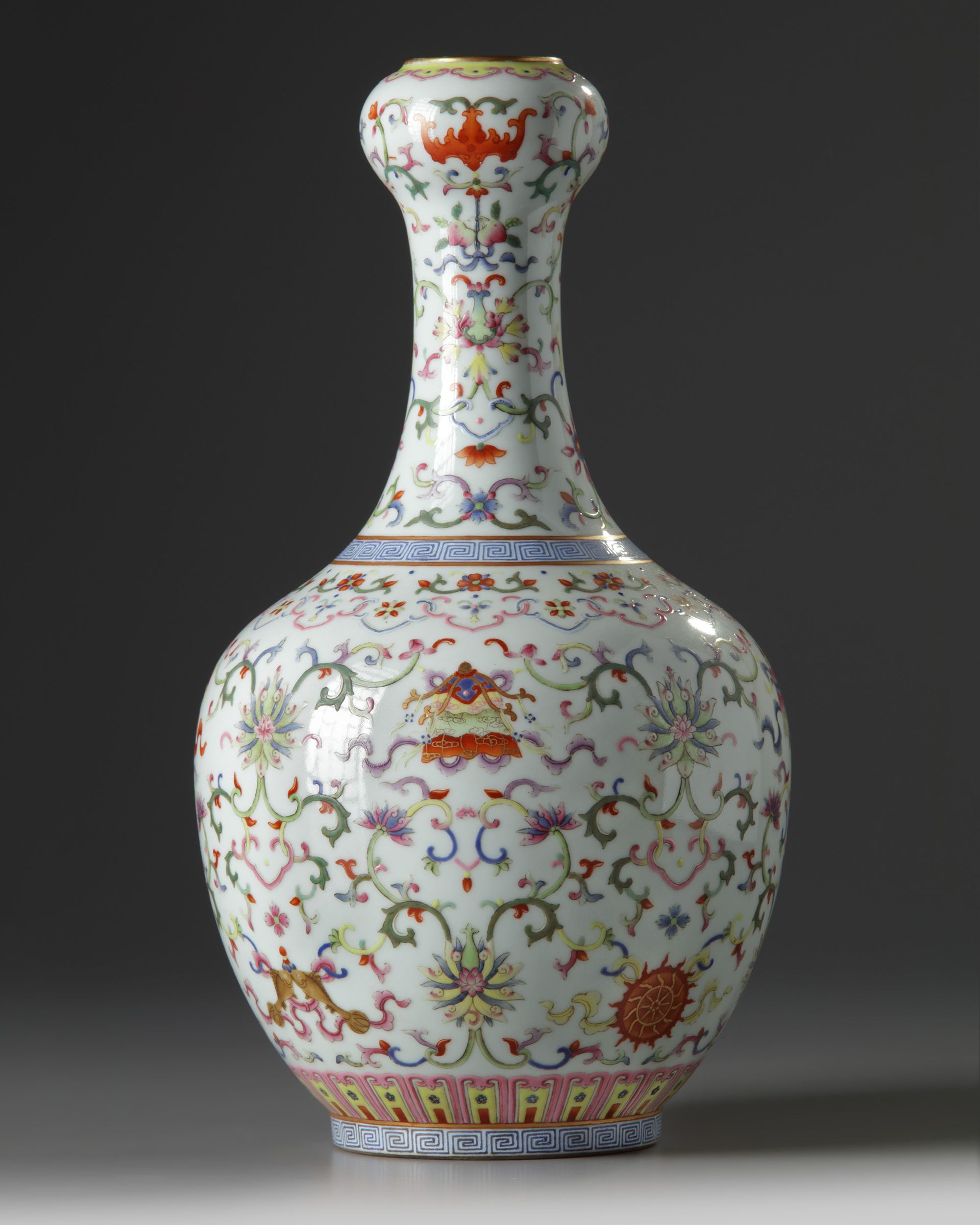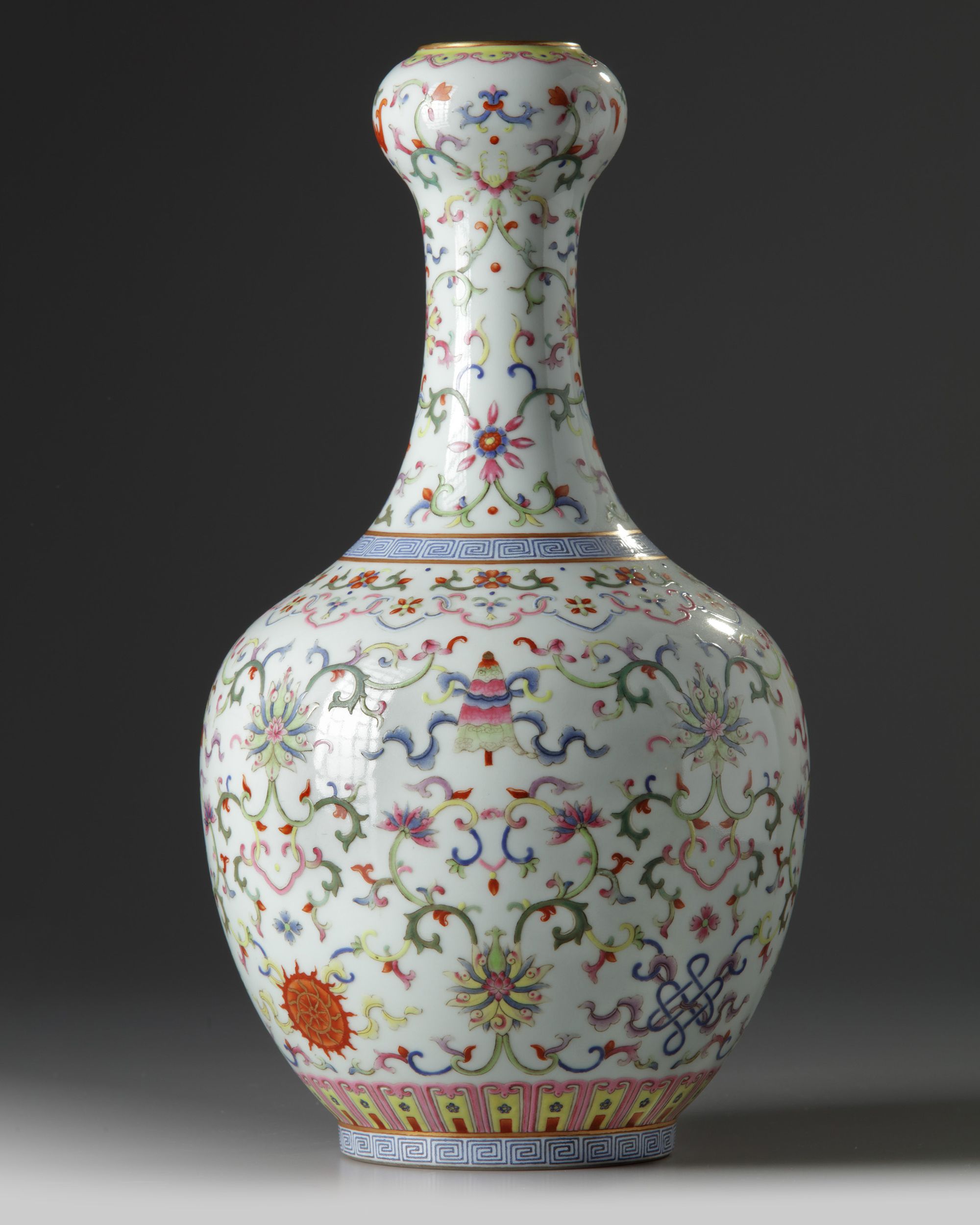The vase is decorated to the body with the Eight Buddhist Emblems amongst scrolling lotus, all below a band of interlocking ruyi heads, and a band of classic scroll at the shoulder. The waisted neck is decorated with further scrolling lotus below a bat and two peaches. The interior and base are enamelled turquoise with an apocryphal Jiaqing mark.
