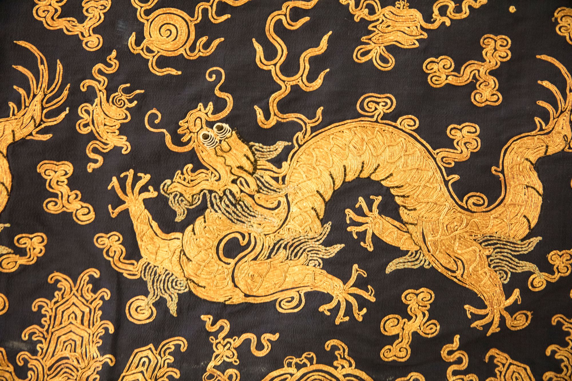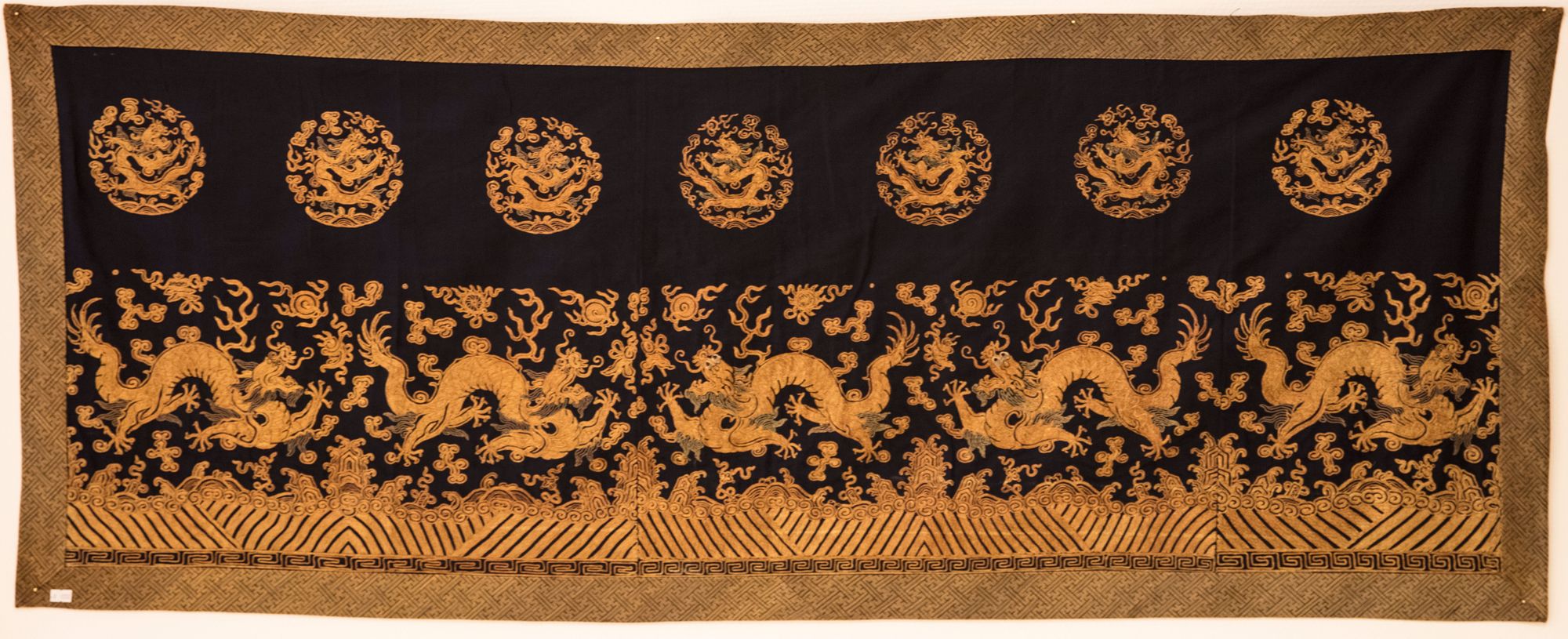The panel is decorated with gilt-touched five toed dragons above waves and roundels on a deep blue ground, mounted with a key fret border and backed with gauze. Catalogue notes: The roundels suggest that the fabric for the panel was intended for a chaofu skirt.