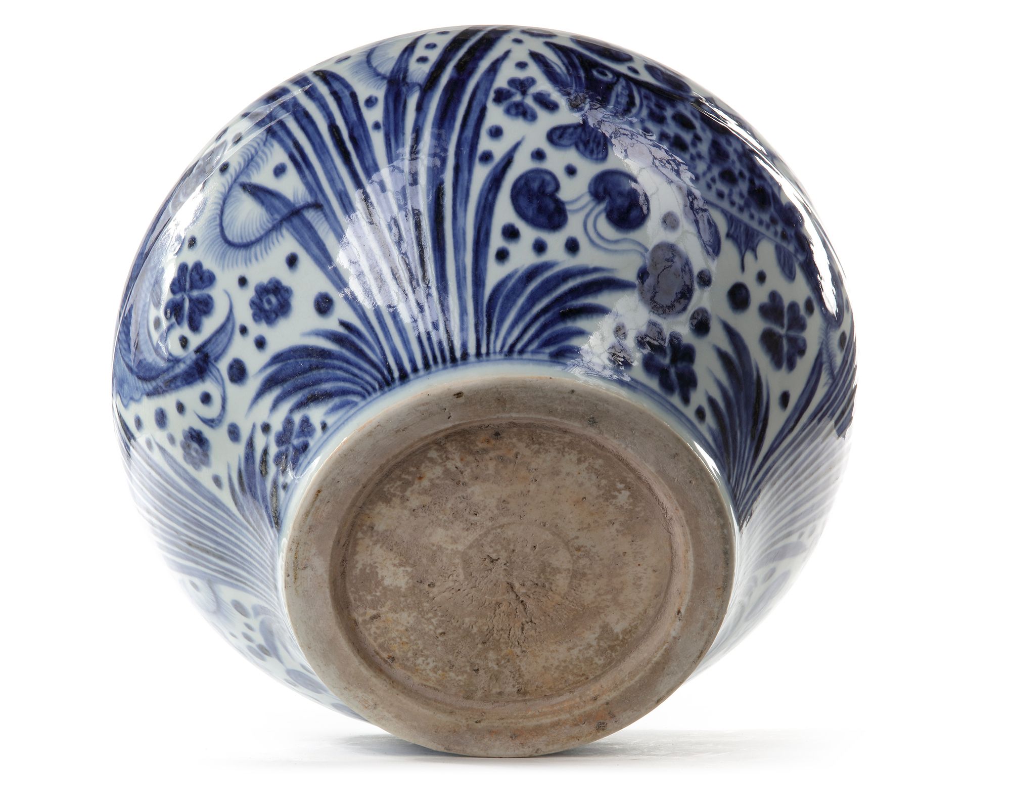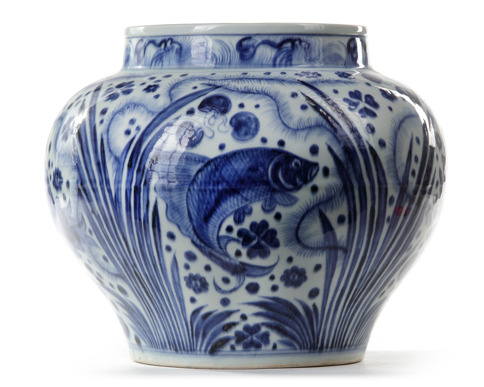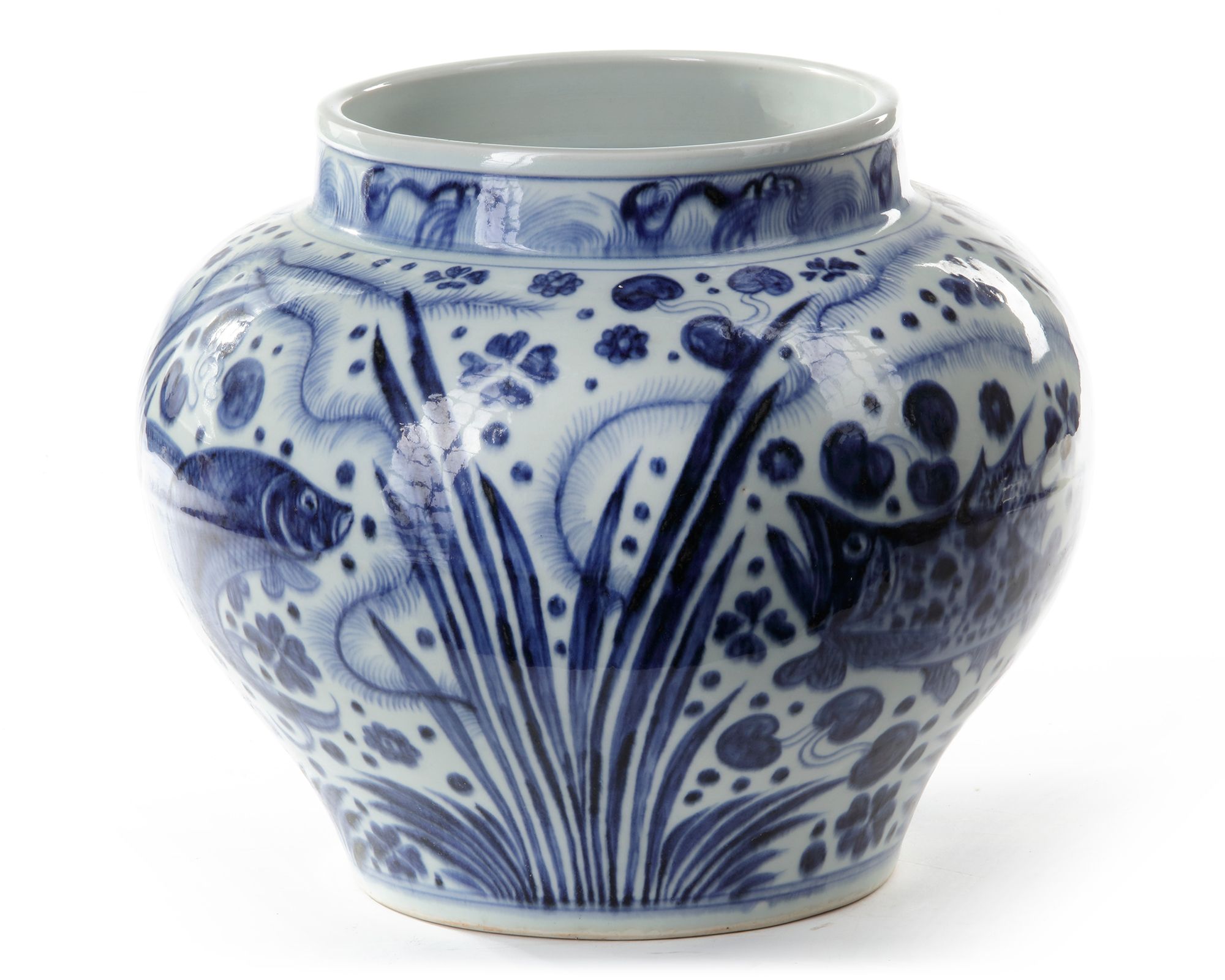 Finely painted in broad strokes in cobalt of soft inky-blue tone with four different species of fish, confronted in pairs, interspersed with clusters of flowering lotus, swimming among duckweed and ferns, all above clumps of wavy stemmed eel grass rising from the base, the short vertical neck with a thin border of a wave band between line borders. 27.5 cm