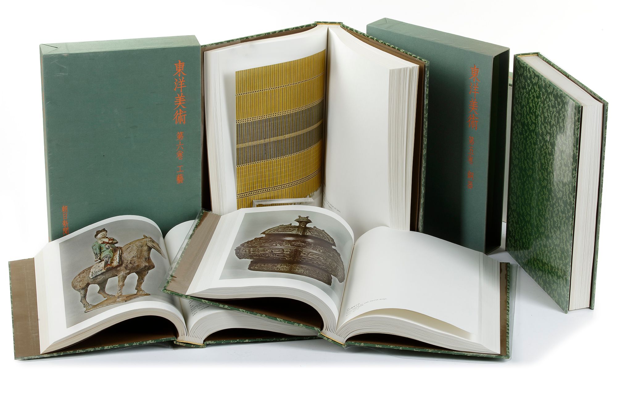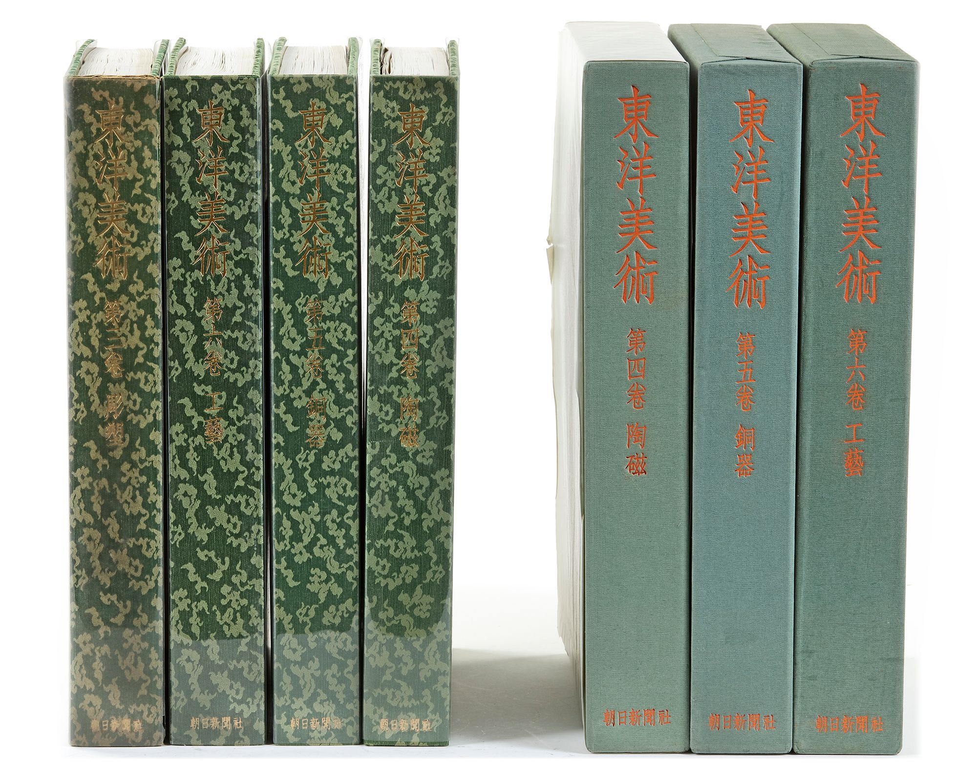Toyo Bijutsu - Asiatic Art in Japanese Collections. Volume 6: Decorative Art. Tokyo: Asahi Shimbun, 1969. First edition. 104 Pages in Japanese. 108 Objects richly illustrated with tipped-in colour plates, some objects with multiple plates. All objects with Japanese and English captions. Main text in Japanese. An important volume on Asiatic decorative (mainly Chinese) arts illustrating a fine variety of jade, lacquers, textiles, smaller bronze and gold wares, etc. ; Toyo Bijutsu - Asiatic Art in Japanese Collections. Volume 5.: Chinese Archaic Bronzes. Tokyo: Asahi Shimbun, 1969. First edition. 73 Pages in Japanese. 96 Objects richly illustrated with tipped-in colour plates, some objects with multiple plates. All objects with Japanese and English captions. Main text in Japanese. An important volume on mainly Chinese archaic bronzes. ; Toyo Bijutsu - Asiatic Art in Japanese Collections. Volume 4.: Ceramics. Tokyo: Asahi Shimbun, 1968. First edition. 91 Pages in Japanese. 92 Objects richly illustrated with tipped-in colour plates, some objects with multiple plates. All objects with Japanese and English captions. Main text in Japanese. An important volume on mainly Chinese ceramics of the highest quality made for the Chinese market. ; Toyo Bijutsu - Asiatic Art in Japanese Collections. Sculpture. Tokyo: Asahi Shimbun, 1968. First edition. 102 Pages in Japanese. 94 Objects richly illustrated with tipped-in colour plates, some objects with multiple plates. All objects with Japanese and English captions. Main text in Japanese. An important volume on mainly Chinese sculpture of the highest quality. PROVENANCE: All from the library of Edward T. Chow, Geneva, Switzerland.