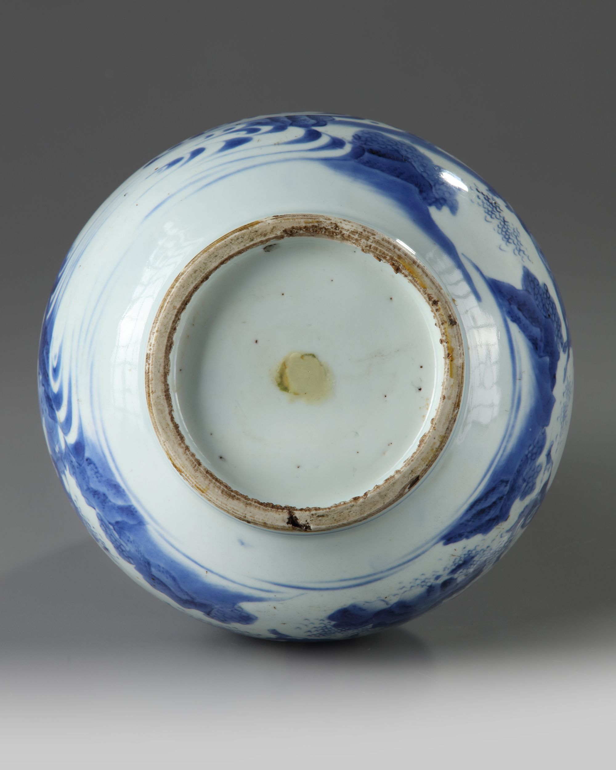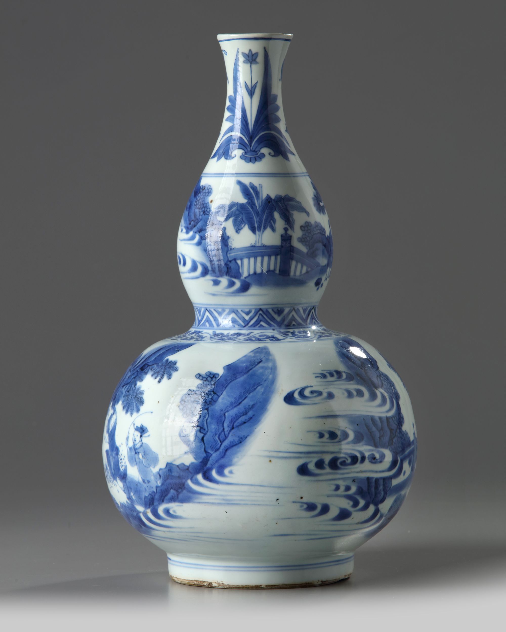 Delicately decorated to the lower register with a scholar on horseback being chased by various figures, the upper register decorated with a seated scholar with an attendant, the upper neck decorated with European flower scrolls. The waist decorated with flower scrolls and triangular band.