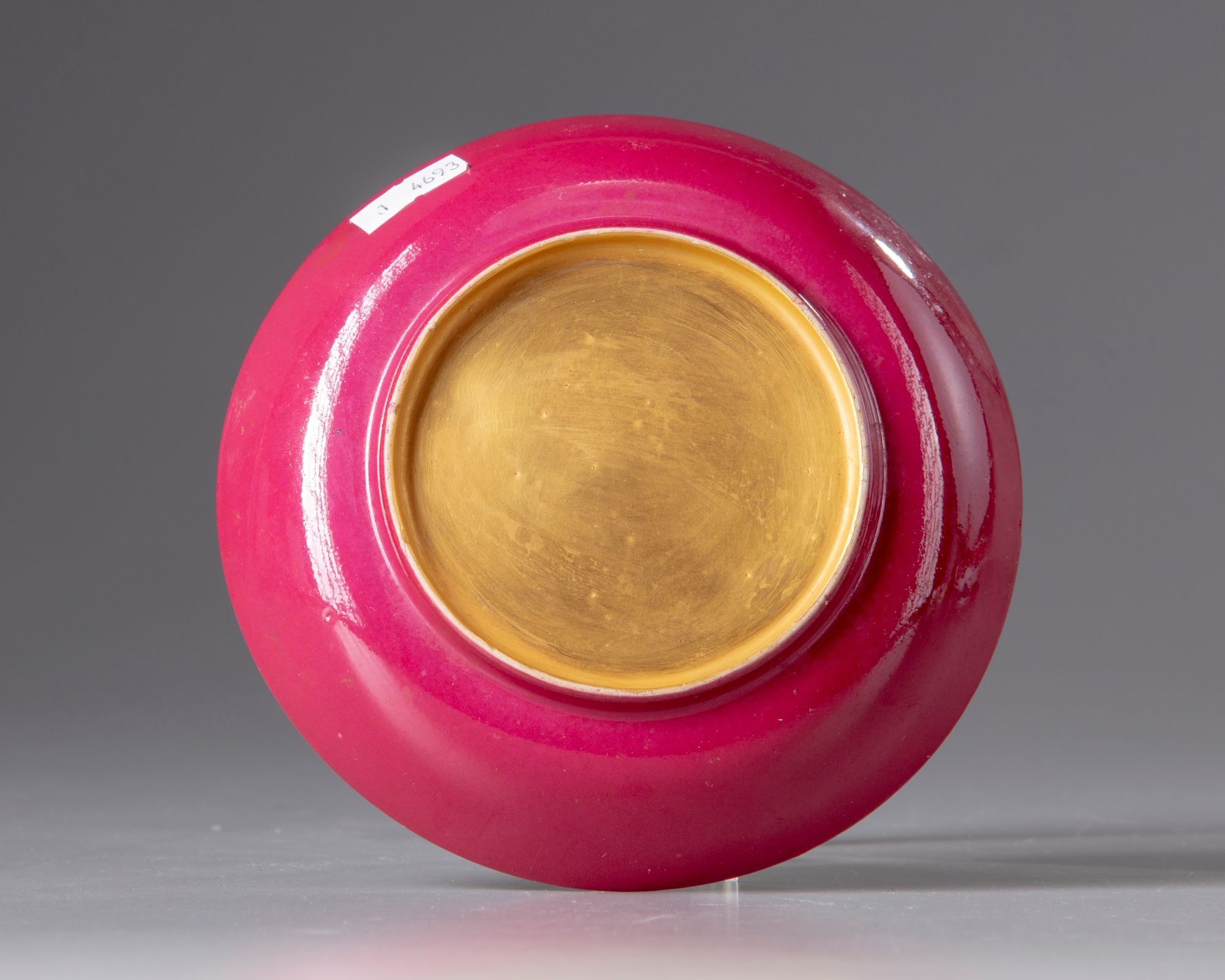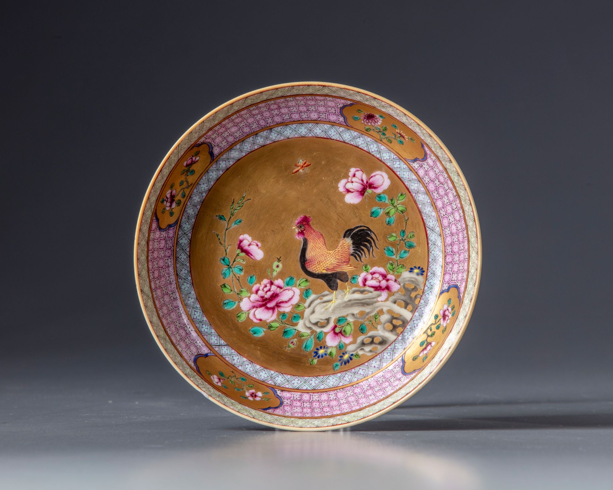 A dish stands on a small footring, with conical sides. Decorated to the centre with a rooster standing amongst ornamental rocks and flowers on a gilt ground.