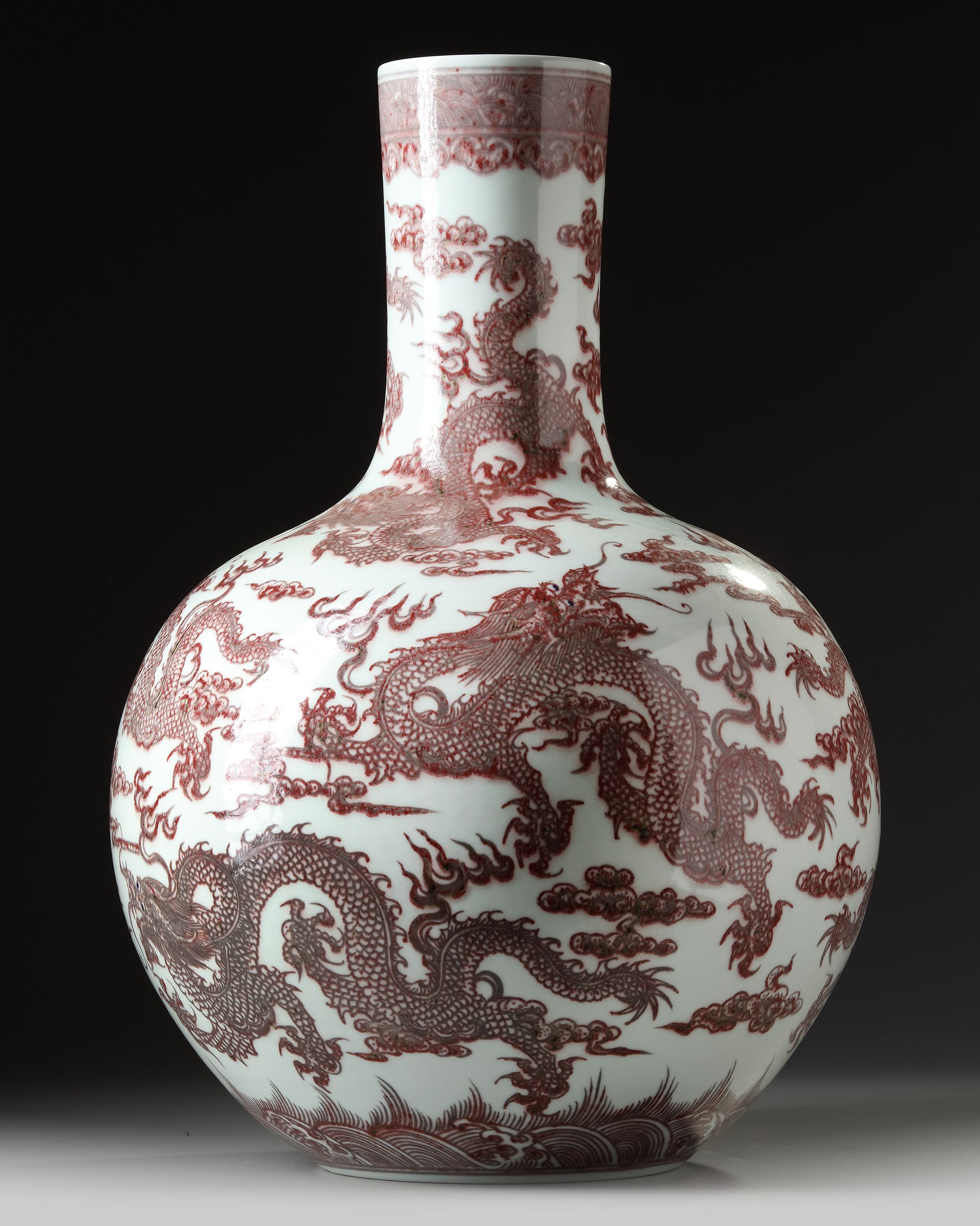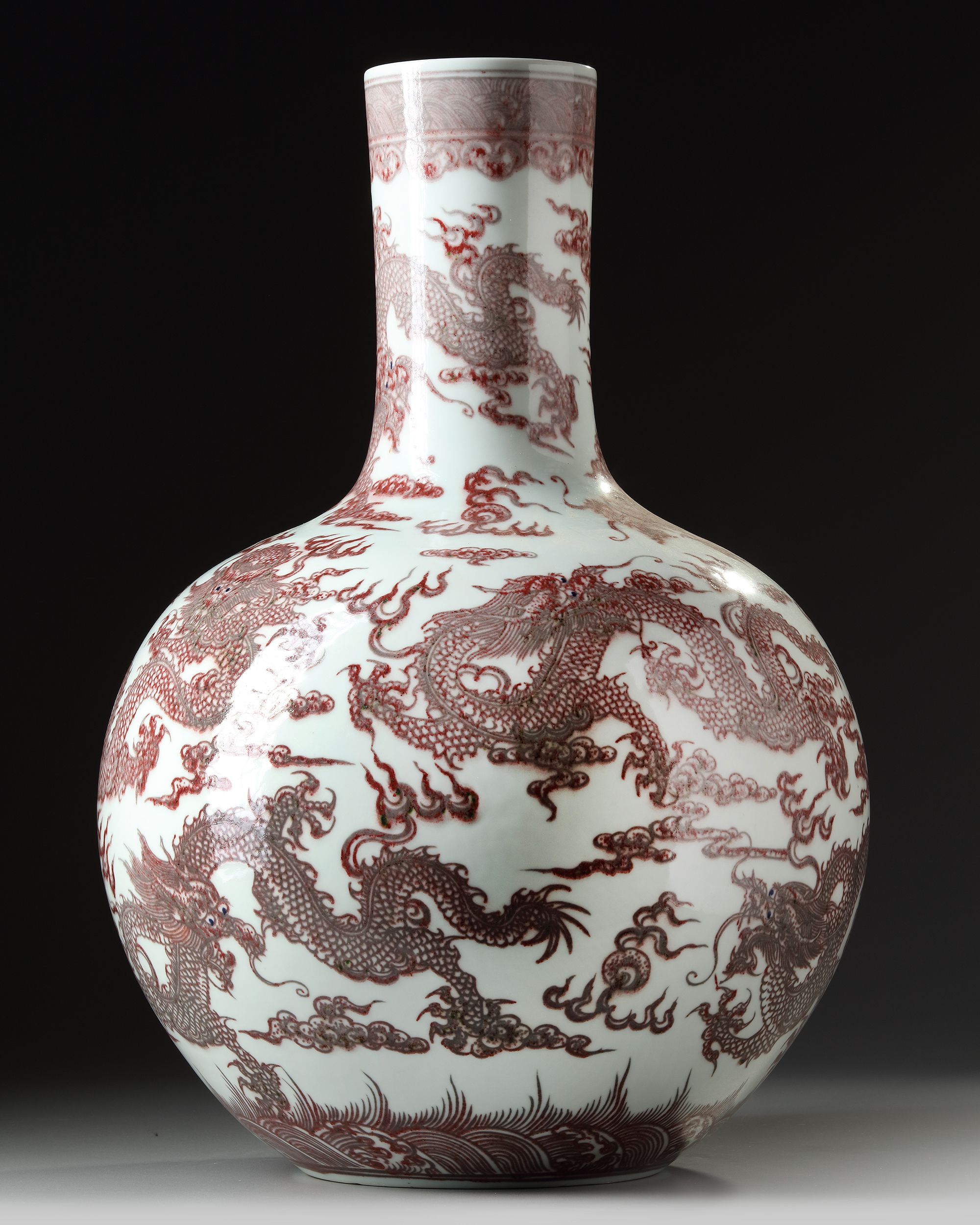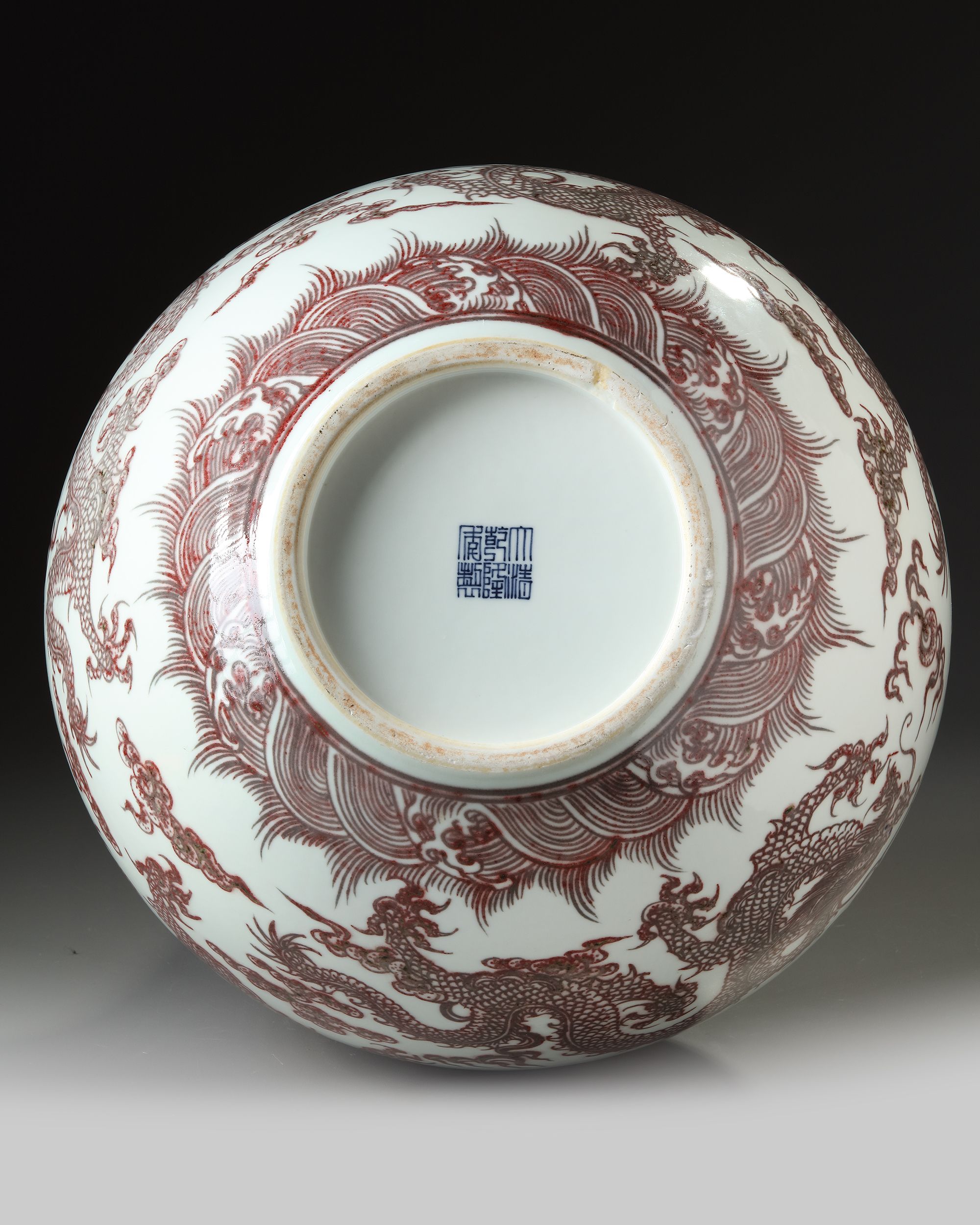 Decorated in copper red with large five clawed dragon leaping in different postures amongst flaming pearl and clouds above sea waves. The bottom with a Chinese Qianlong seal mark.