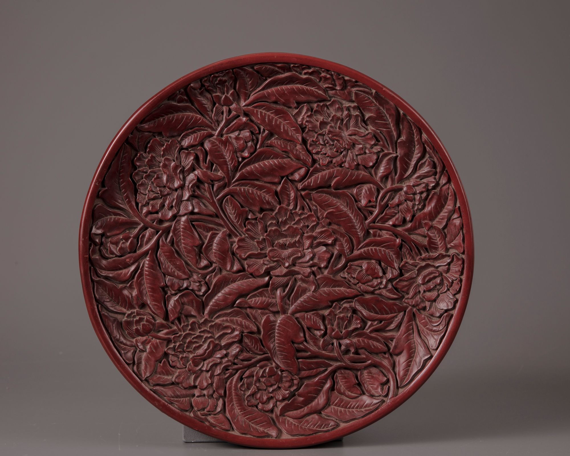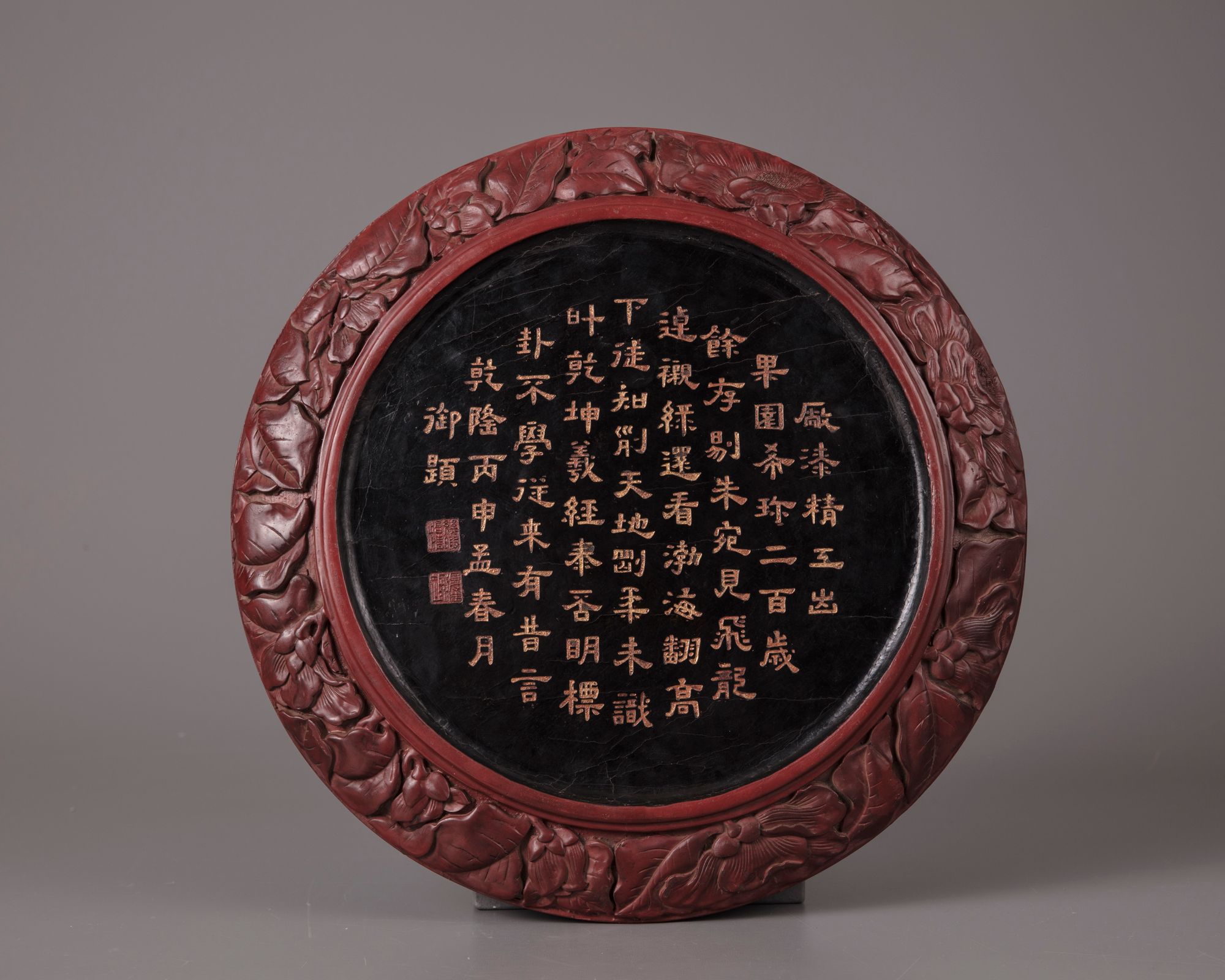 The dish is densely carved with peonies to the upper surface, the underside is inscribed with a carved gilt Qianlong poem.