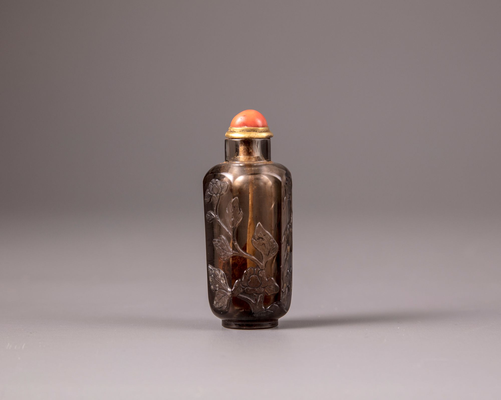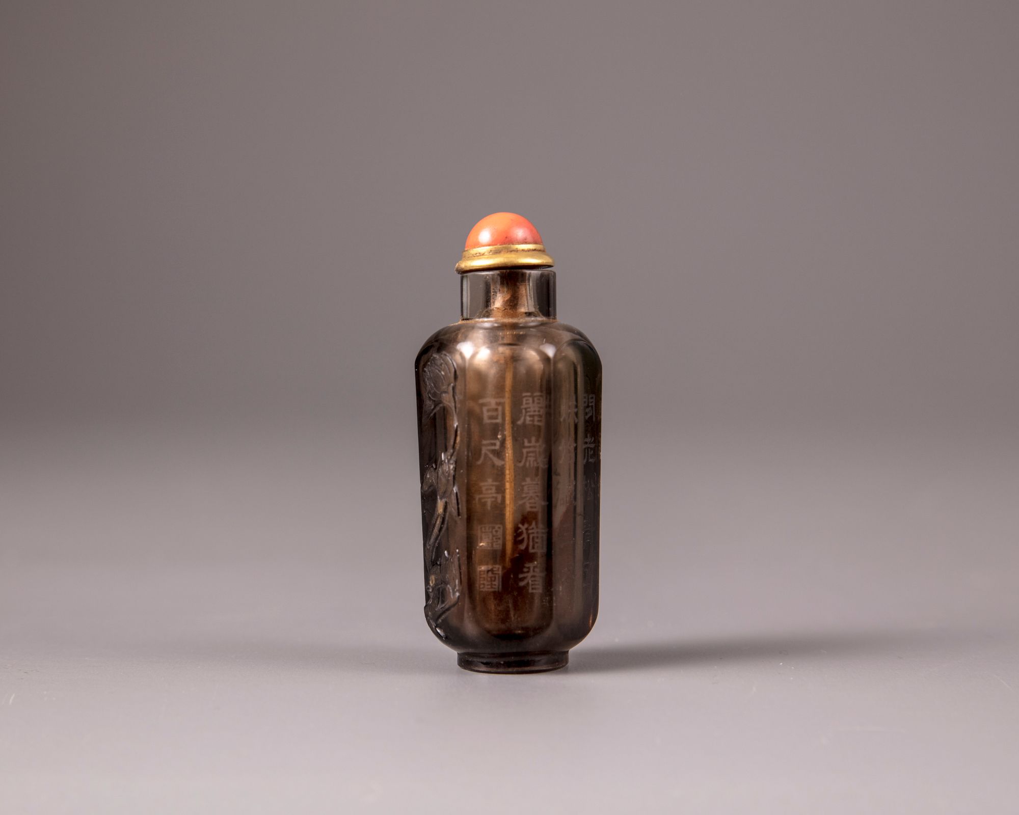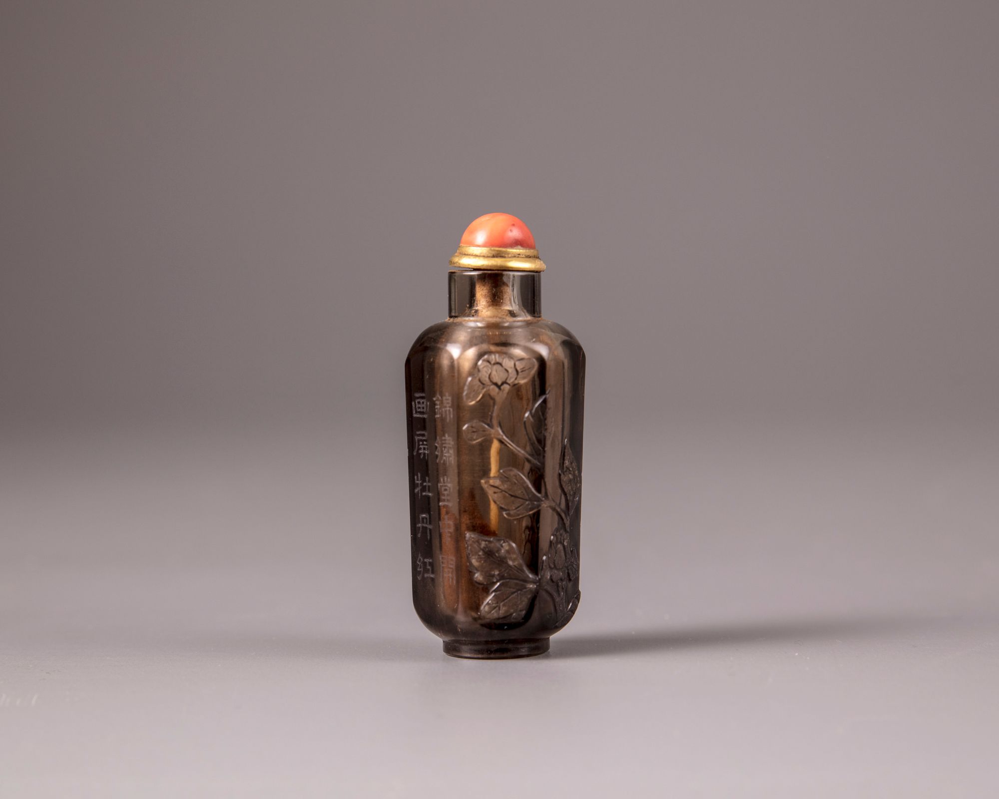 The hexagonal snuff bottle is carved in high relief with a peony and magnolia branch and and is inscribed with an excerpt from a Qianlong poem 'Green pines and peony' (cangsong mudan) with two seals reading 'Qian' and 'long'. With an apocryphal Qianlong seal mark to the base. With a metal and coral stopper, bone spoon.