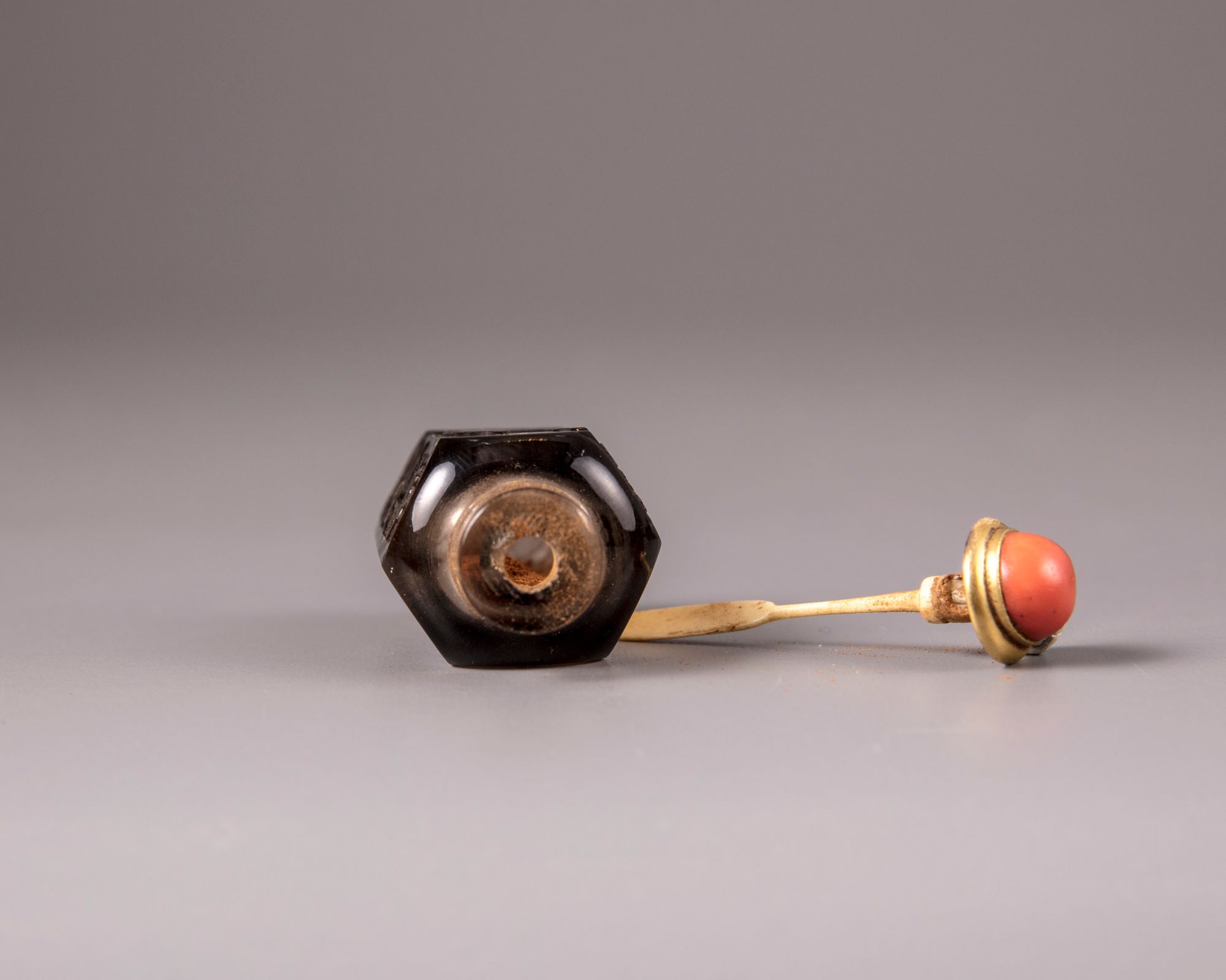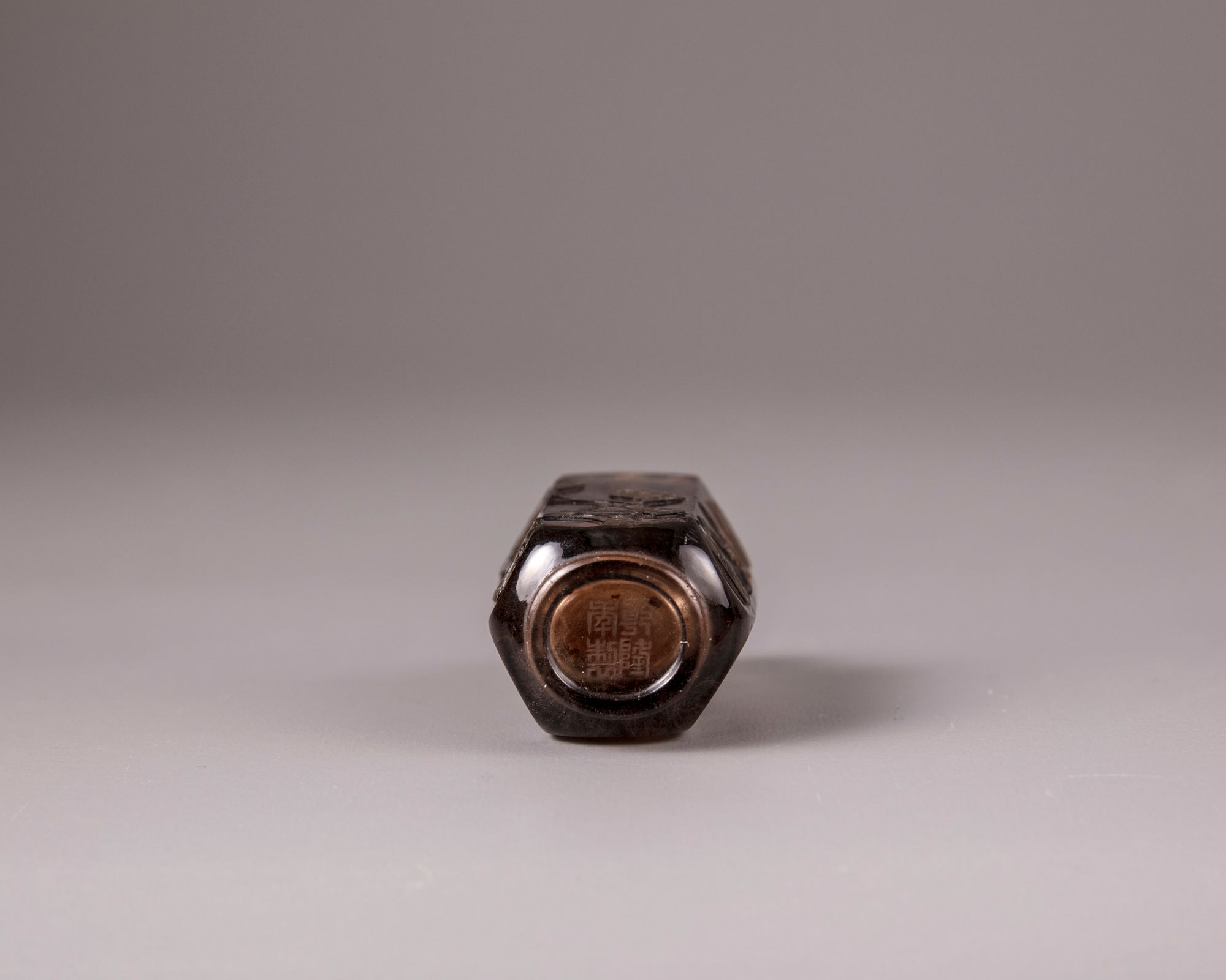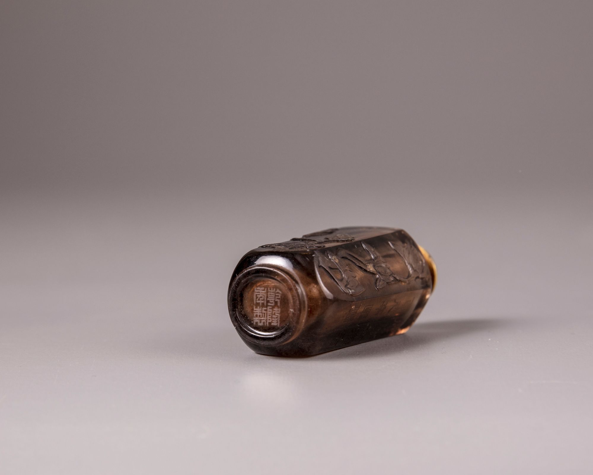 The hexagonal snuff bottle is carved in high relief with a peony and magnolia branch and and is inscribed with an excerpt from a Qianlong poem 'Green pines and peony' (cangsong mudan) with two seals reading 'Qian' and 'long'. With an apocryphal Qianlong seal mark to the base. With a metal and coral stopper, bone spoon.