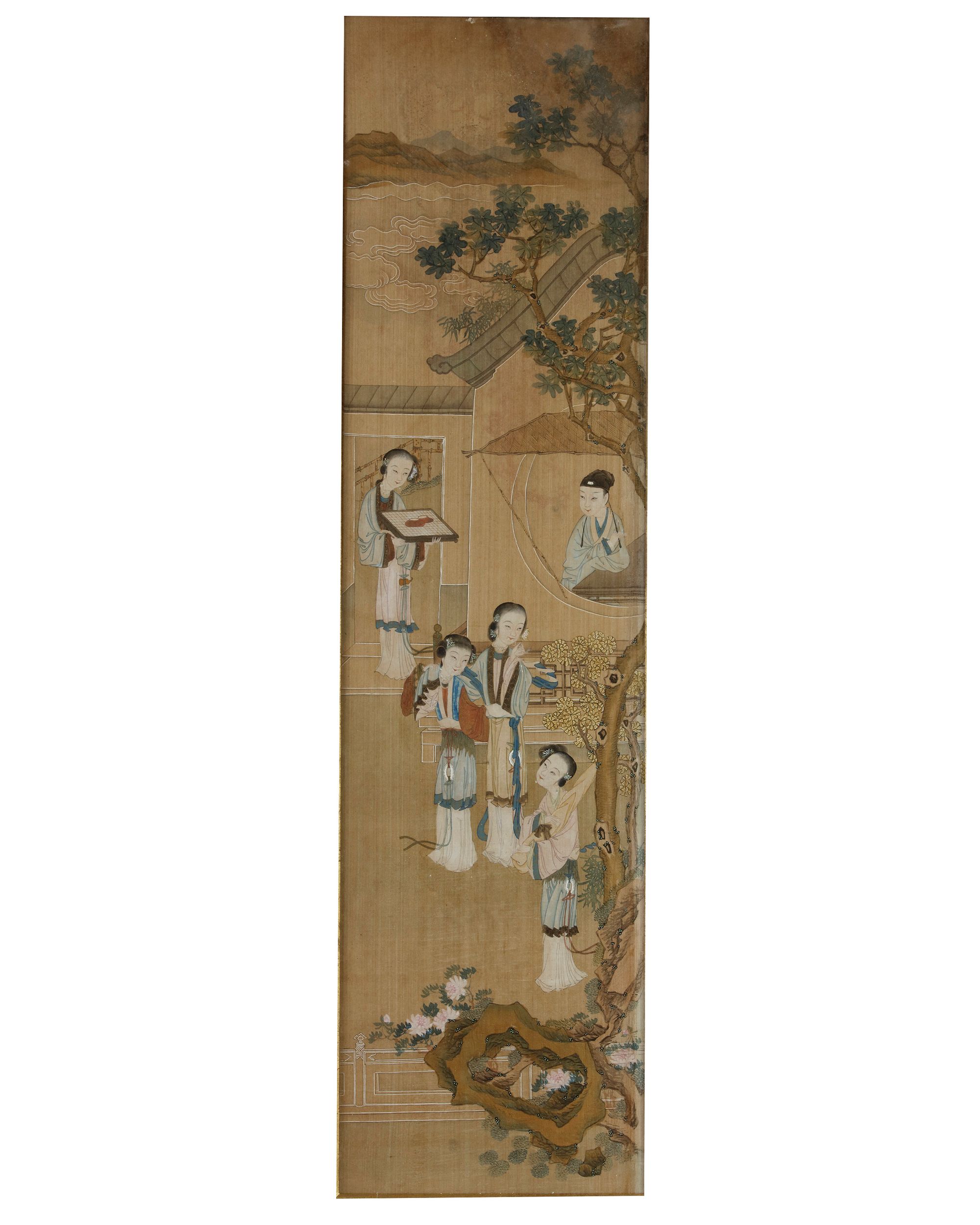 The painting depicts four ladies on a terrace, one holding a wrapped qin, another holding a chess board, all being observed by a scholar seated in a building.