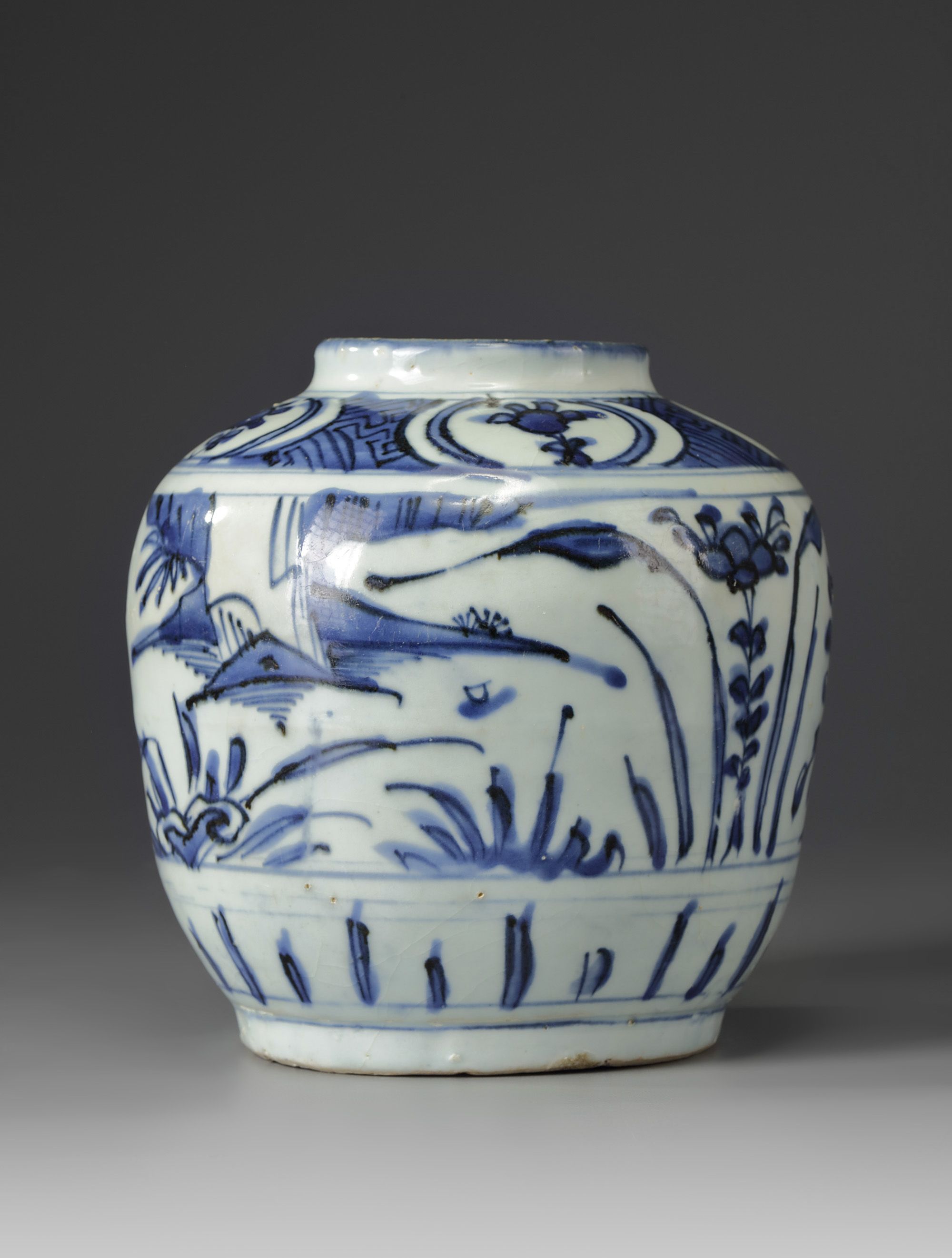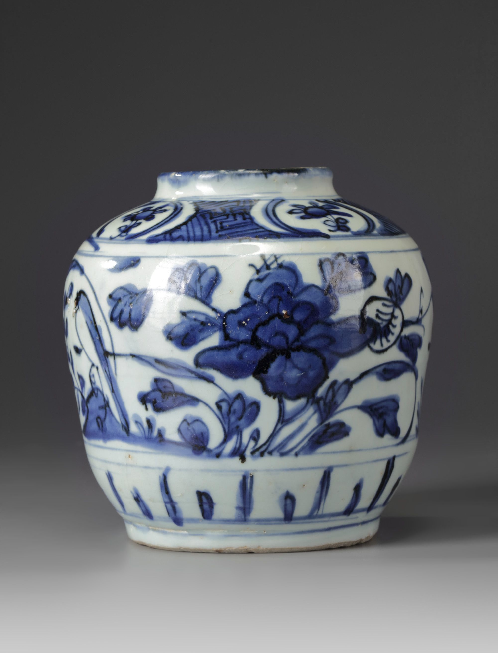 The jar is decorated with a central panel decorated with large bird and flower sprays below a geometric patterned band with further floral cartouches.