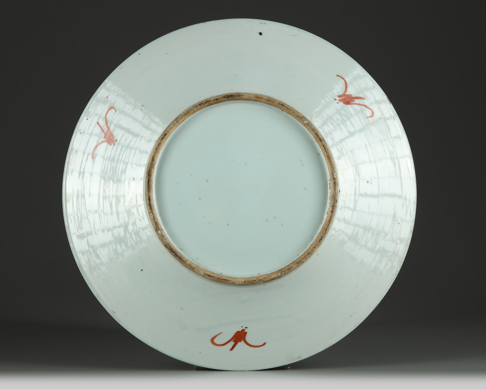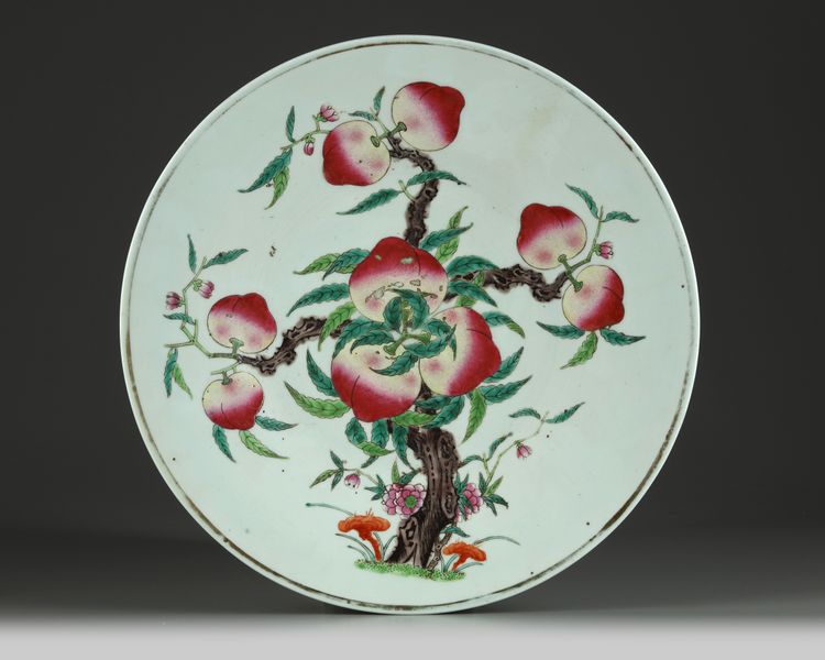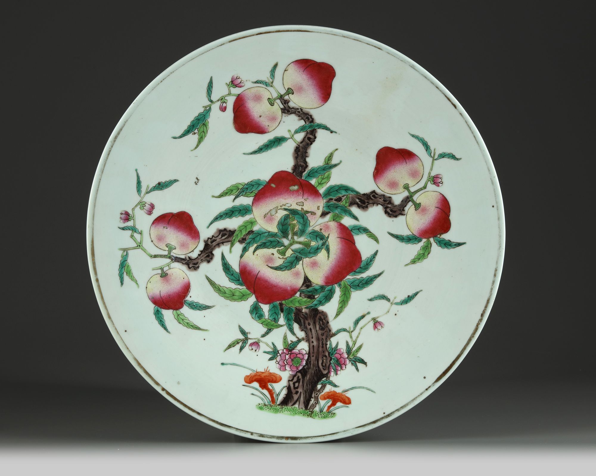 Decorated with nine peaches growing from a leafy gnarled branch accompanied with lingzhi and flower blossoms 3 iron red bats to the reverse