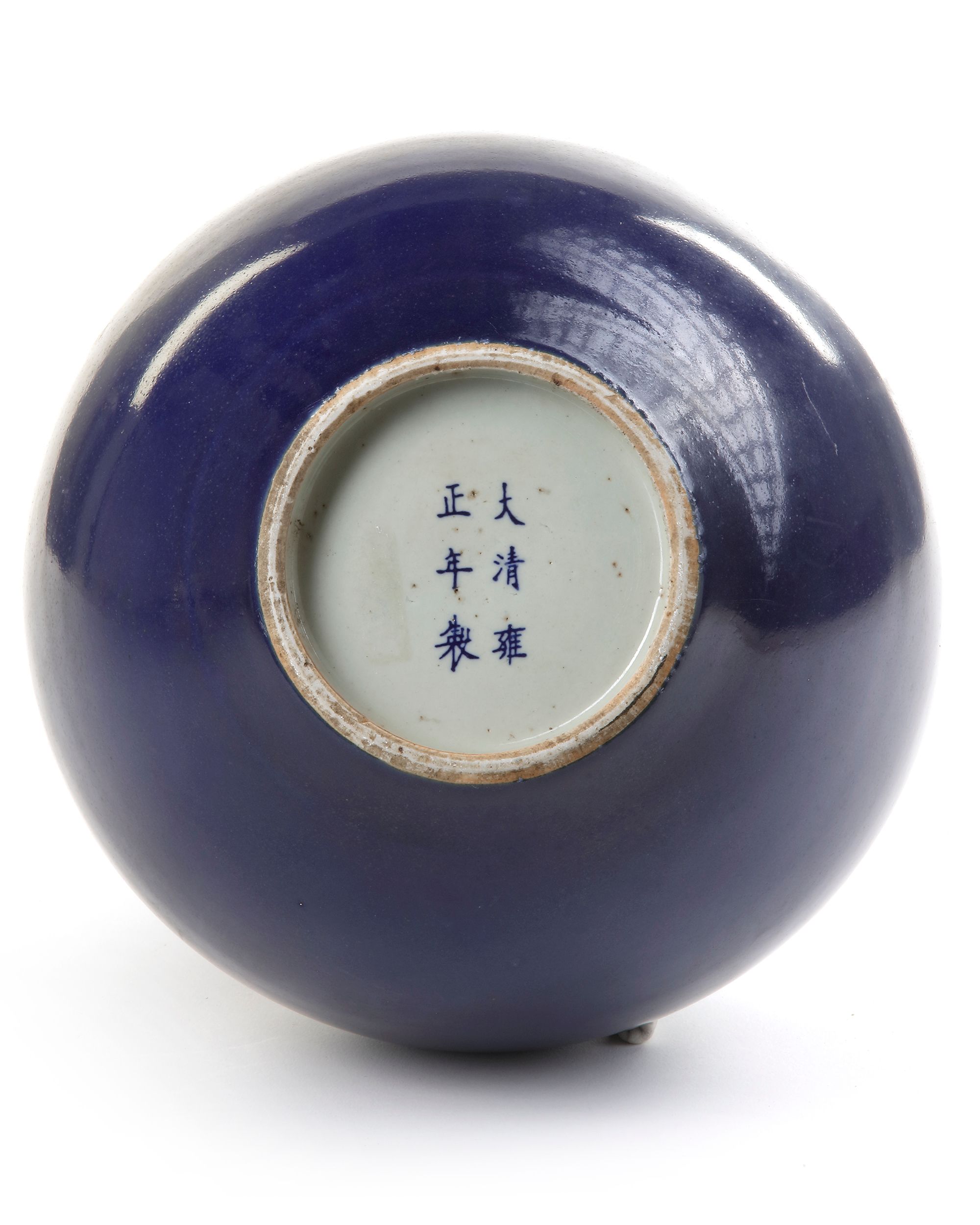 The vase with a globular body tapering to the tall neck and is covered on the exterior with a dark blue glaze in contrast to the white rim and interior.The bottom with a Chinese Yongzheng six character mark.