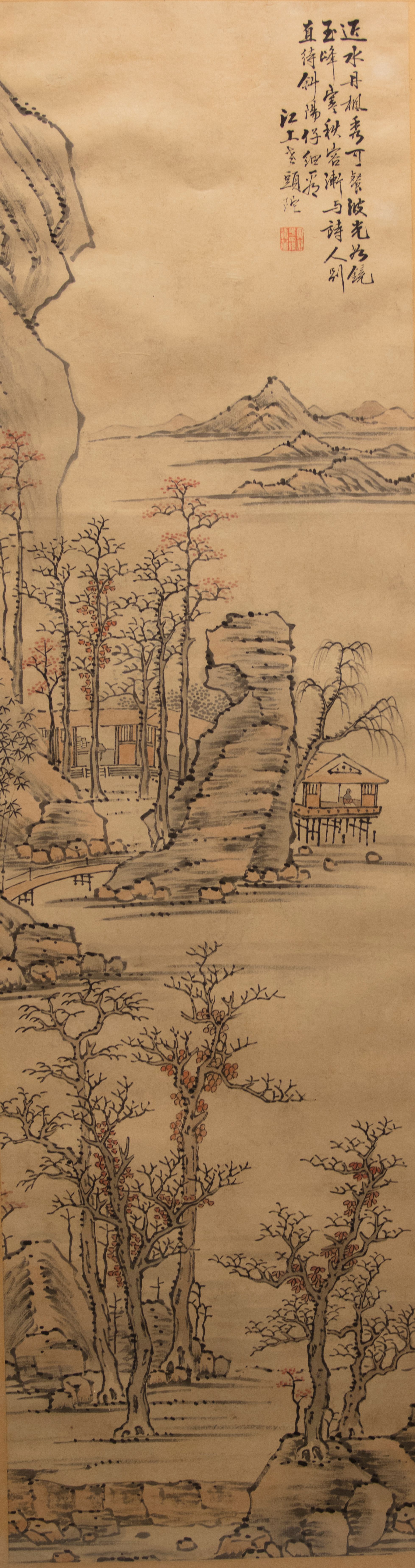 Ink and colour on paper. A painting depicting houses and trees beside a lake between mountains. Inscribed with one seal of the artist.