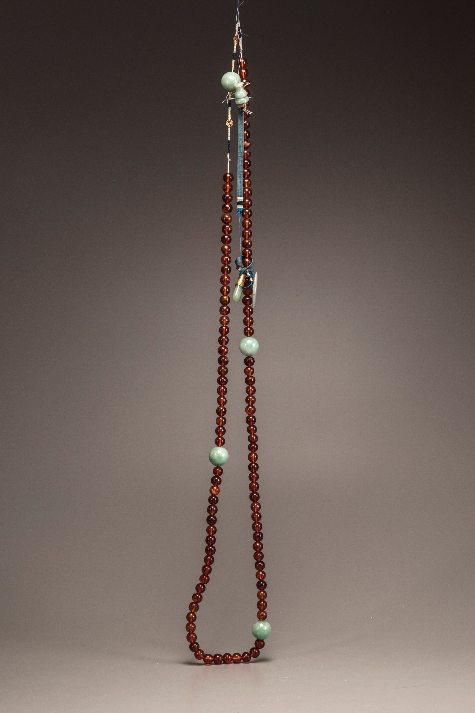 The necklace is composed of one hundred and eight amber beads of honey tone separated by three jadeite 'Buddha's head' beads. The lower part is decorated with a double-gourd and a jadeite bead (fotouta), and a flat oblong jadeite plaque ('beiyun') suspending a green jadeite drop.