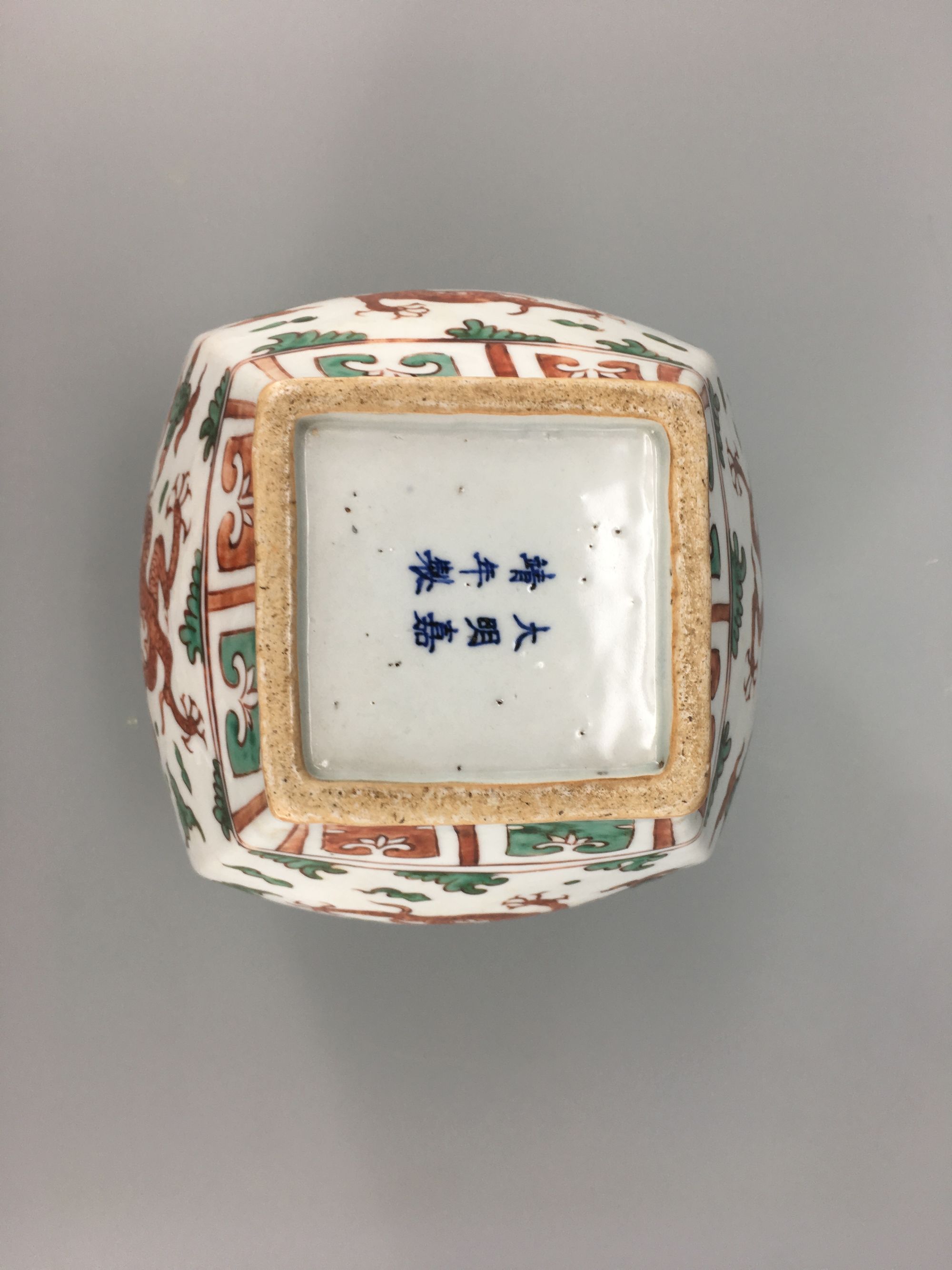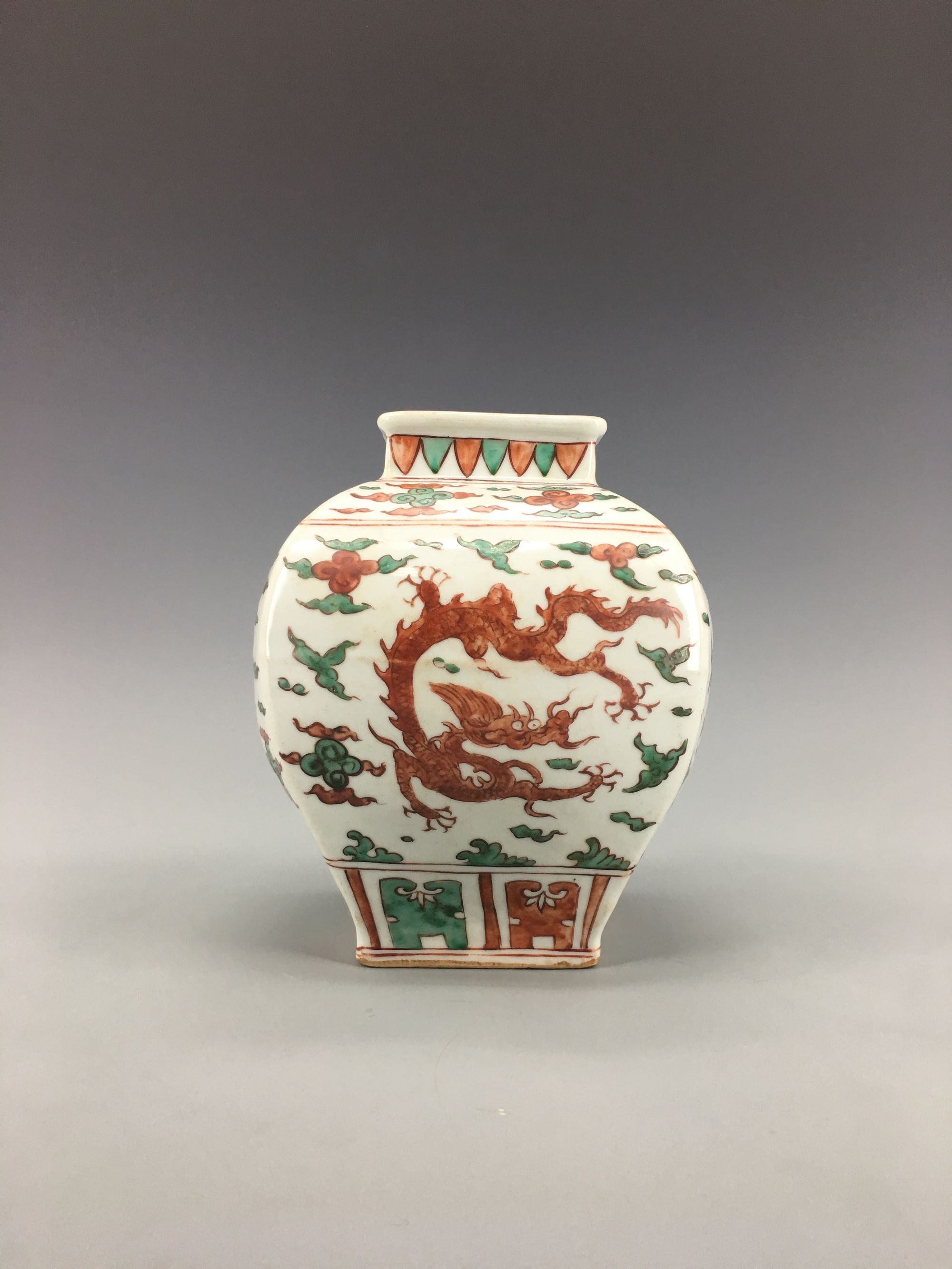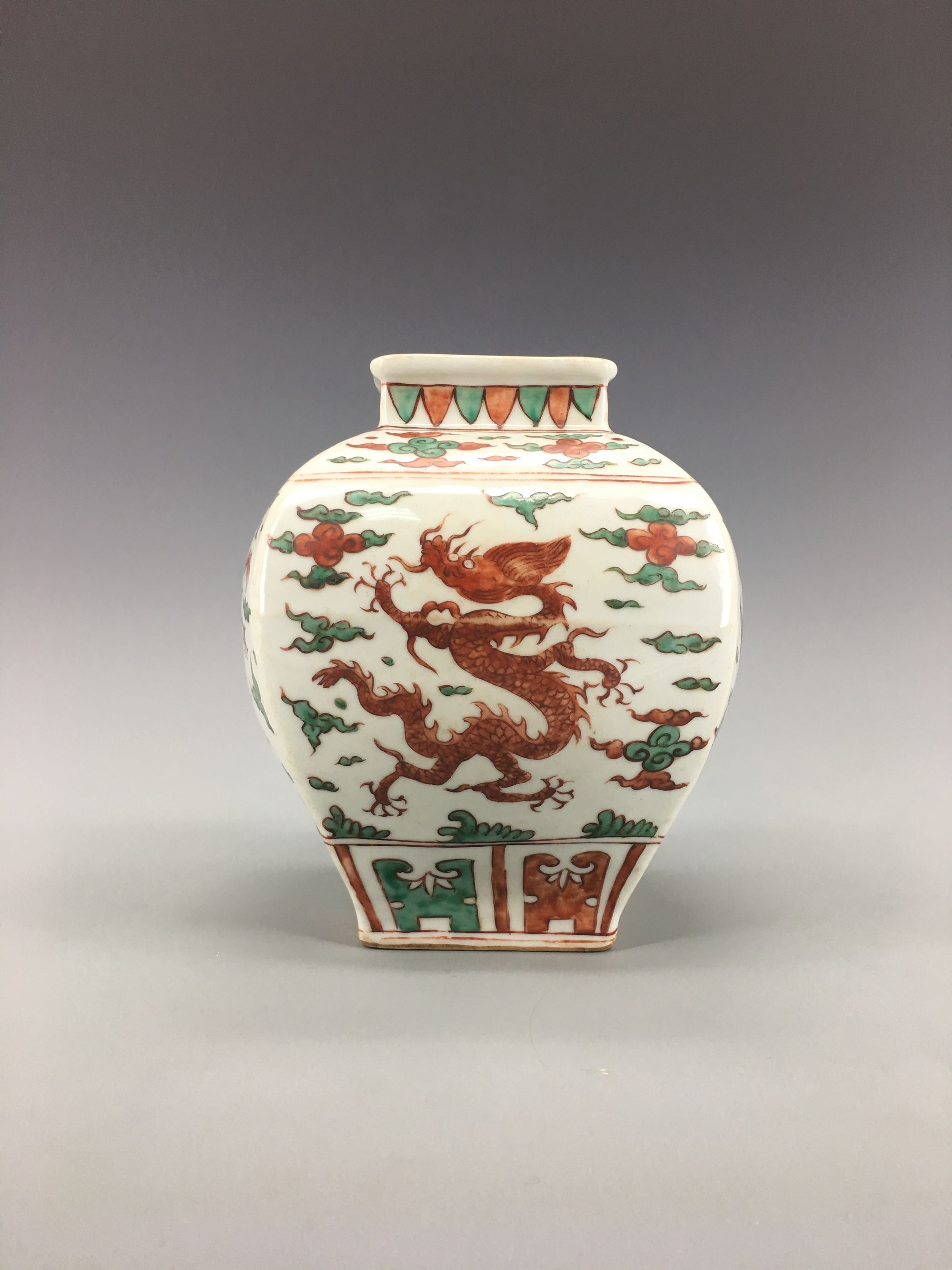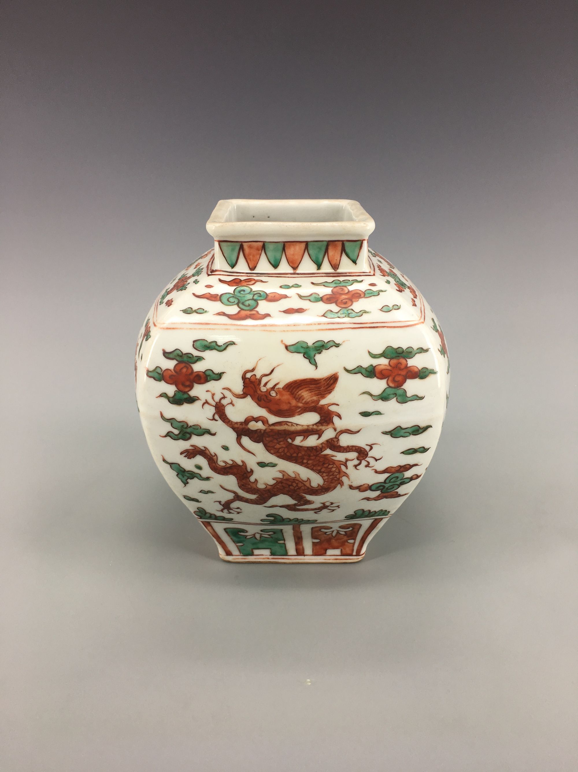 The jar is of square-section, each side is decorated with a dragon amongst cloud scrolls, all between a band of petal lappets to the rim and a lappet band to the foot. An apocryphal Jiajing six-character mark to the base.