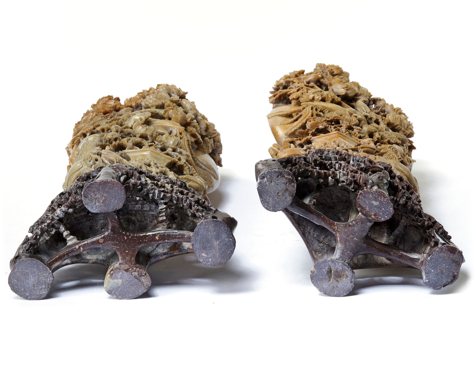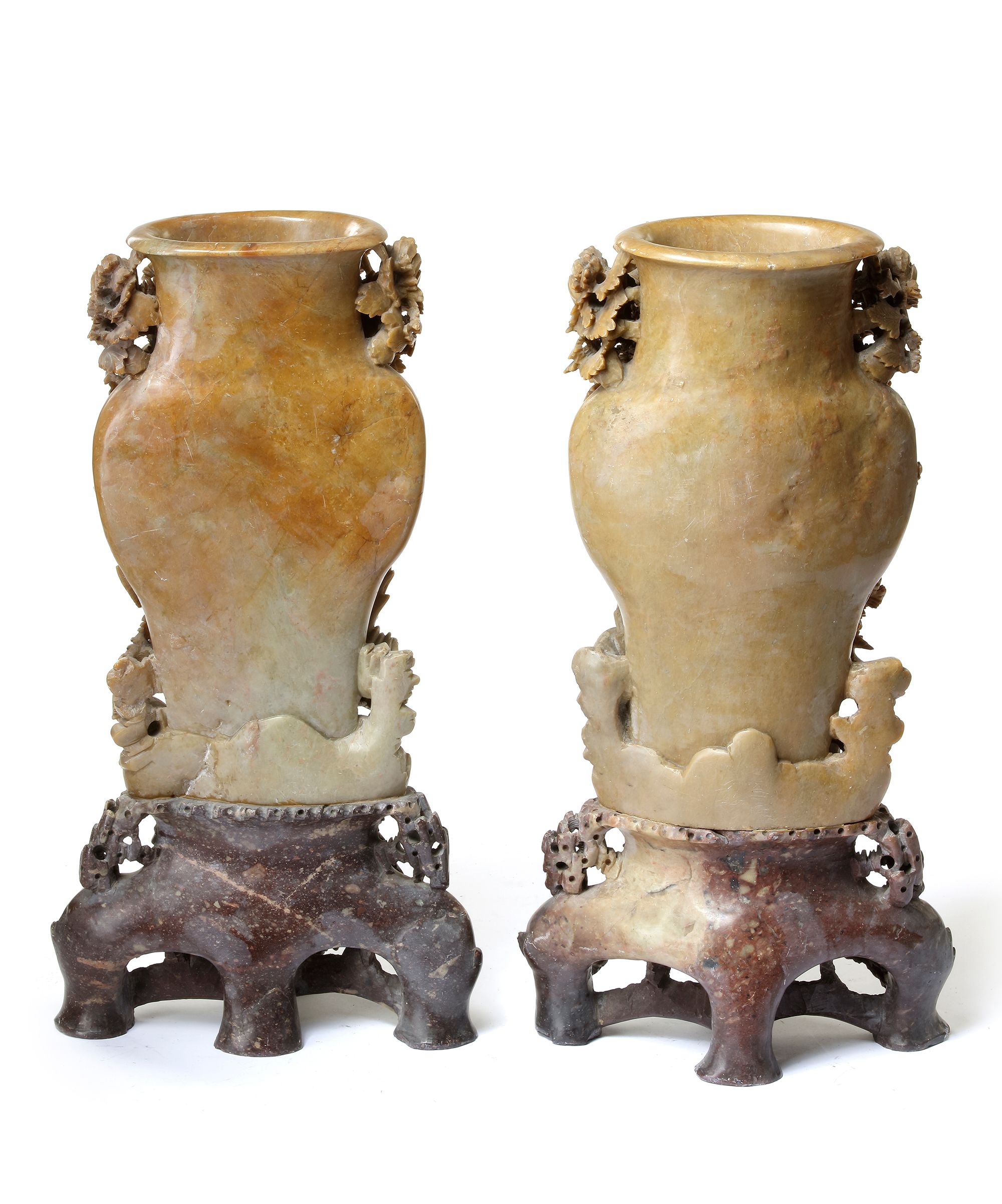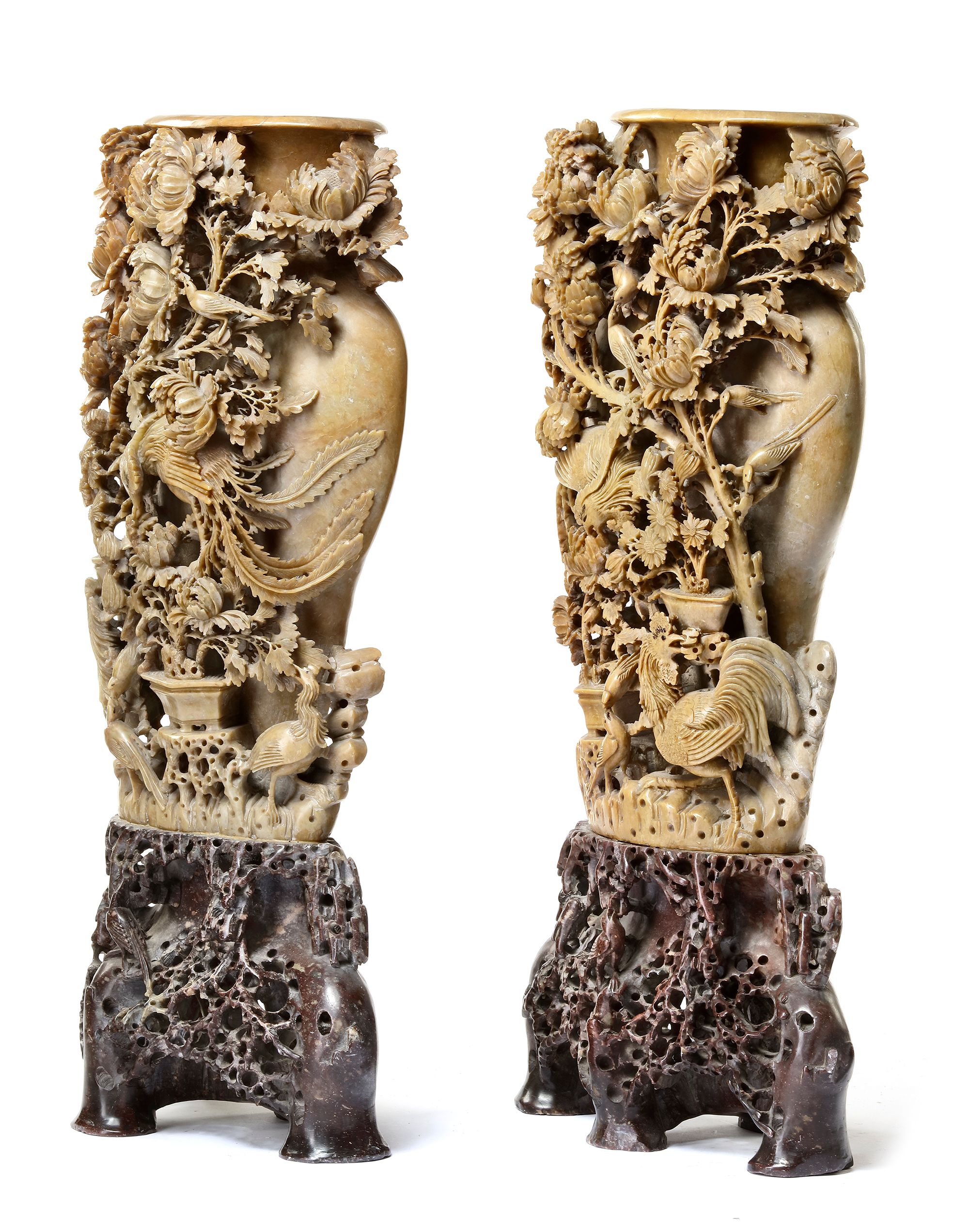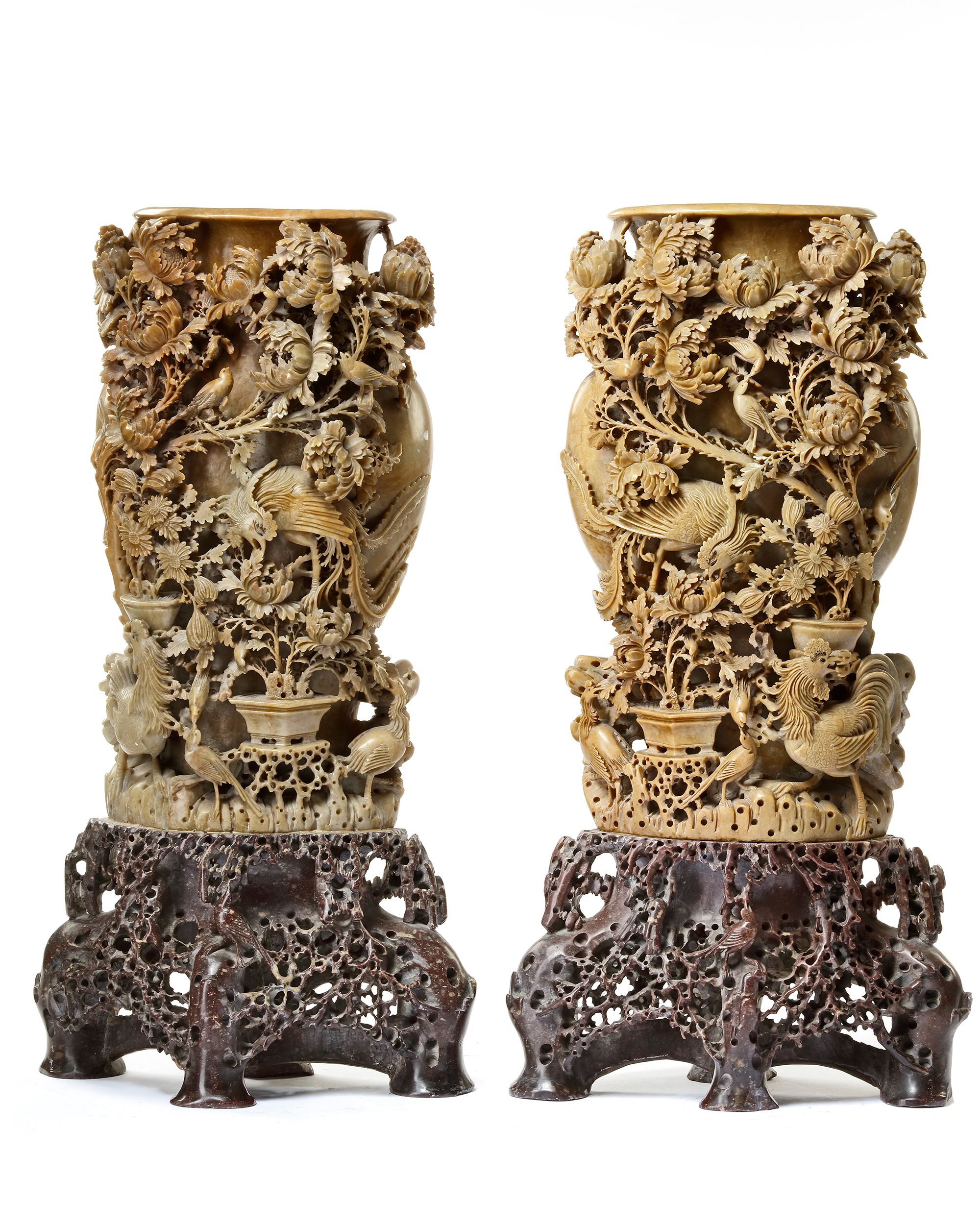 Two soapstone vases on a stand, carved around the sides in high relief through the variously coloured layers of the stone with different birds amongst prunus and chrysanthemum branches growing from a censer and ornamental rocks. H: 48.5 cm. Width: 19 cm.