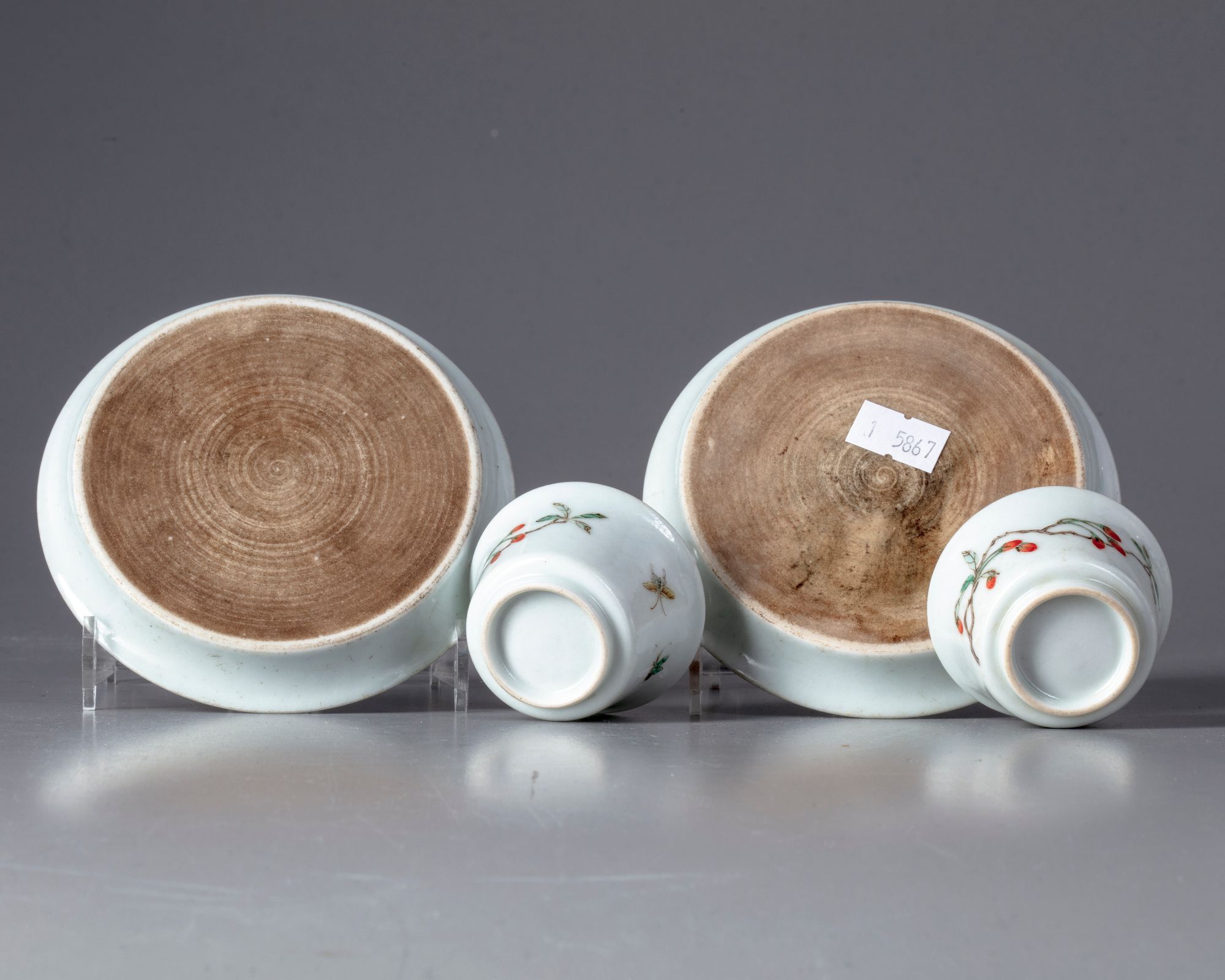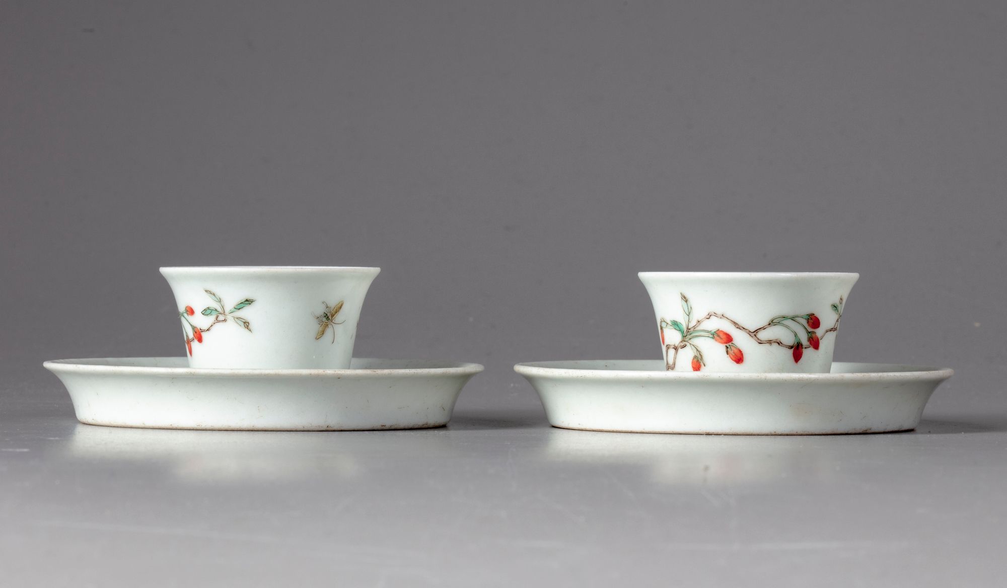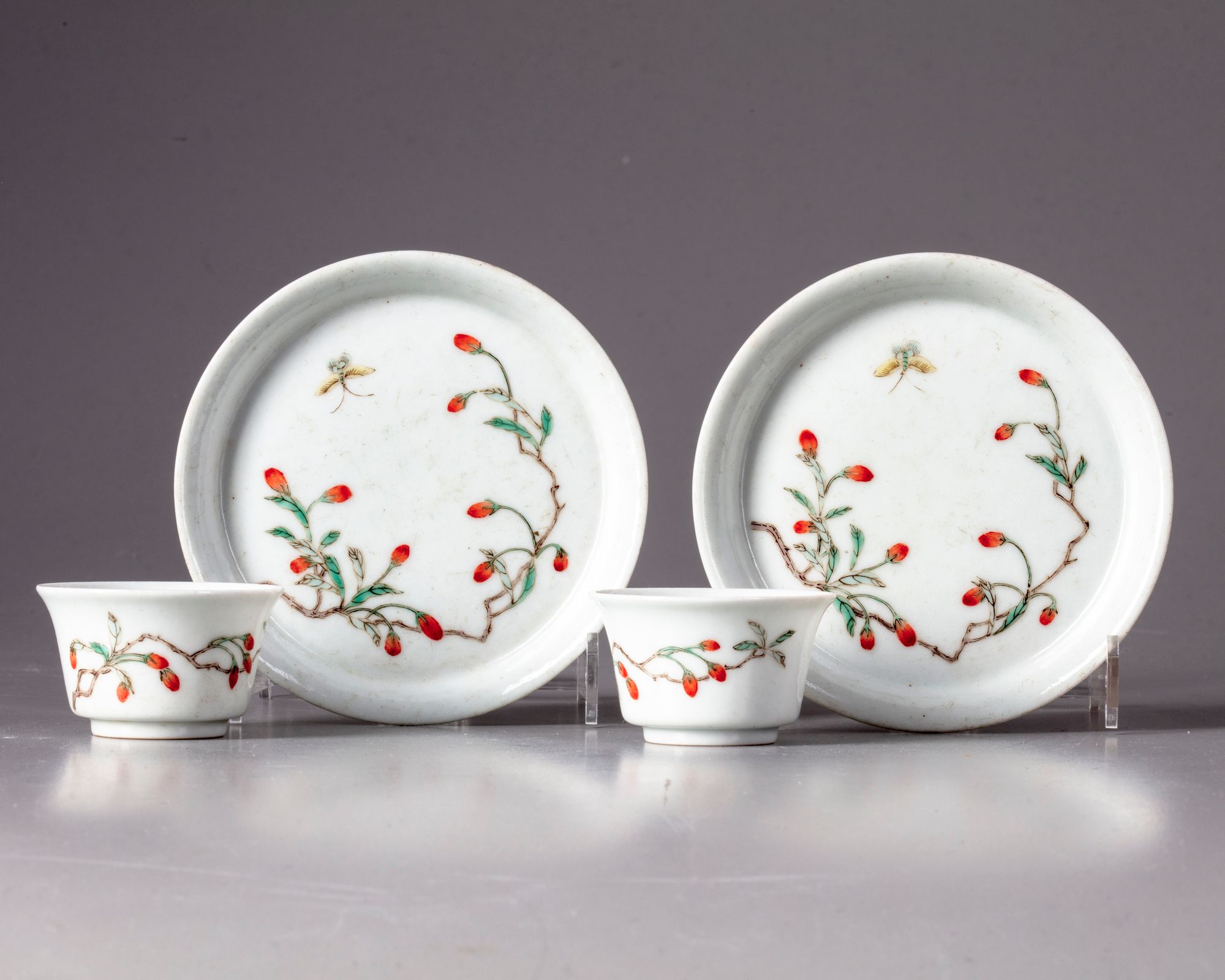 Two Chinese porcelain cups and saucers, decorated in famille verte enamels with butterflies flying over a flowering branch.