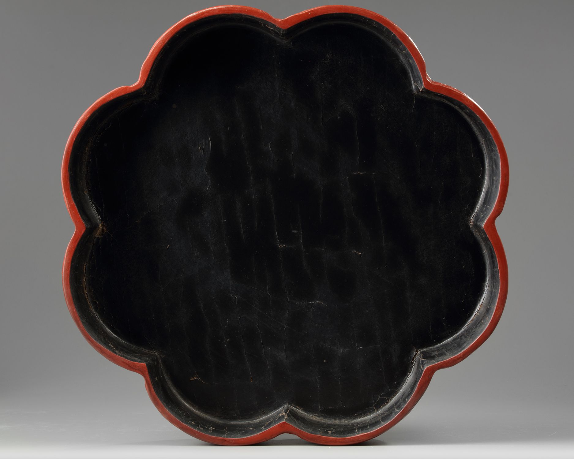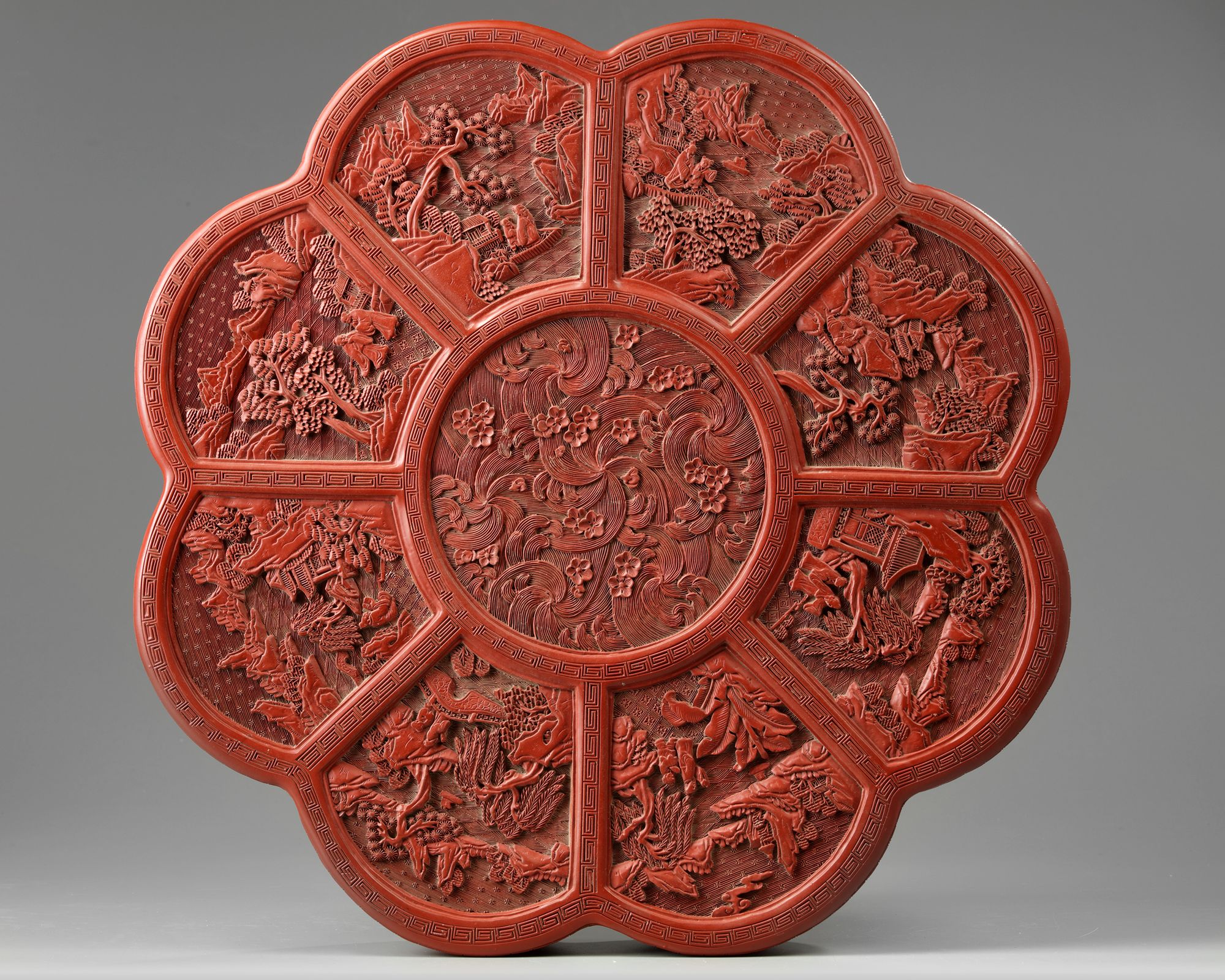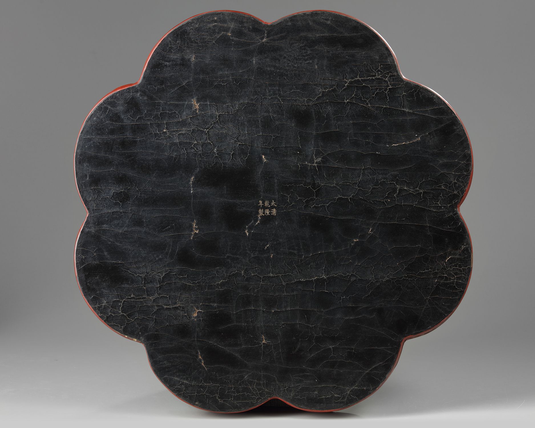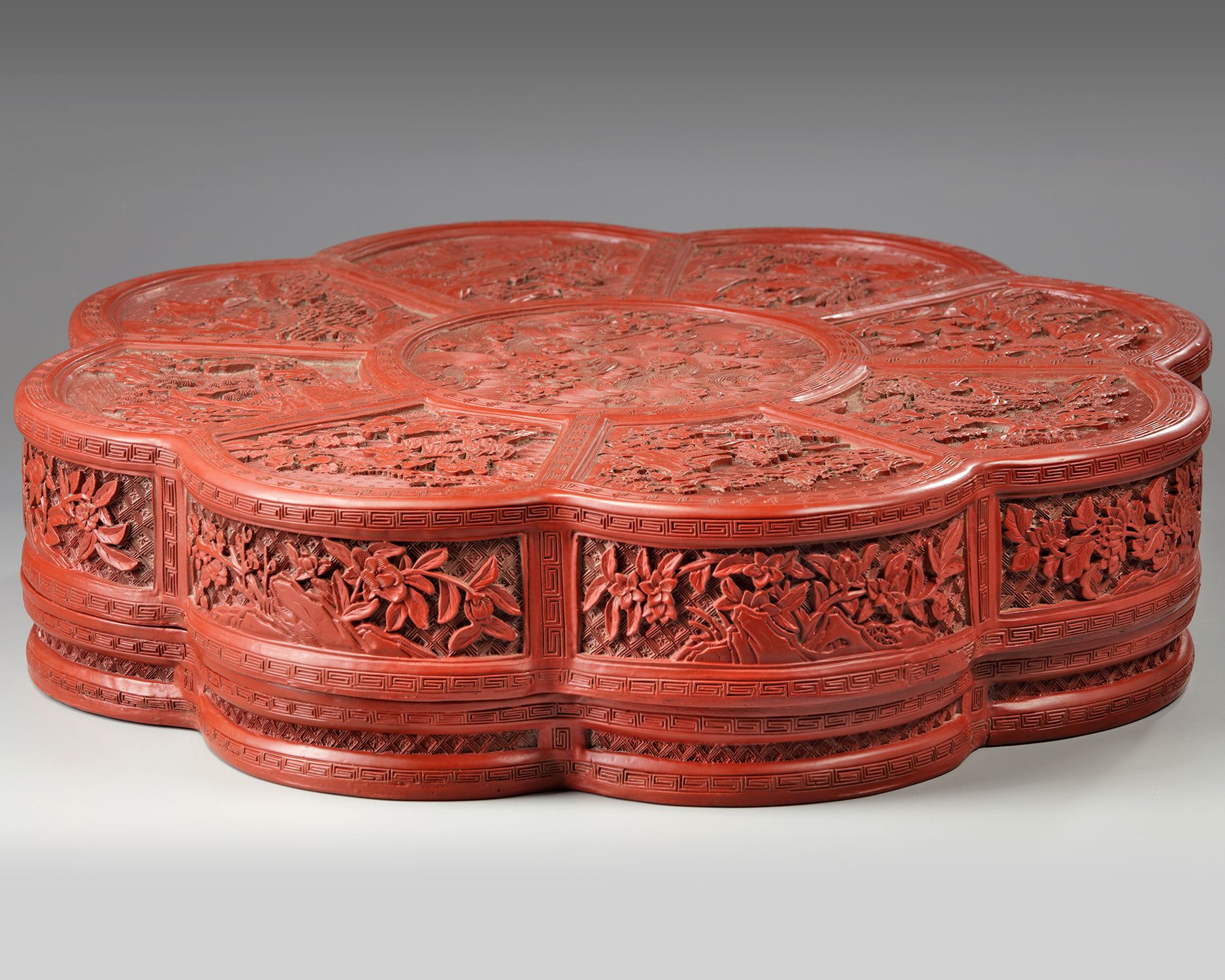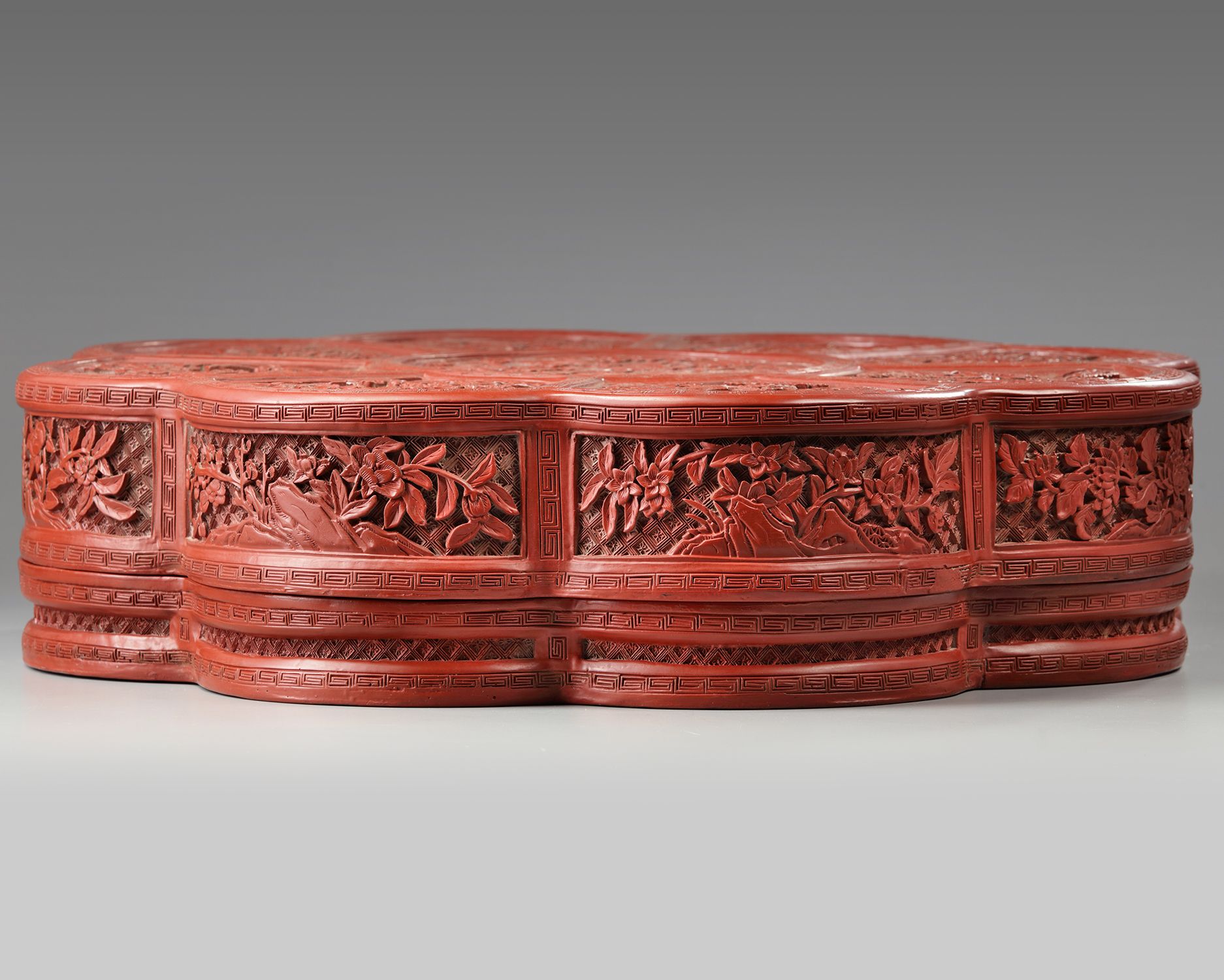 The cover is decorated with a central circular panel decorated with prunus floating in tumultuous waves, surrounded by petal-shaped panels enclosing scholars and landscapes. The sides of the box cover is decorated with flower and rock panels. The base with an apocryphal Qianlong mark.