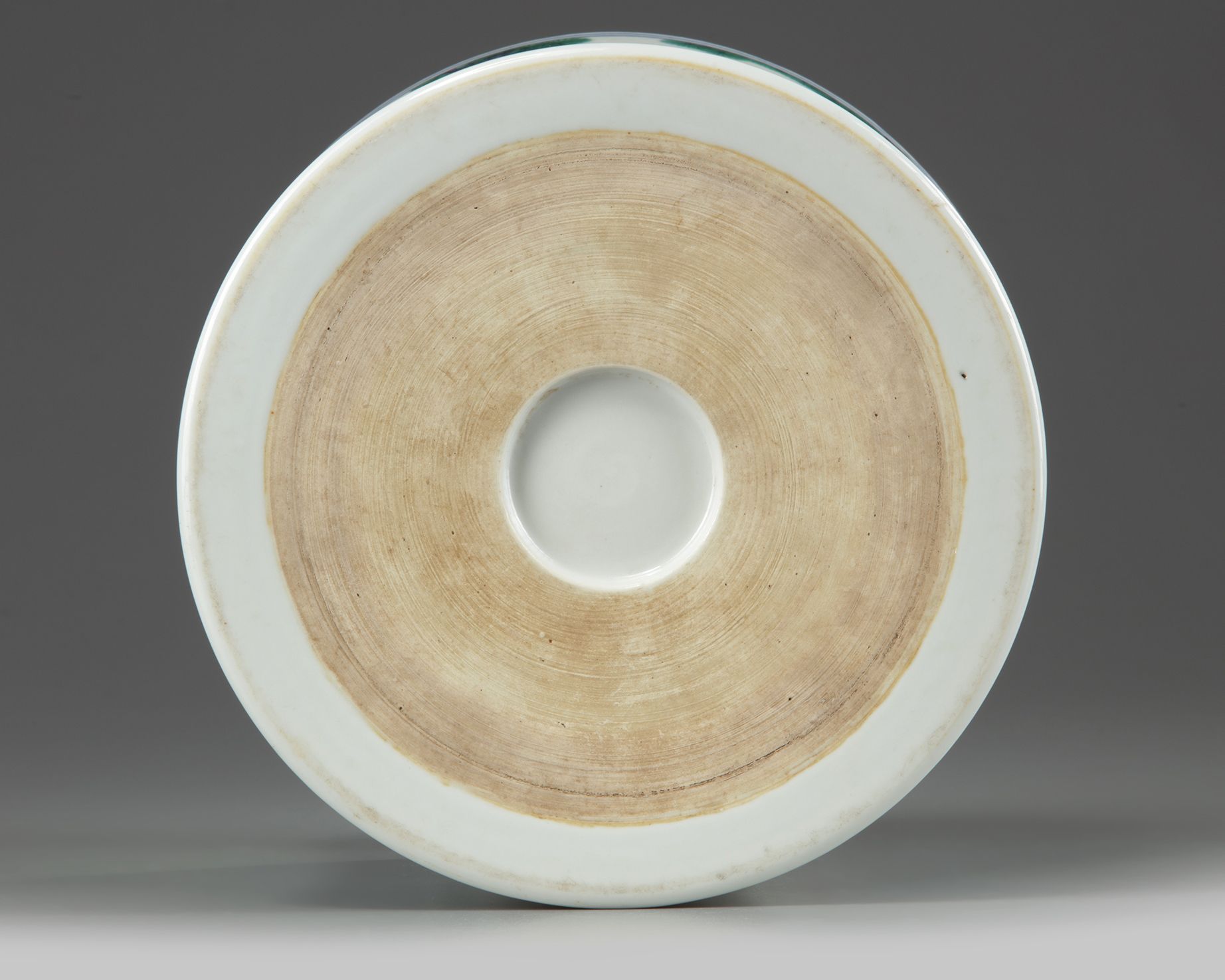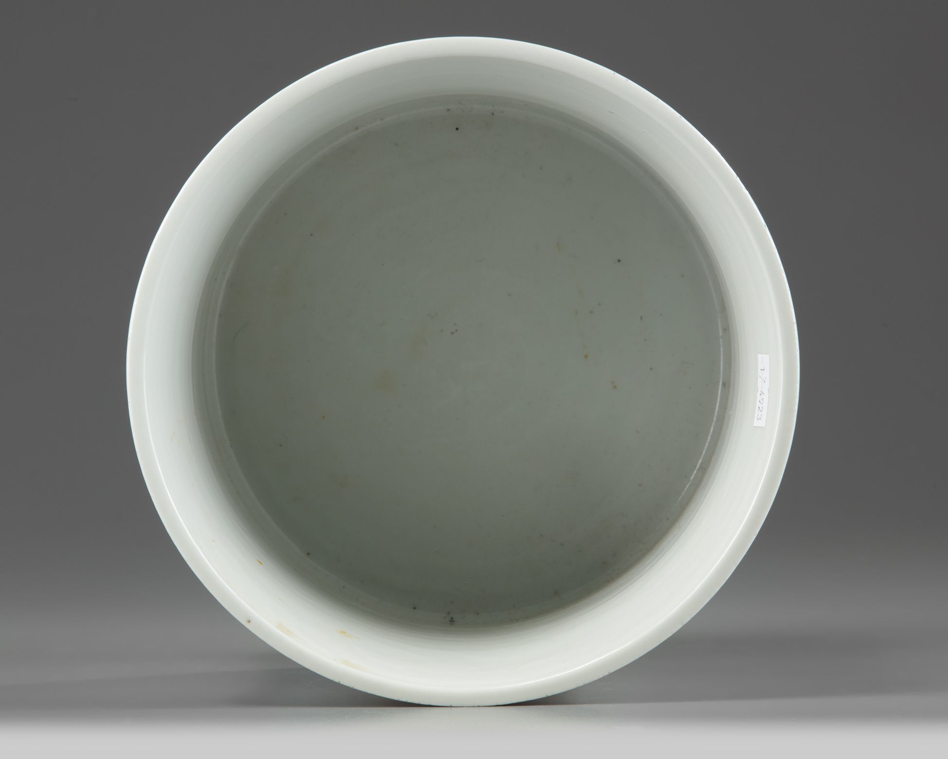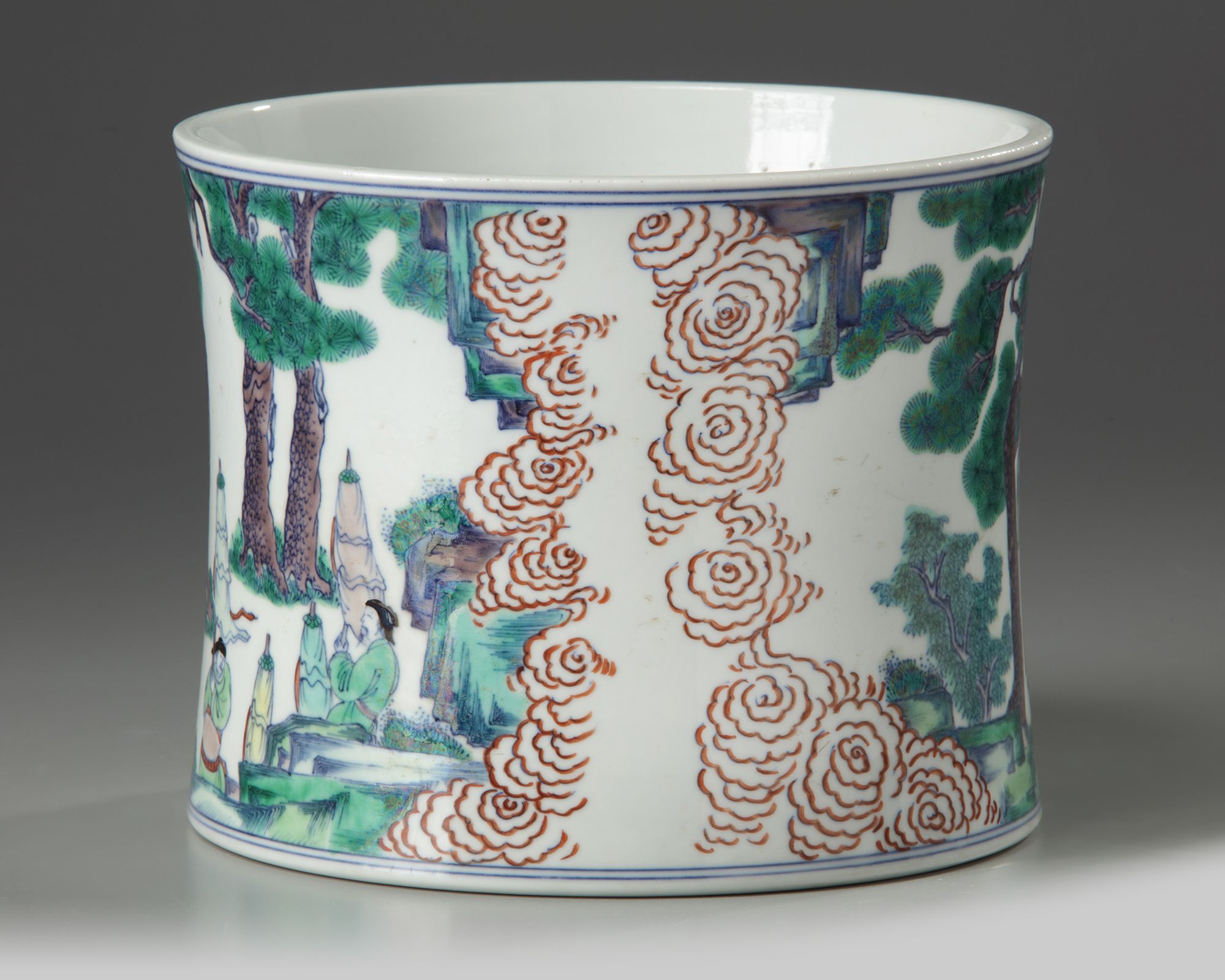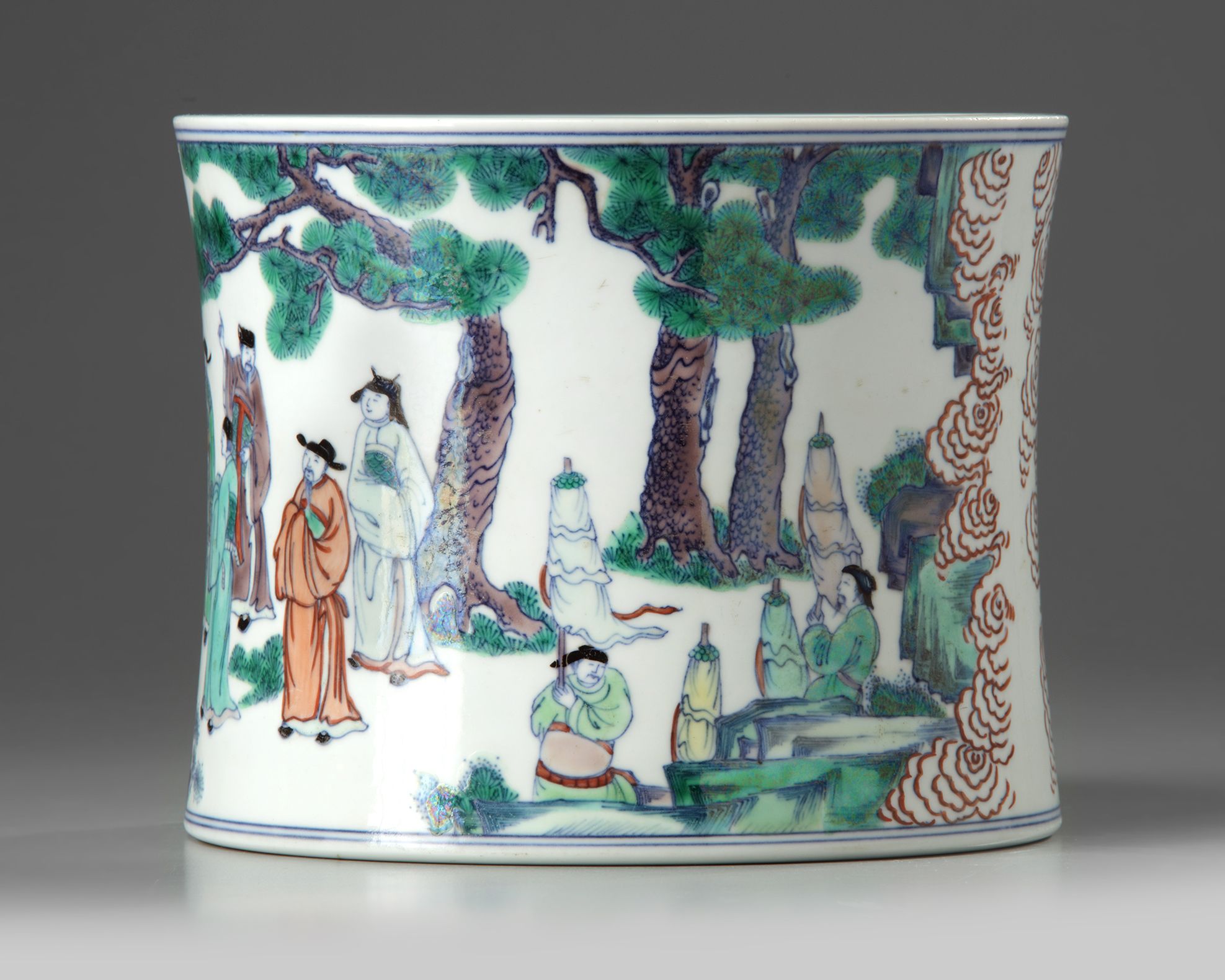 The slightly waisted brush pot is decorated with a monk with further monks before scholars and figures holding parasols, all below pine trees.