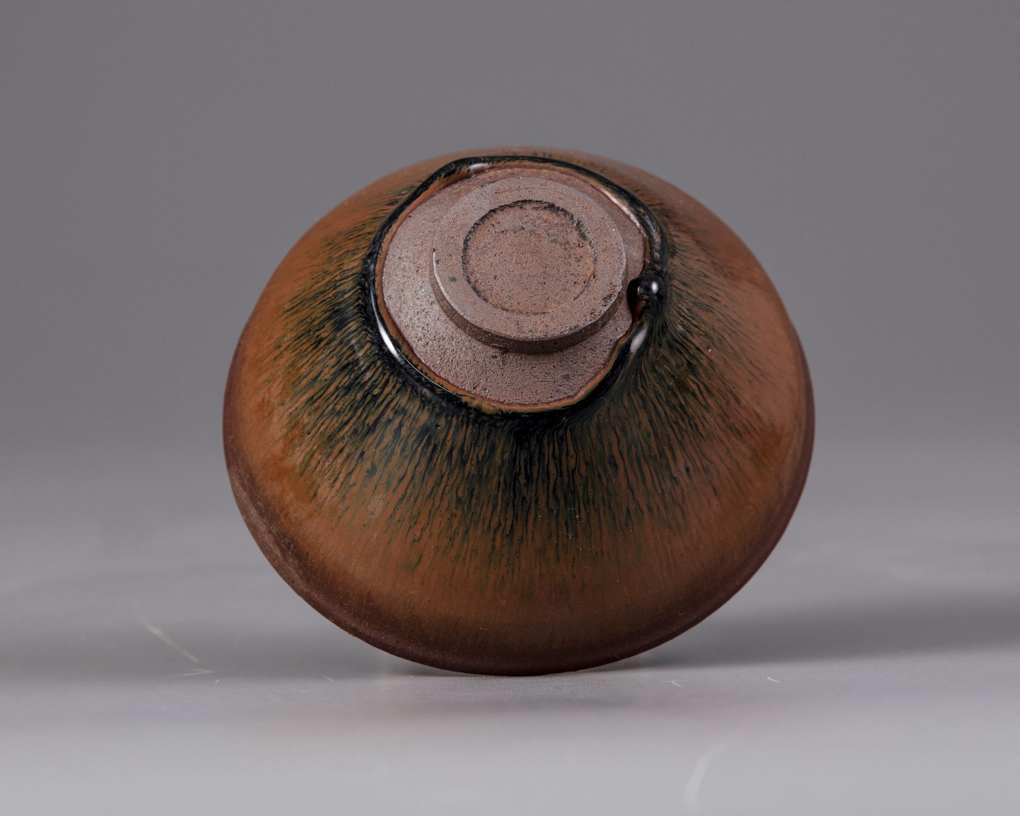 The bowl is decorated with a dark, lustrous glaze with brown russet streaks trailing to the centre imitating the fur of a hare.