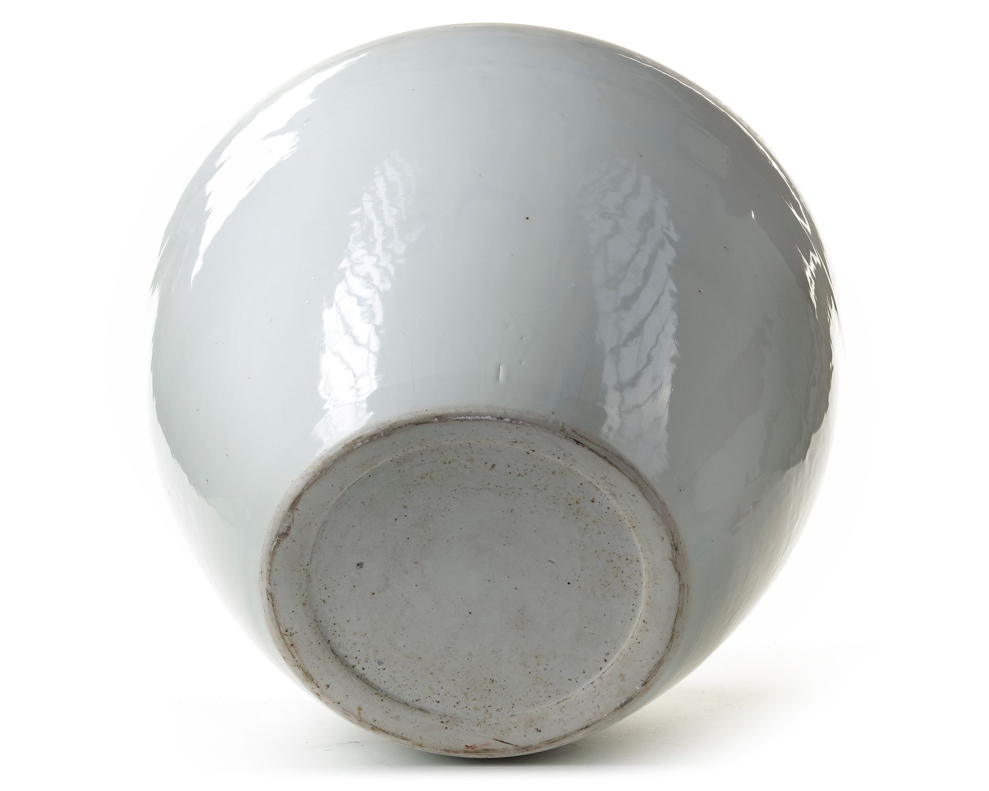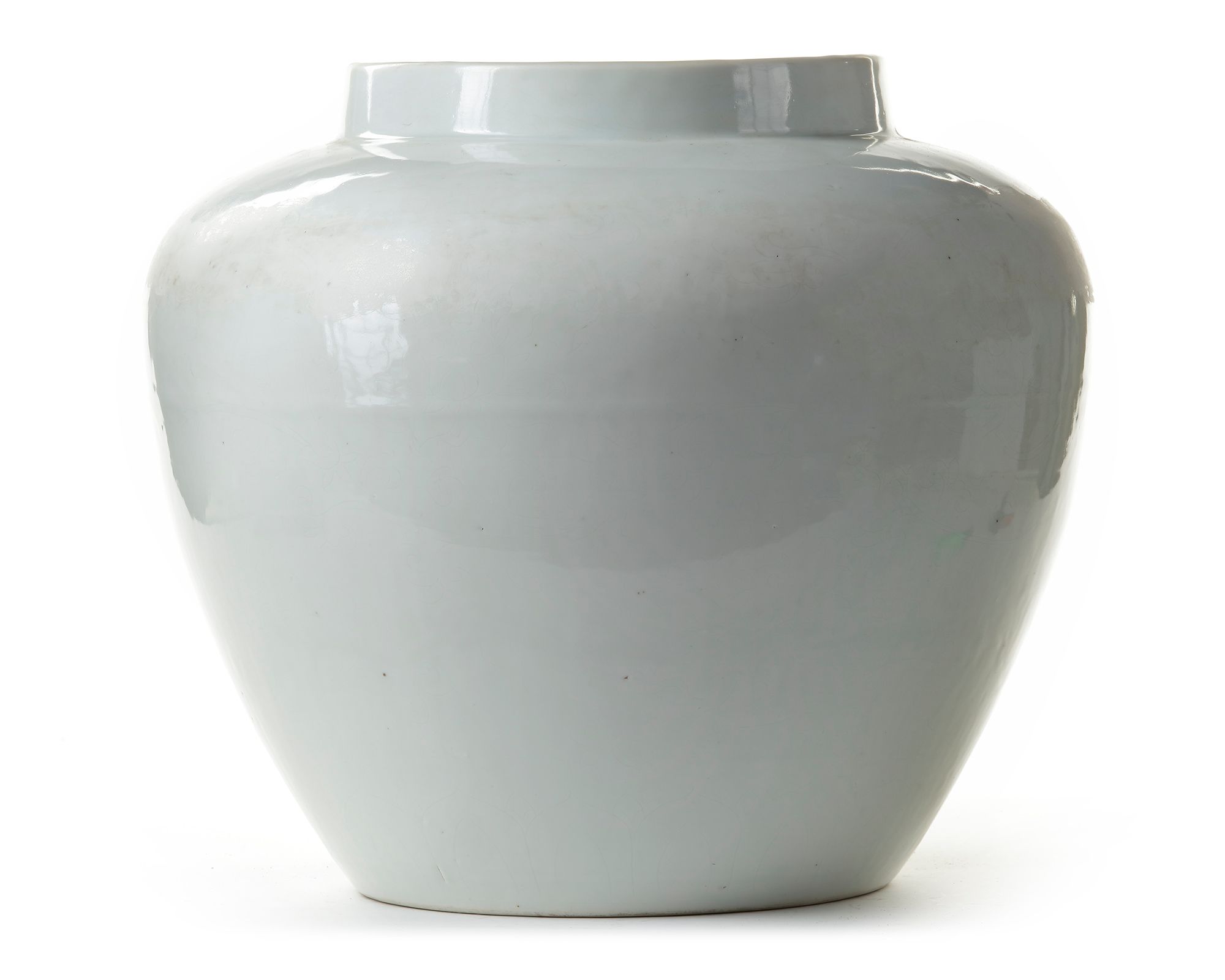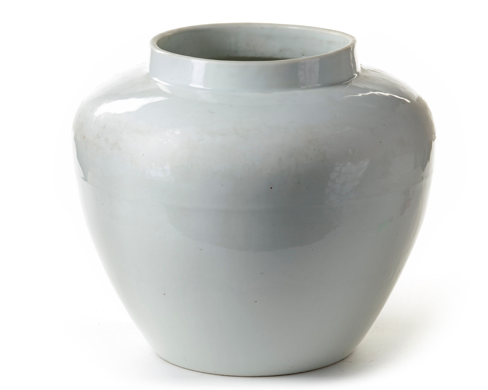 The large vessel is decorated with incised with scrolling lotus. The vase is covered overall in a translucent bluish-white glaze.