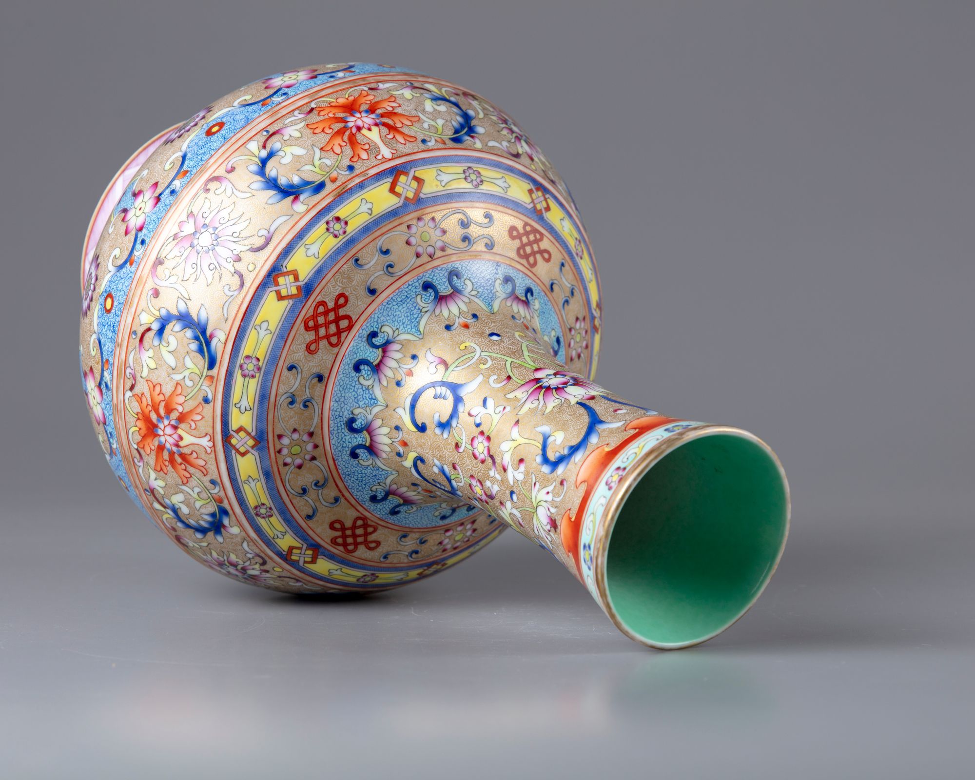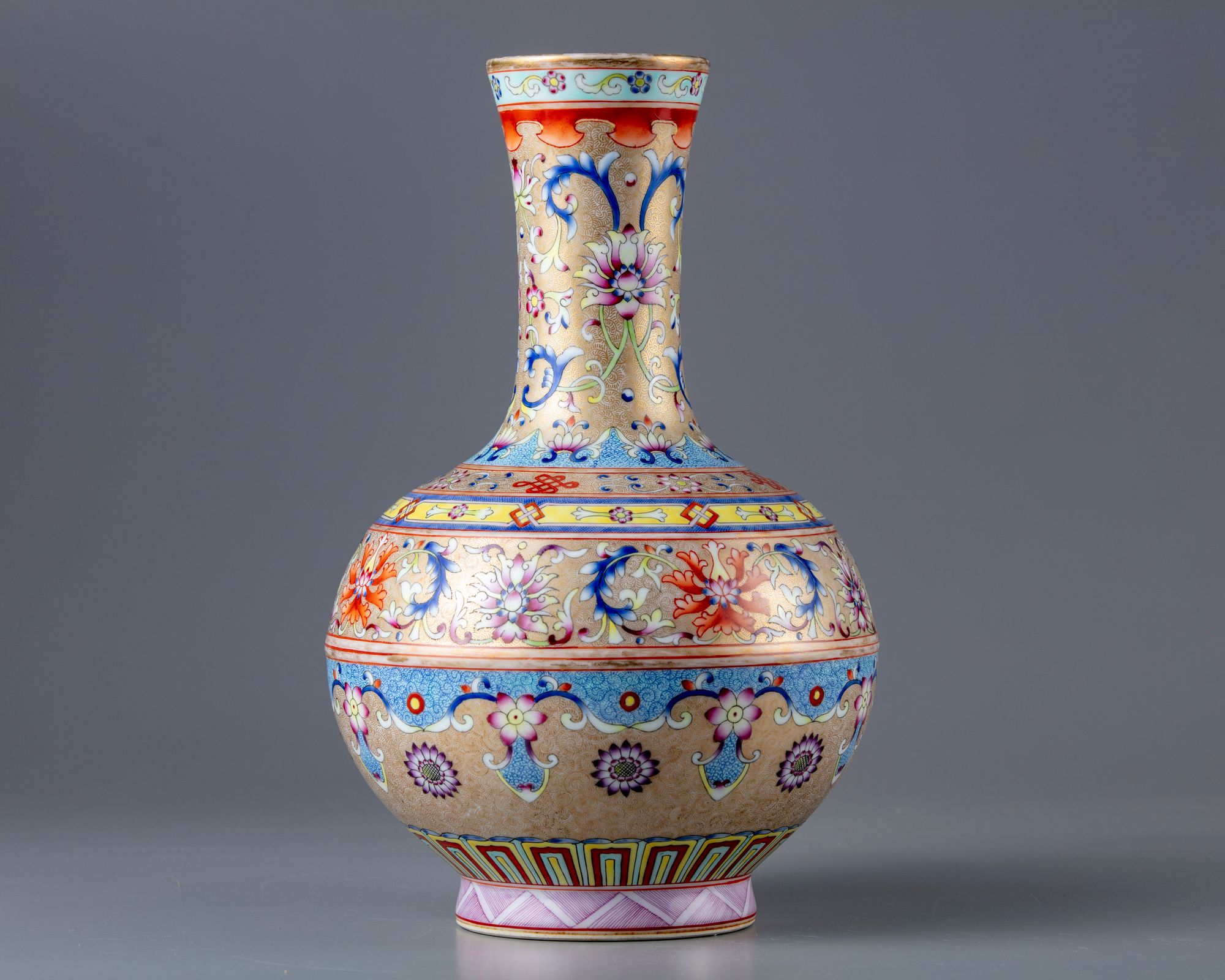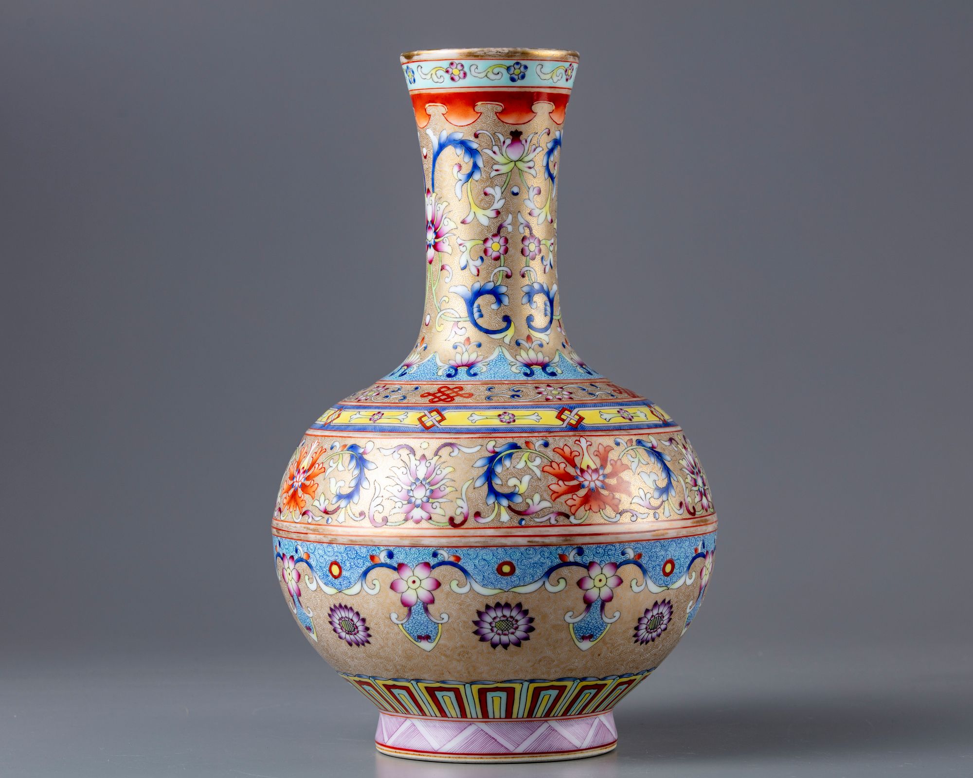 The bottle vase is decorated to the neck with two large lotus heads ,buds and flower sprays. The body with bands contains lotus heads ,flowers and foliage, above a lappet border to the base . All on a gilt ground finely engraved with dense sgraffiato feathery arabesques. The bottom with a Qianlong seal mark on a green turquoise ground.