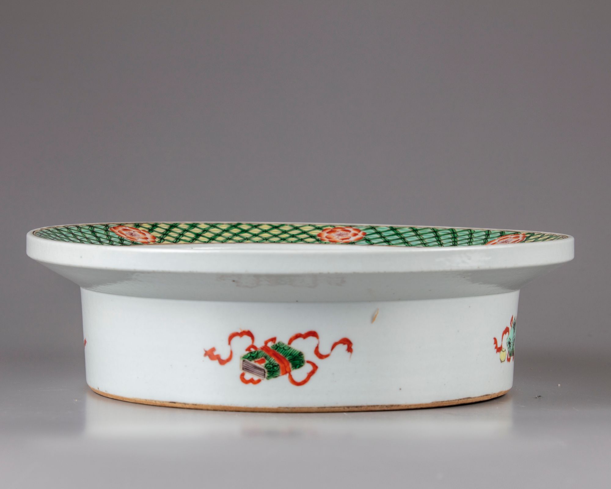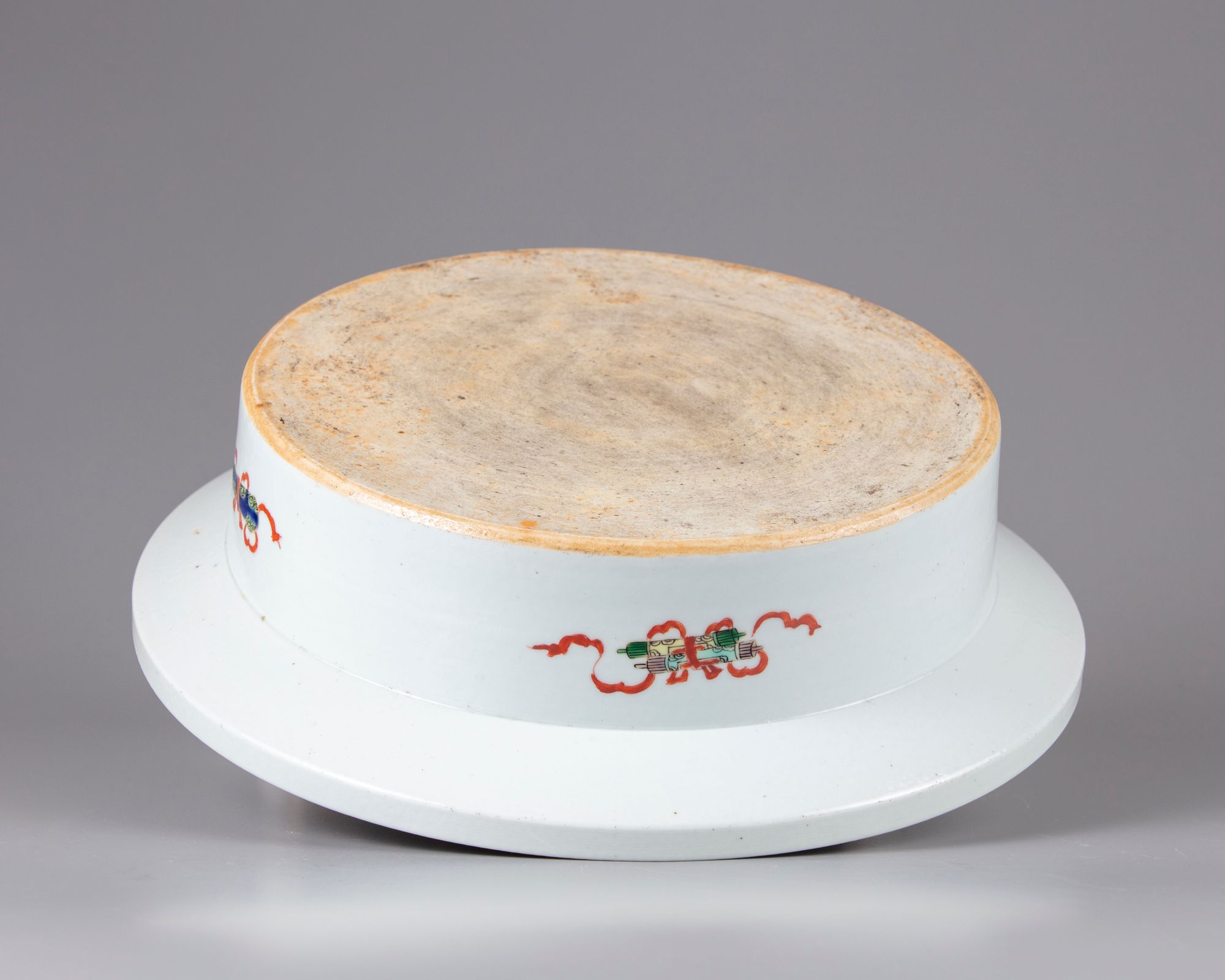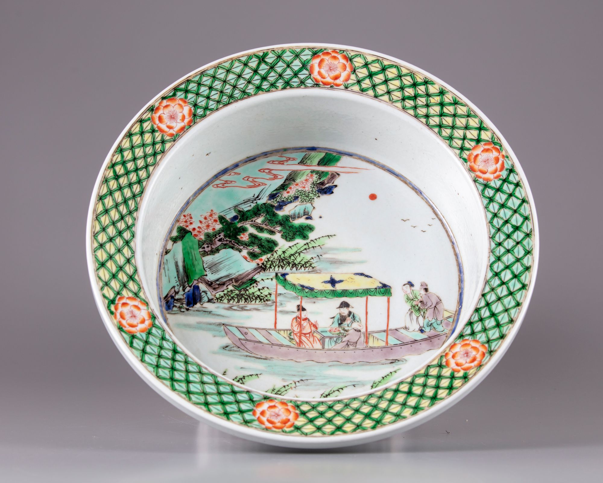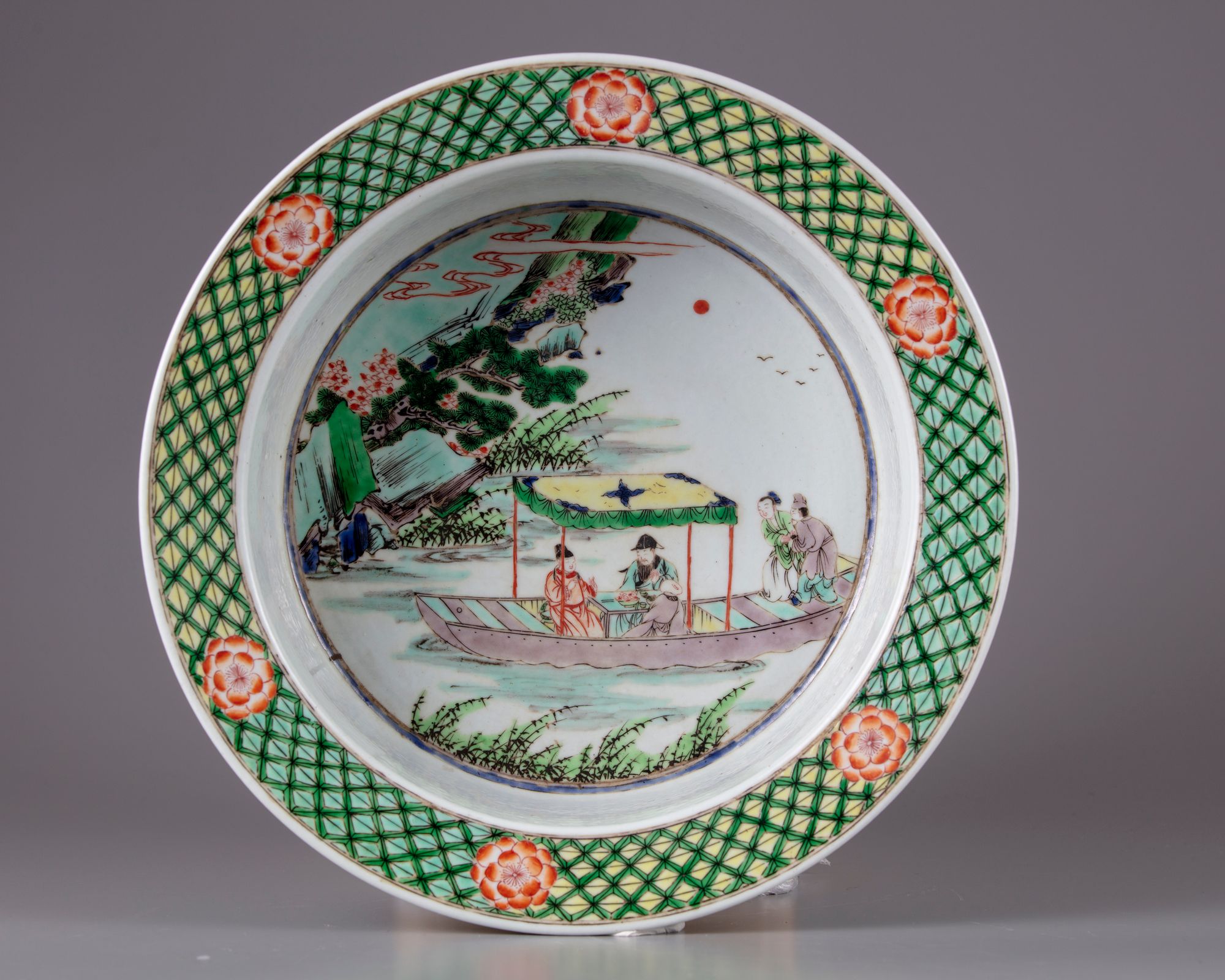 The heavily potted basin is decorated to the centre with a roundel enclosing figures in a sampan in a river landscape. The everted rim is decorated with flowers on a geometric design.