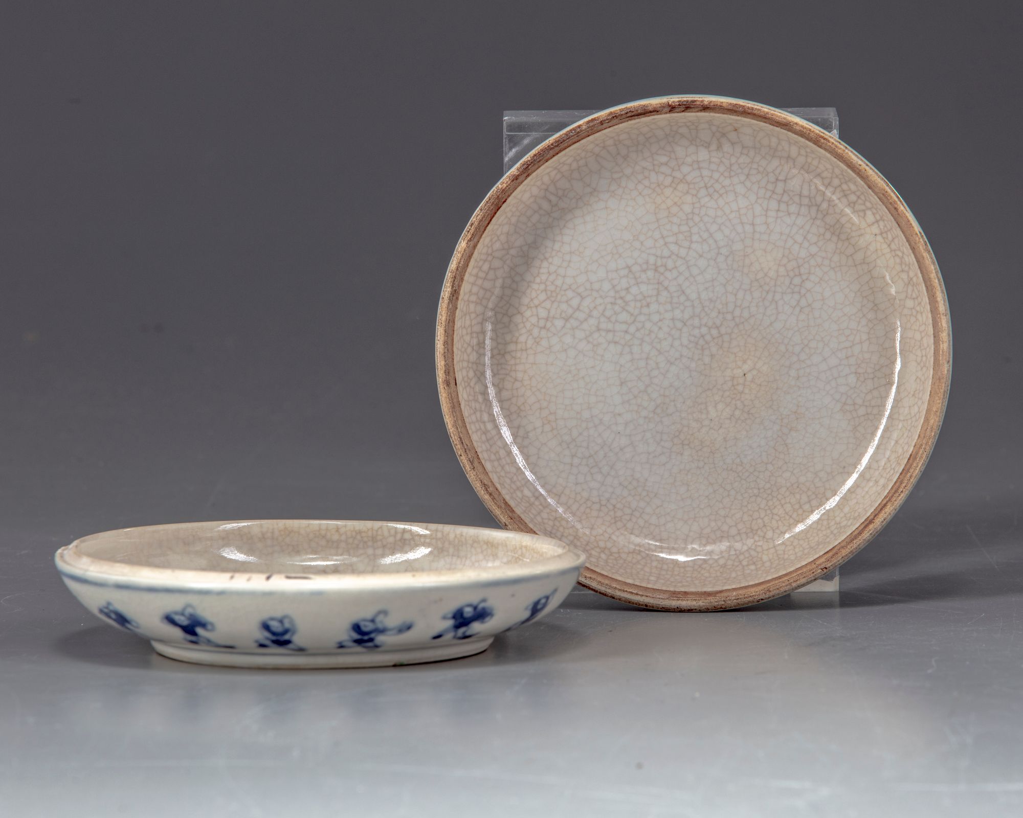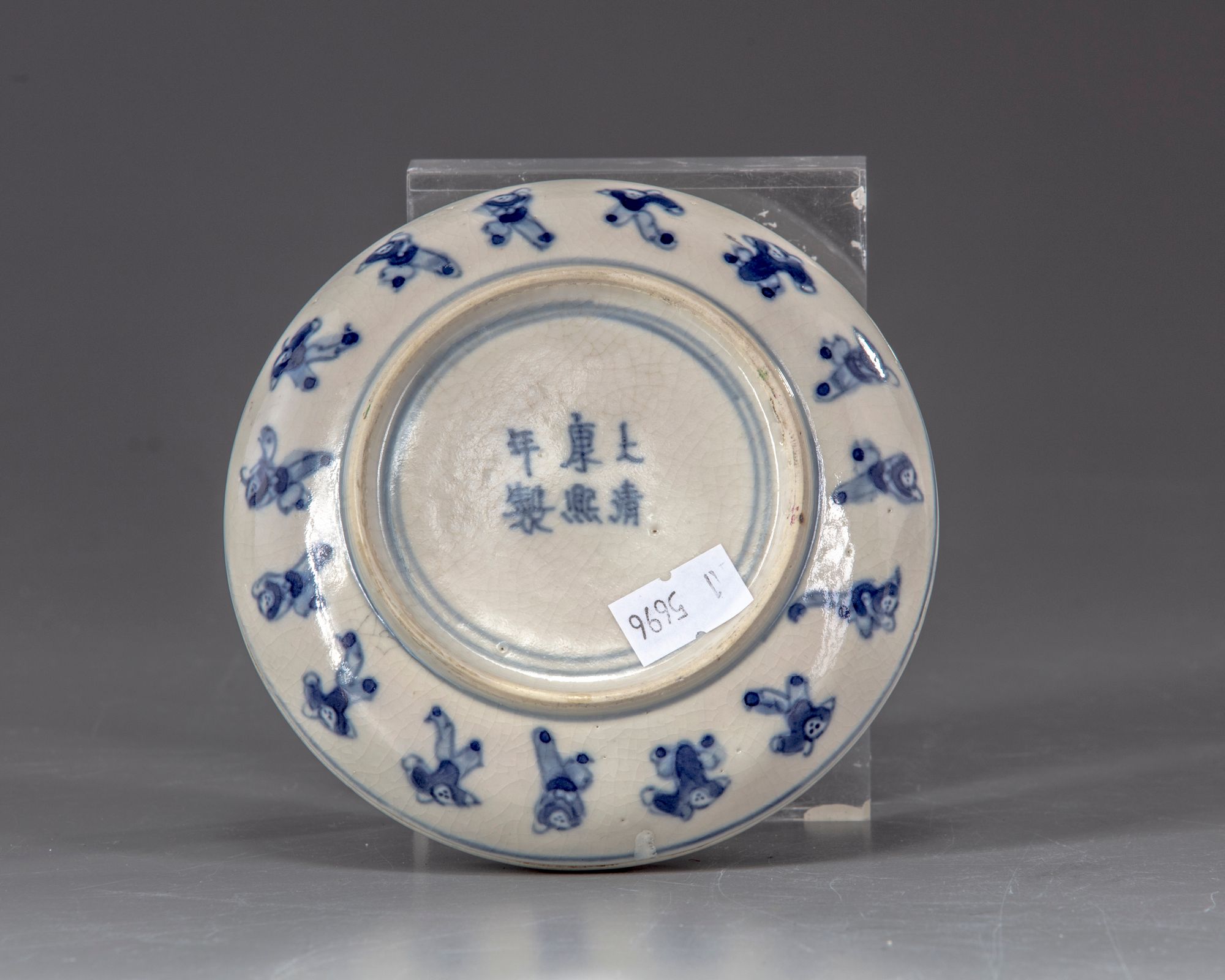 A Chinese blue and white circular box with cover, decorated in cobalt-blue with "Hundered boys" on a white cream crackled ground. The bottom with a Chinese Kangxi six character mark within a double circle.