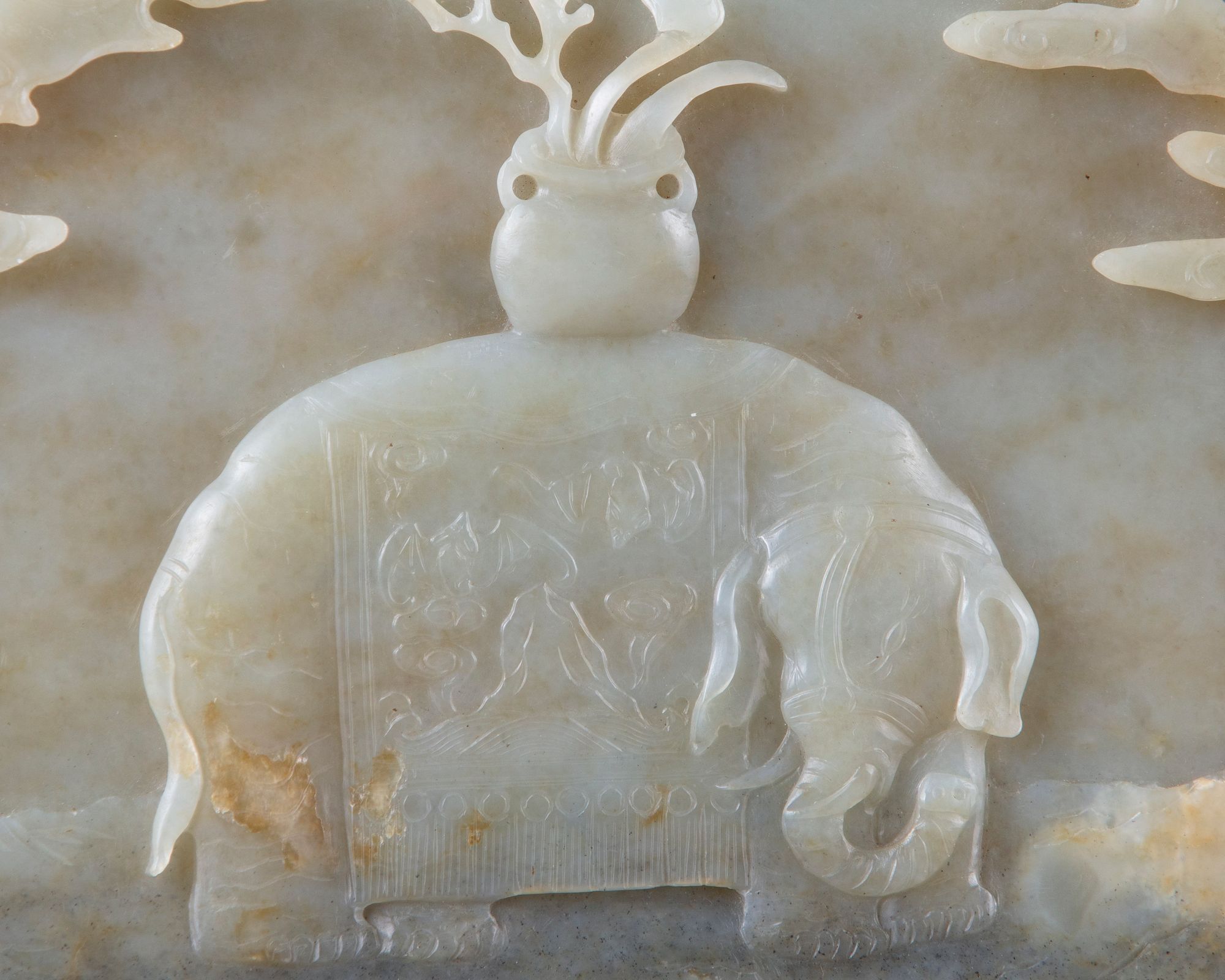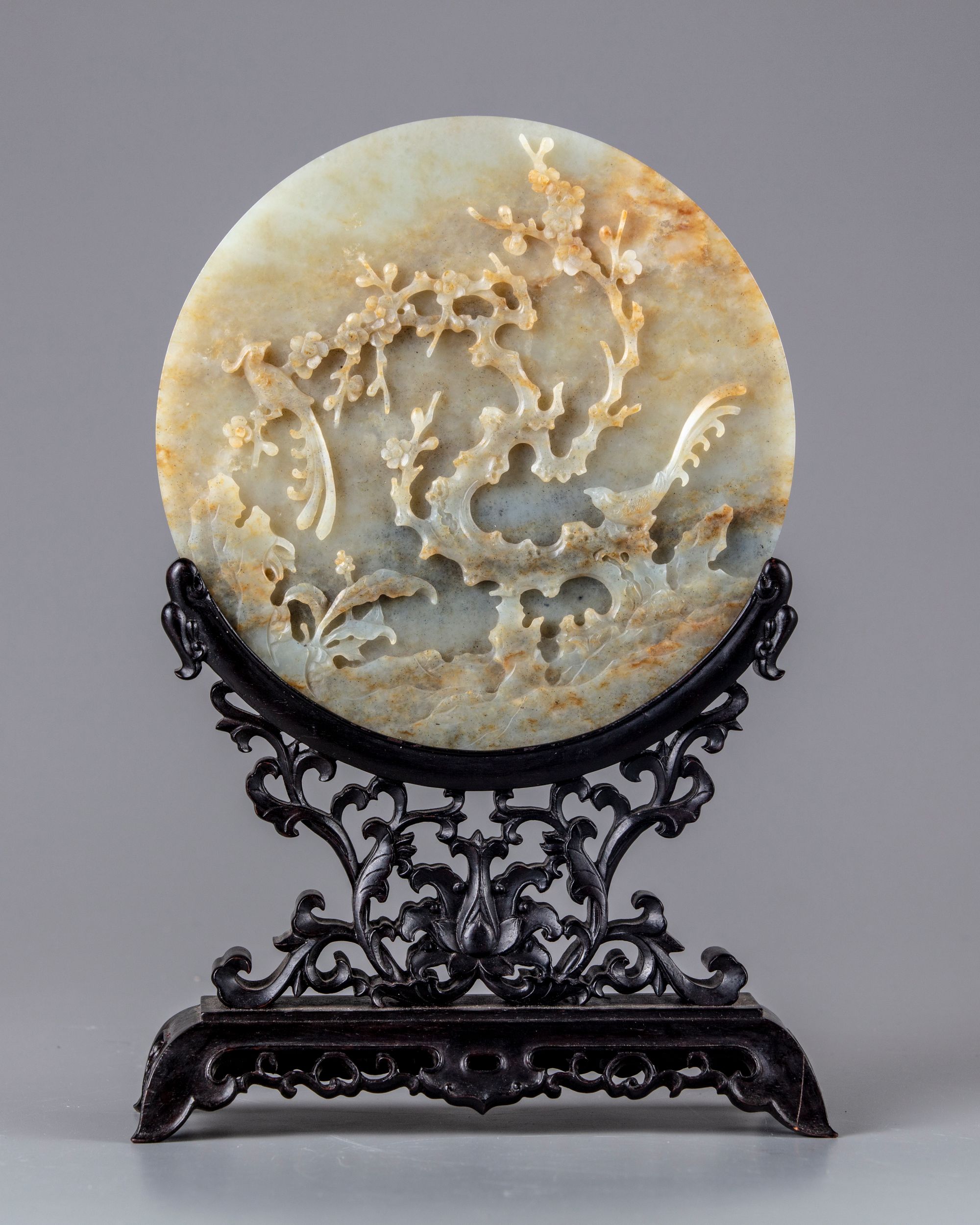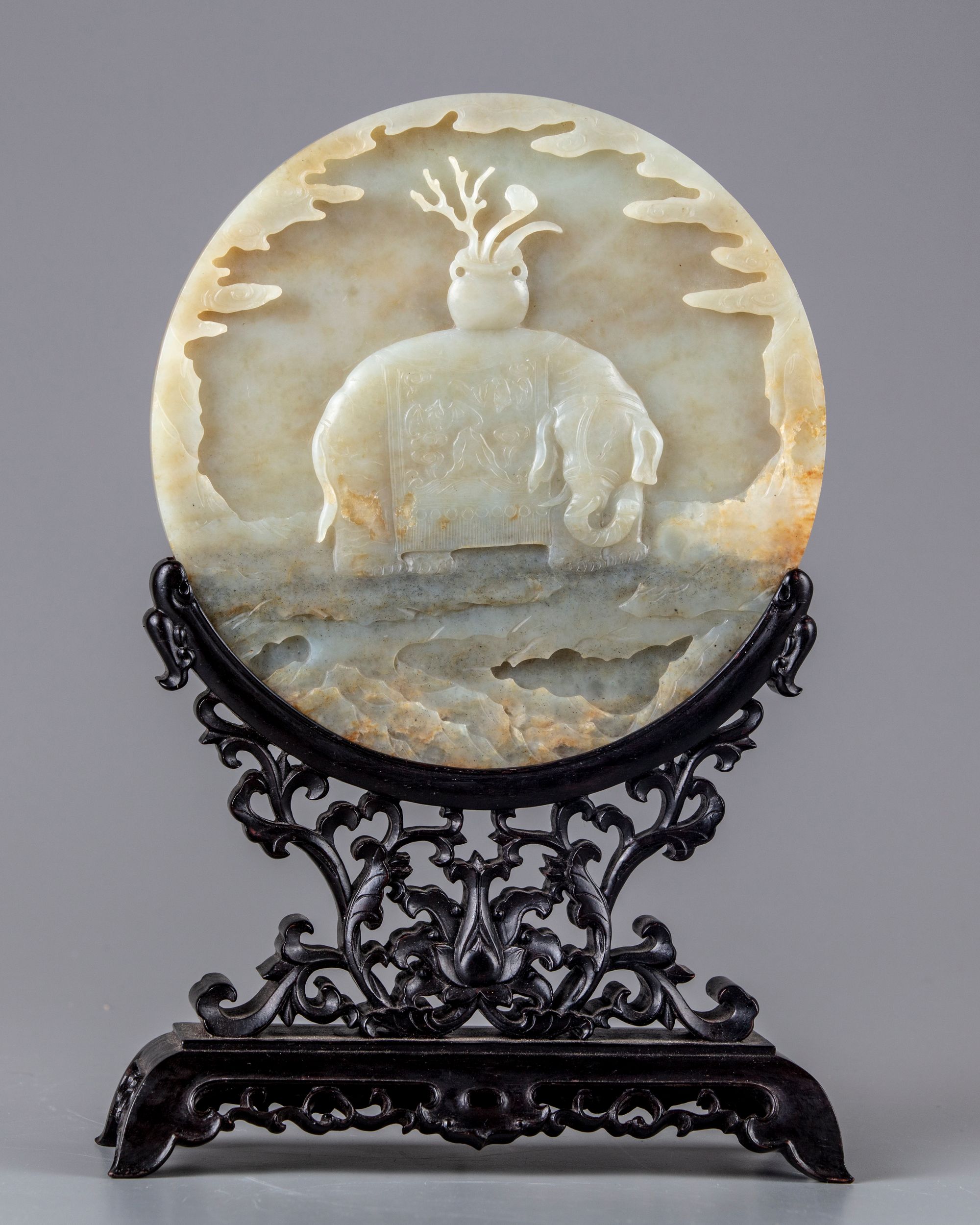 The circular panel is carved to one side with a caparisoned elephant carrying a vase with three halberds under coiled clouds. The reverse is carved with two pheasants amongst prunus. With a carved and pierced wood stand decorated with lotus.
