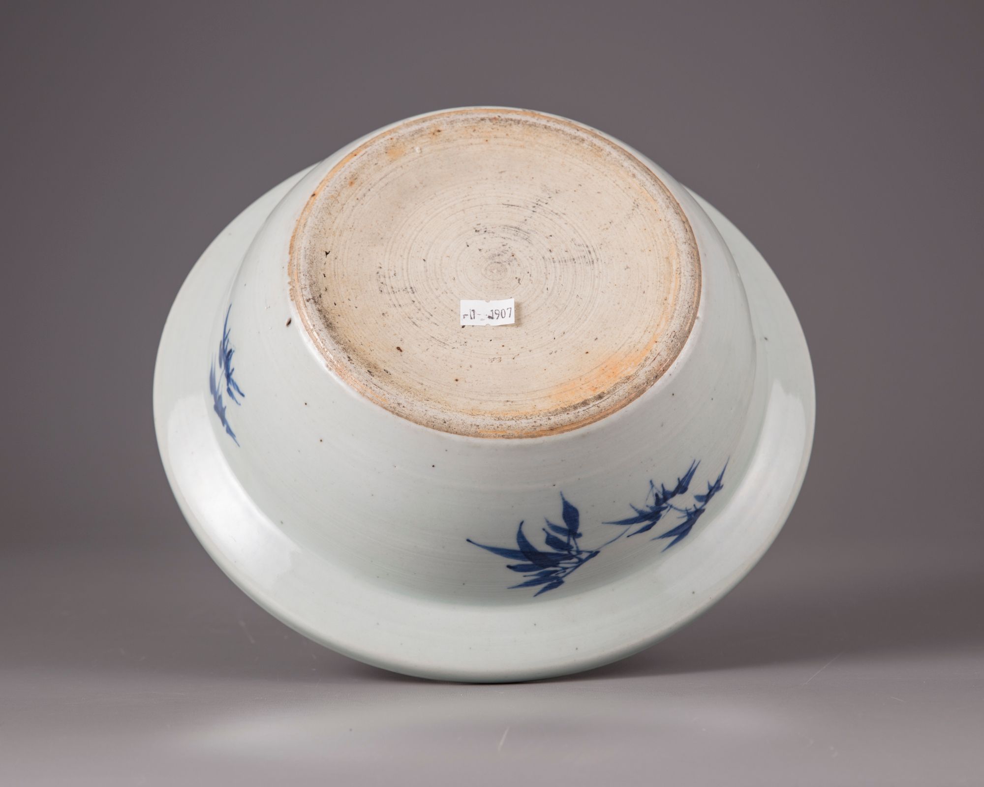 The basin is decorated with a central scene of a scholar with an attendant holding flowers, the cavetto is decorated with Chinese cabbage, bai cai, leading to a flattened rim decorated with prunus and chrysanthemum on an underglaze blue ground. The reverse is decorated with bamboo sprays.