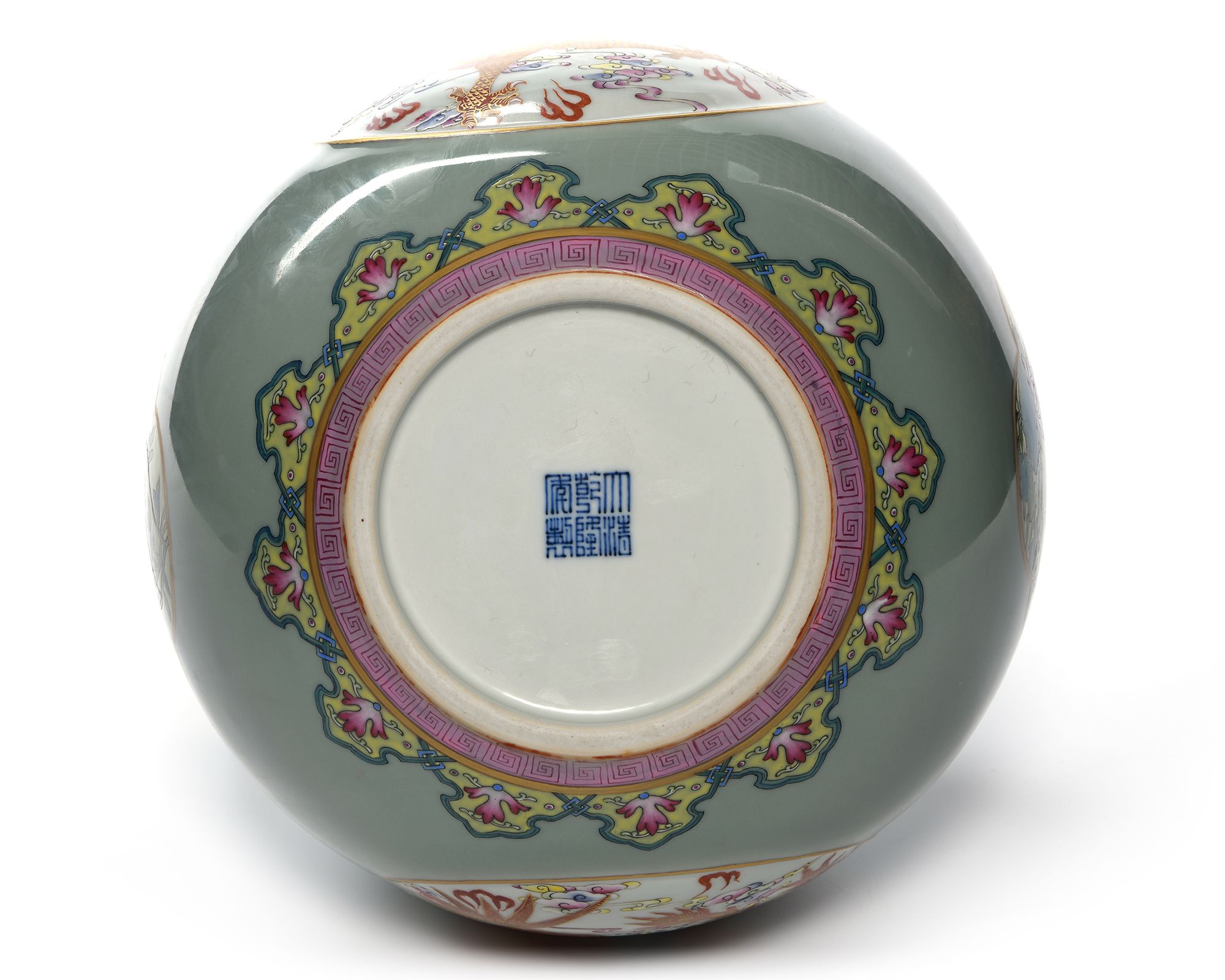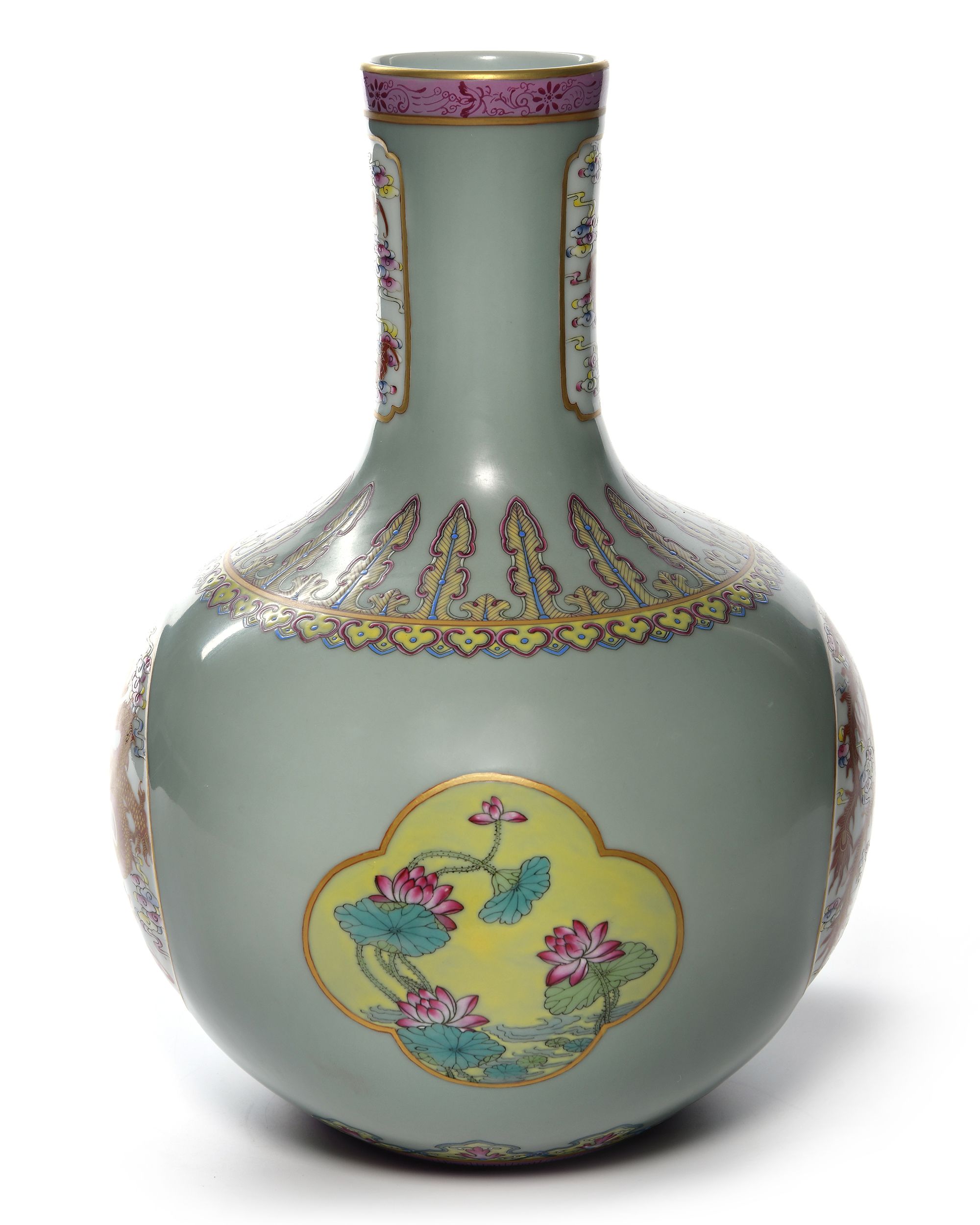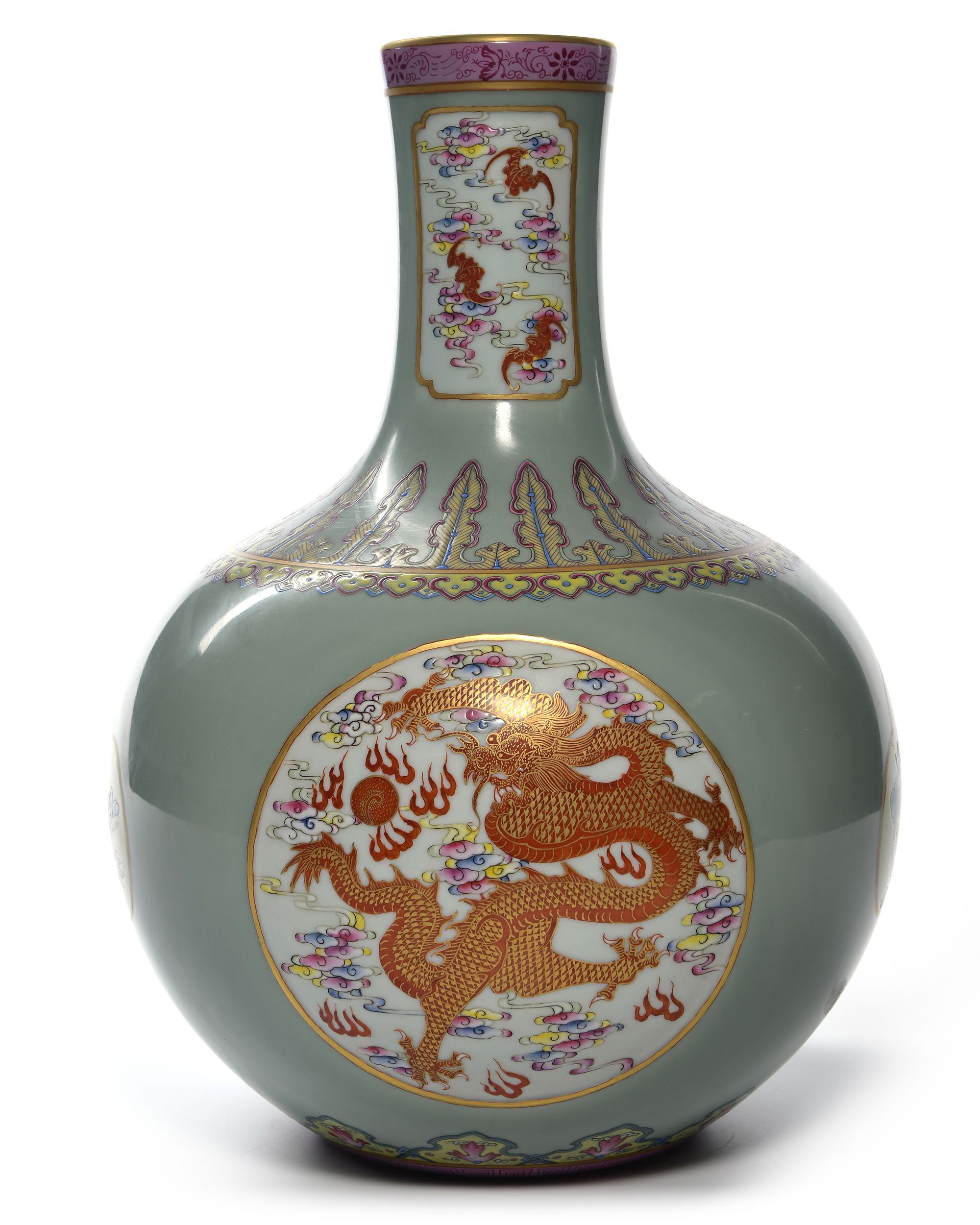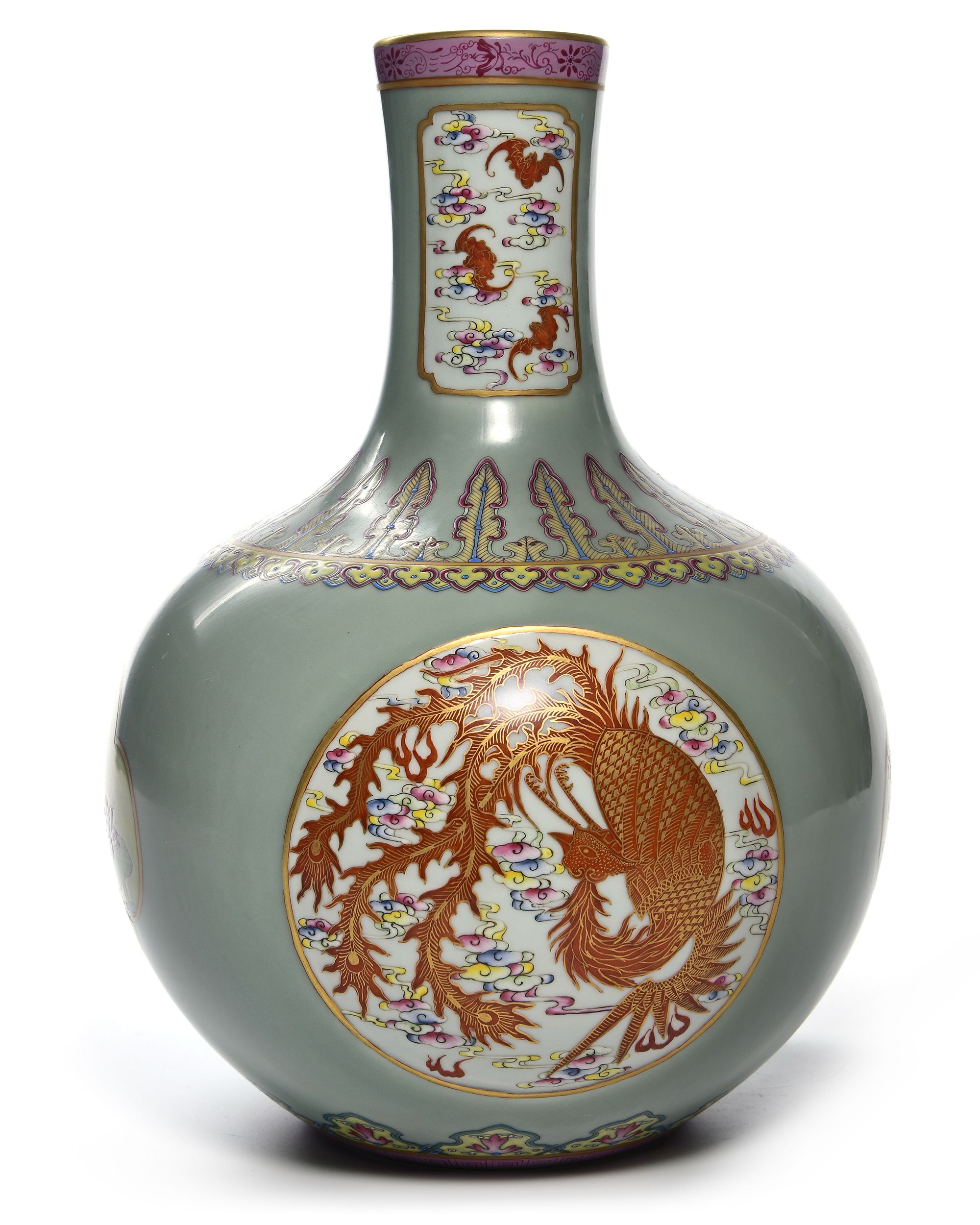 A Chinese porcelain bottle vase decorated with two gilt roundels enclosing each a gilt coral red dragon and a phoenix amongst clouds. The shoulder stylised further with a band of ruyi heads and upright plantain leaves. The neck with two panels enclosing Fu-bats amongst clouds, all on a greenish blue ground. The bottom with a Chinese Qianlong seal mark. 38 cm. height, 28 cm. diam.