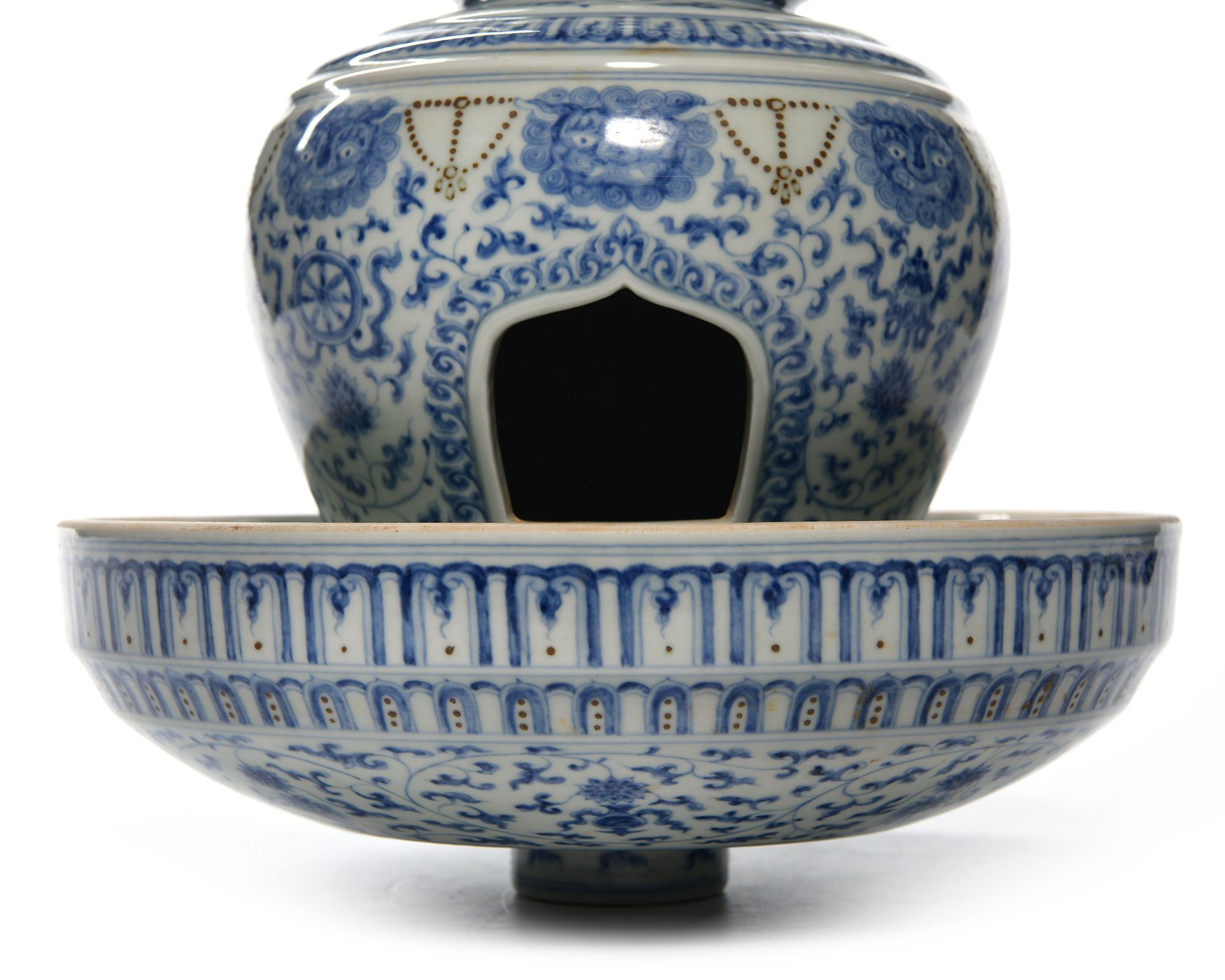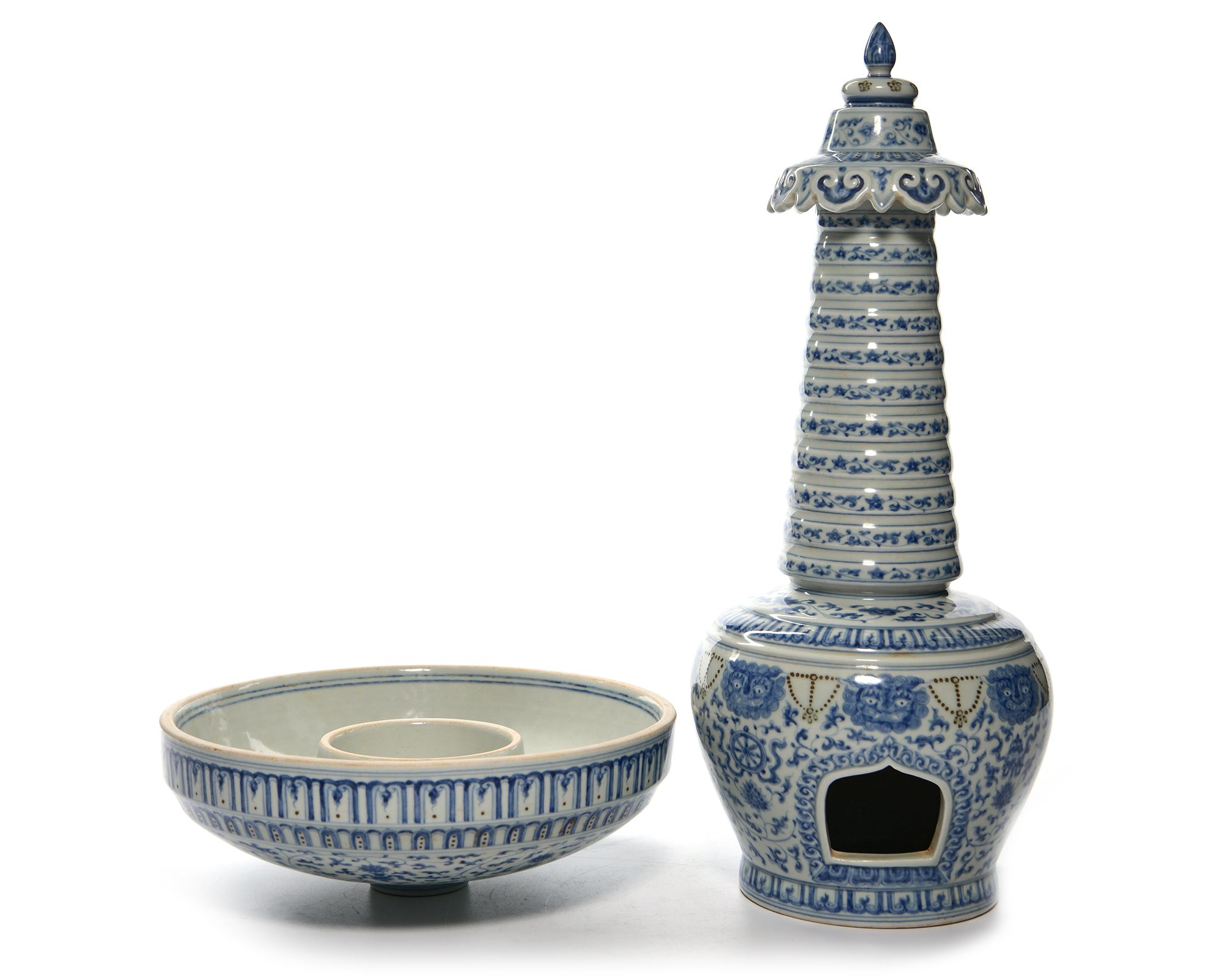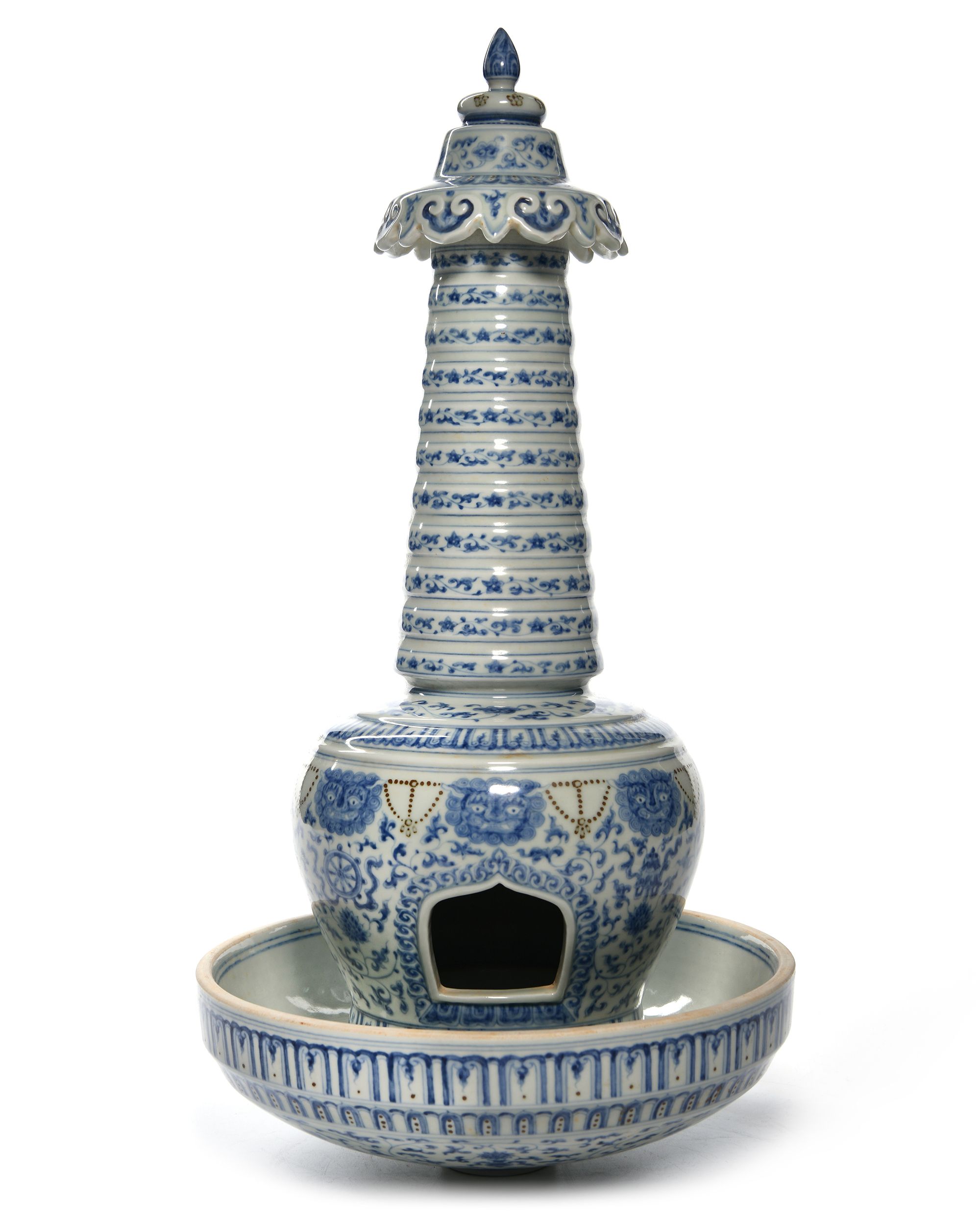 The stupa is decorated in cobalt blue with scrolling lotus and Buddhist embelms below monster masks linked by beaded chains. The shrine supports a series of graduated sections, each tier is decorated with a narrow floral band. The stupa supported on a bowl shaped base decorated with flower scrolls interpersed with eight Buddhist emblems below two bands of lappets. The inside with a Chinese Chenghua six character mark. 48 cm. height, 27 cm. diam.