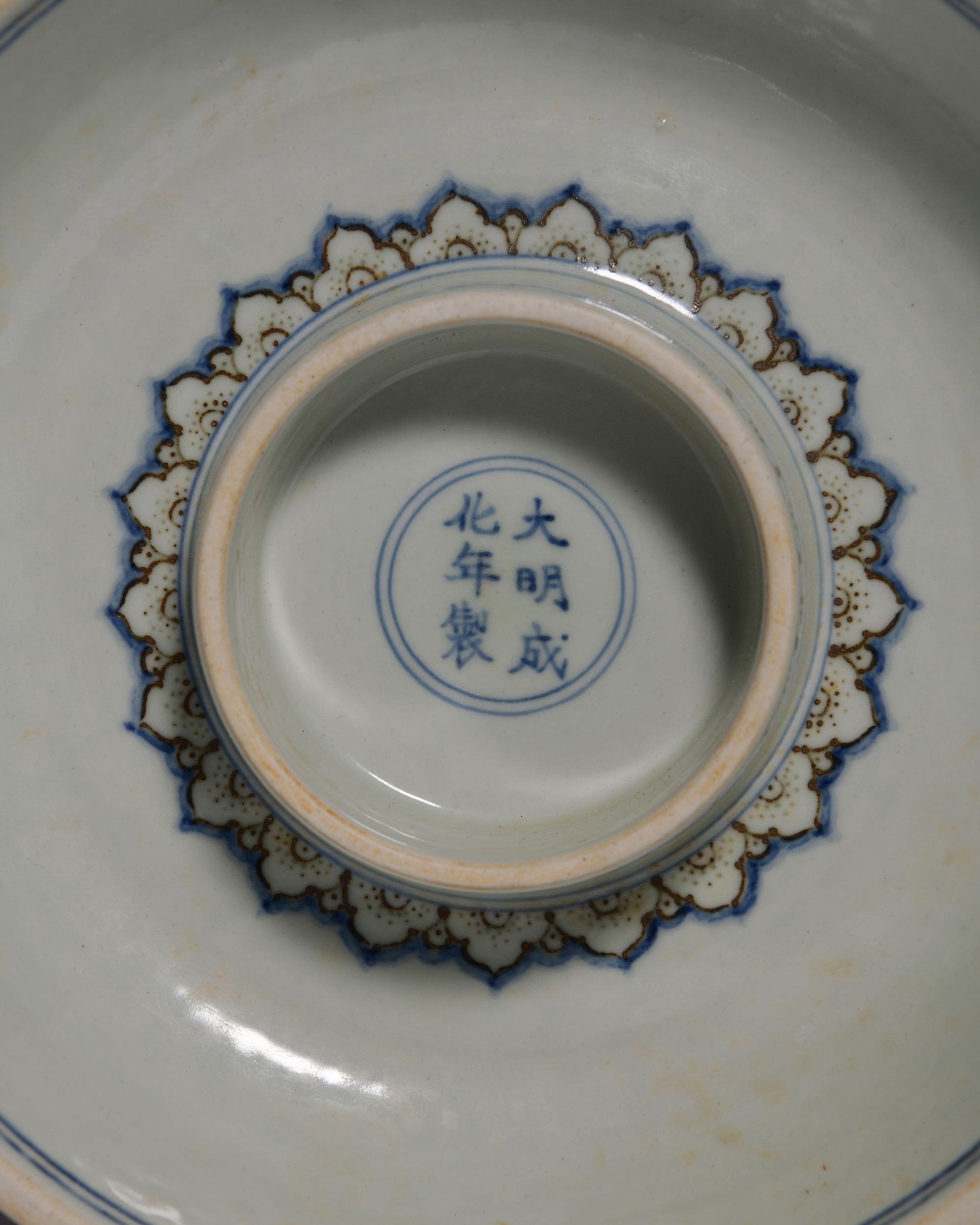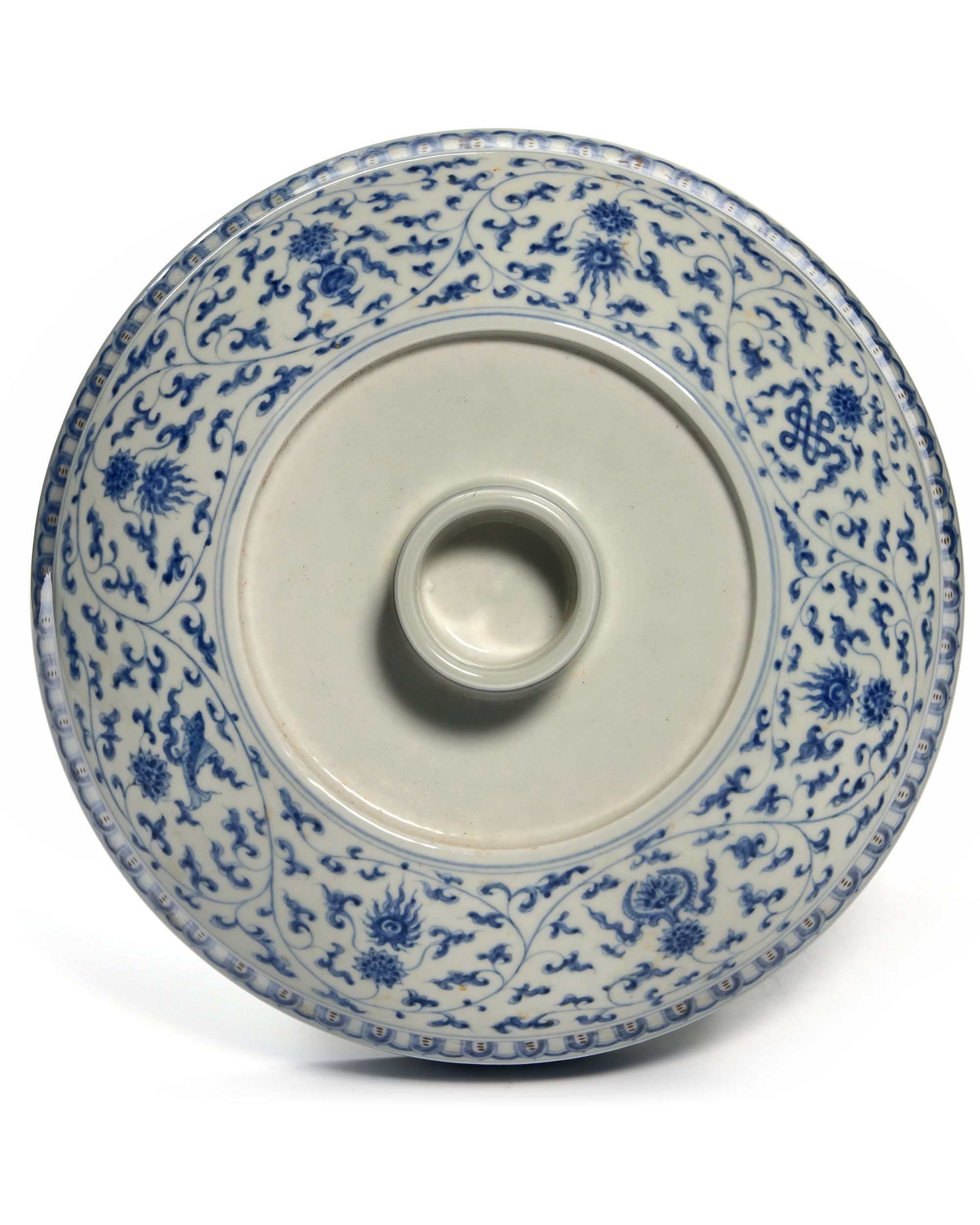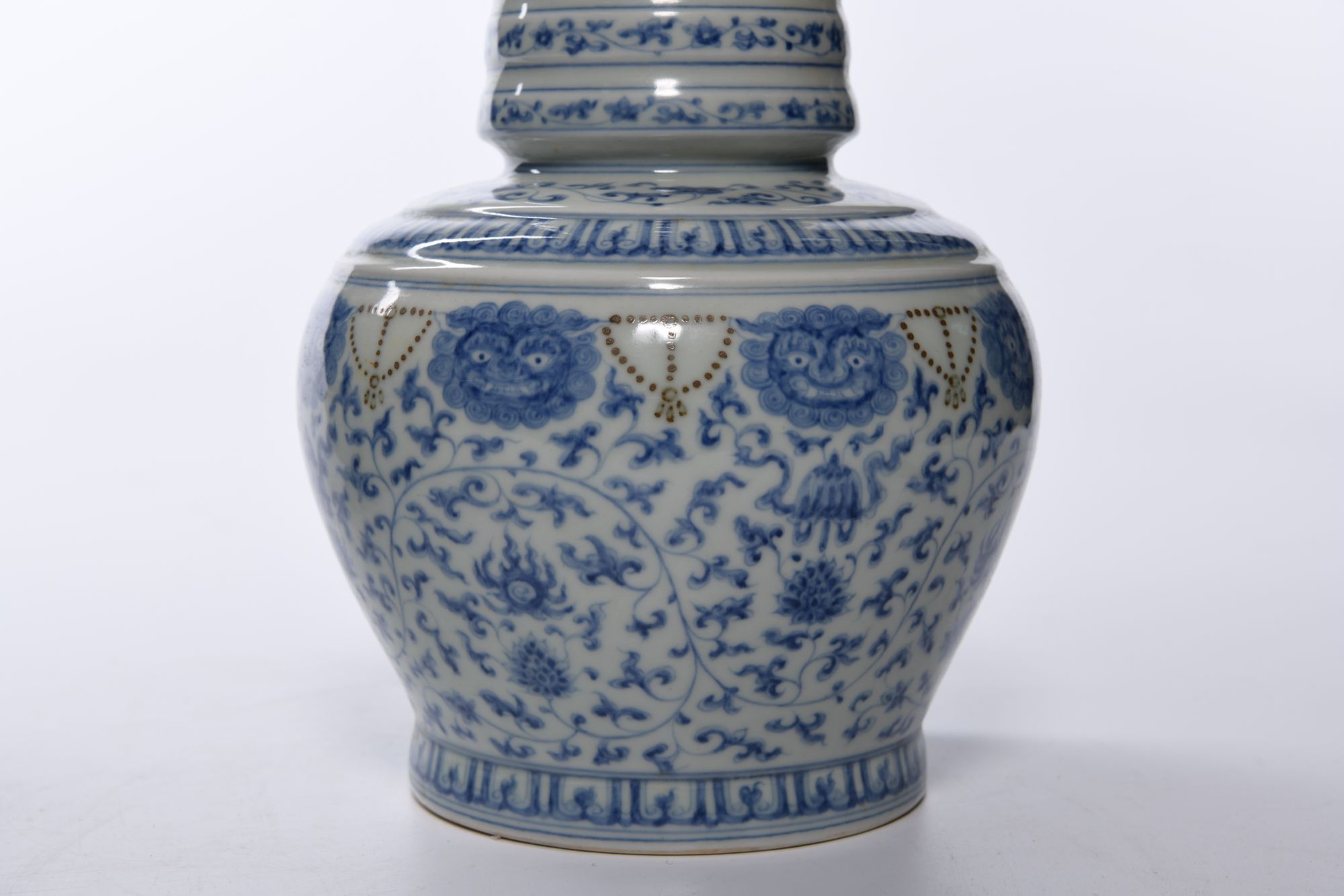 The stupa is decorated in cobalt blue with scrolling lotus and Buddhist embelms below monster masks linked by beaded chains. The shrine supports a series of graduated sections, each tier is decorated with a narrow floral band. The stupa supported on a bowl shaped base decorated with flower scrolls interpersed with eight Buddhist emblems below two bands of lappets. The inside with a Chinese Chenghua six character mark. 48 cm. height, 27 cm. diam.