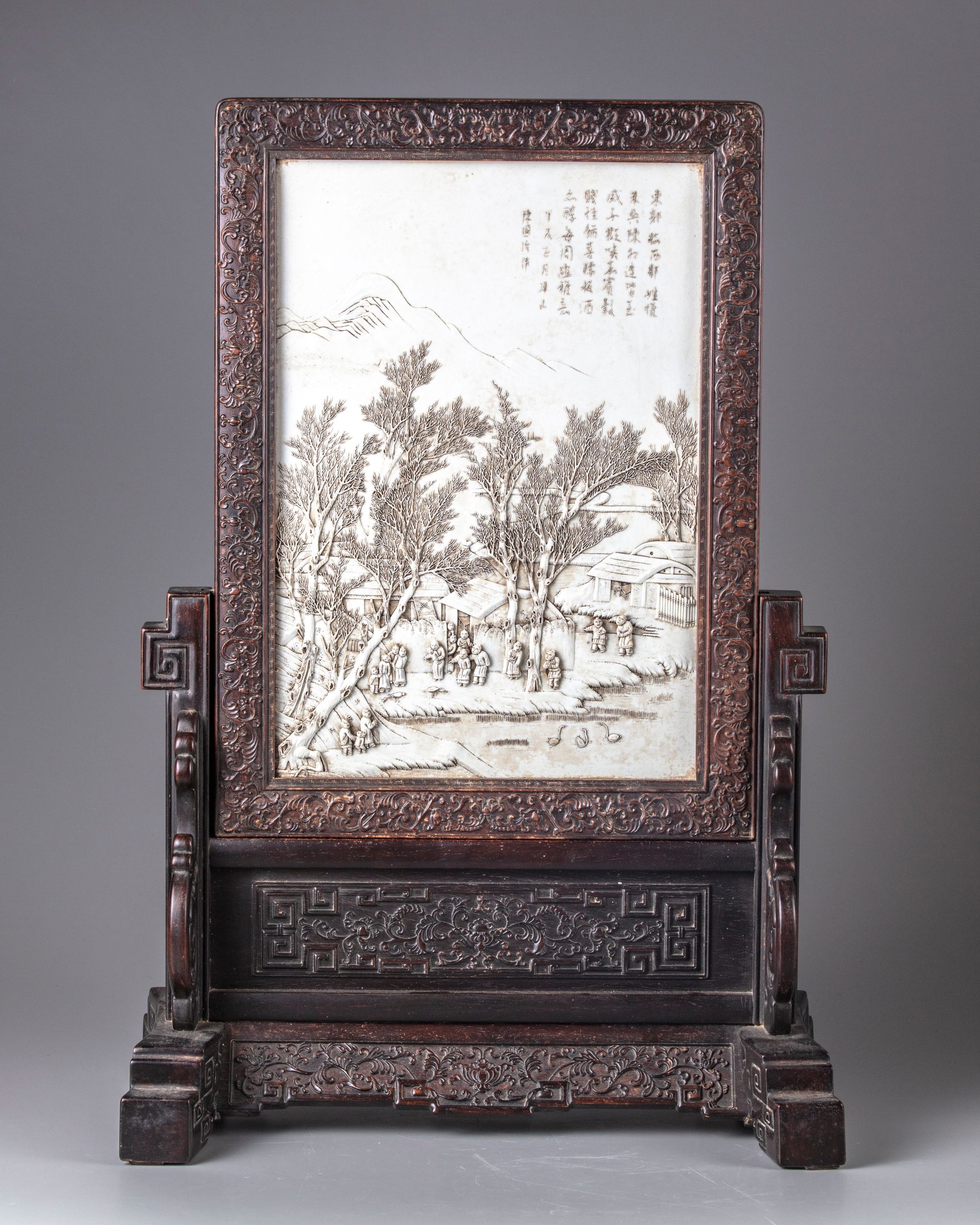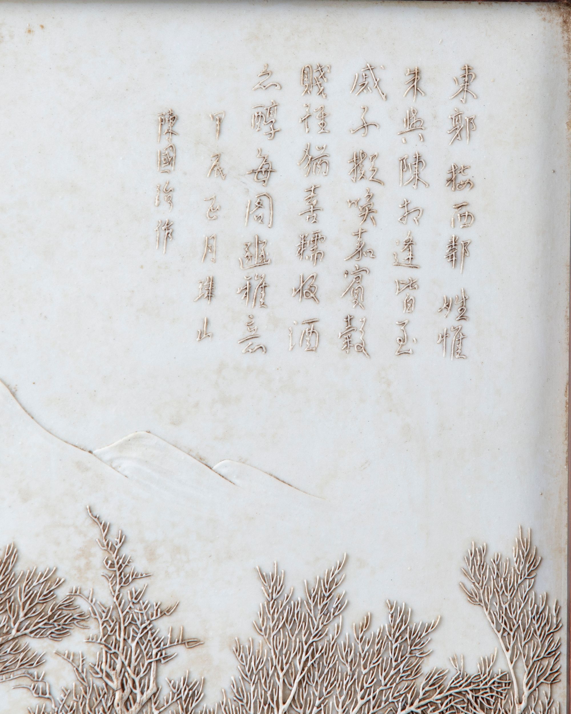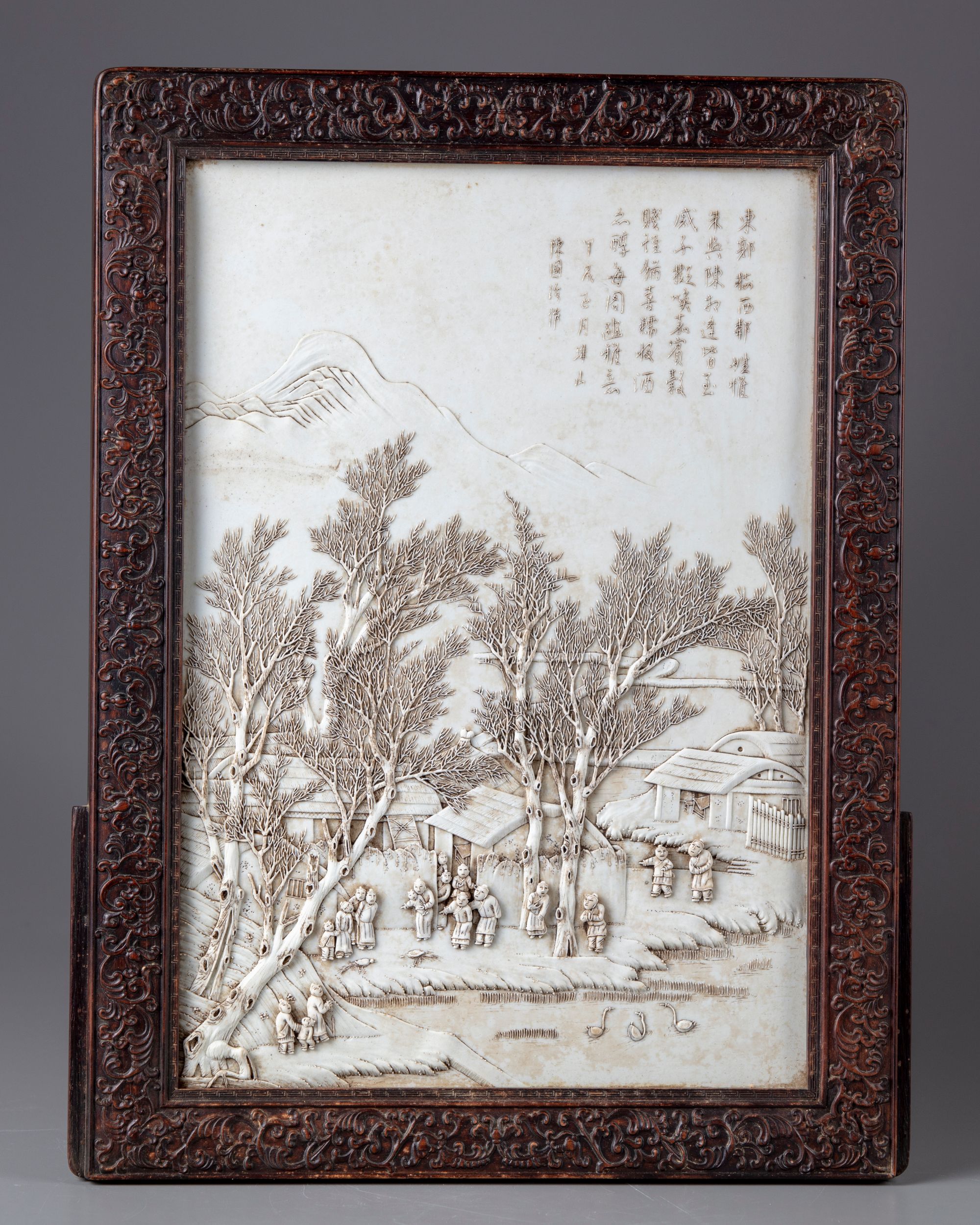 The rectangular tile is crisply moulded and applied with boys beside a lake and houses in a snowy mountainous landscape, further with a Chinese calligraphy. The border is carved with a foliage scroll.