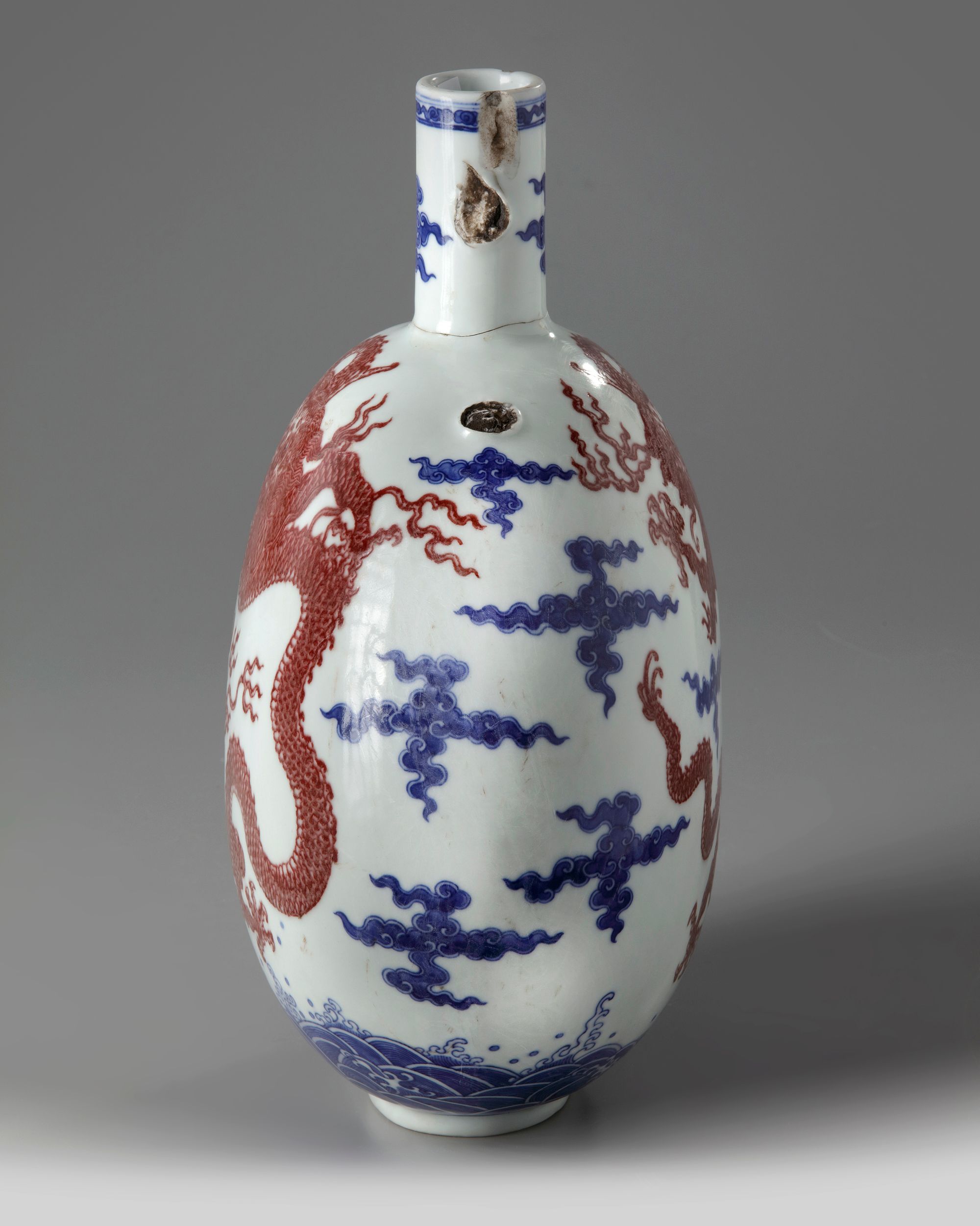 A Chinese underglaze blue and copper-red-decorated 'dragon' moonflask