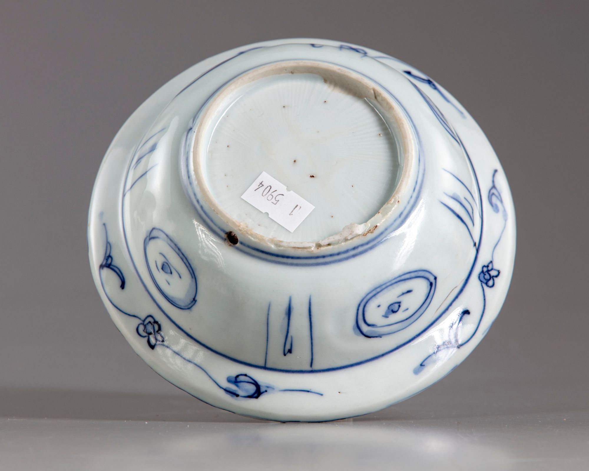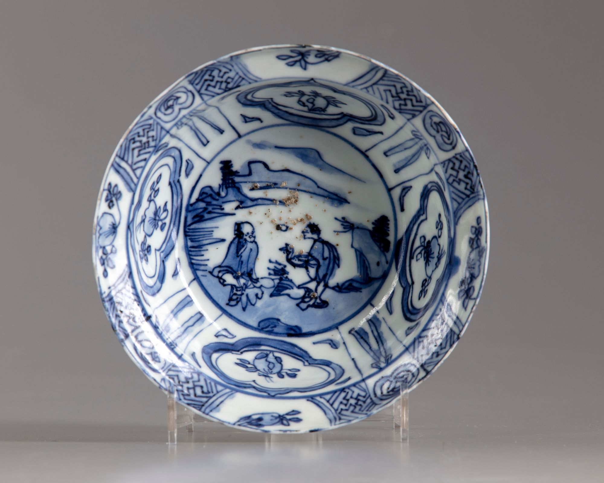 A Chinese porcelain bowl, decorated in cobalt-blue with two figures seated in a landscape, to the sides with panels enclosing flowers.To the everted rim with a diaper band containing cartouches enclosing flowers.