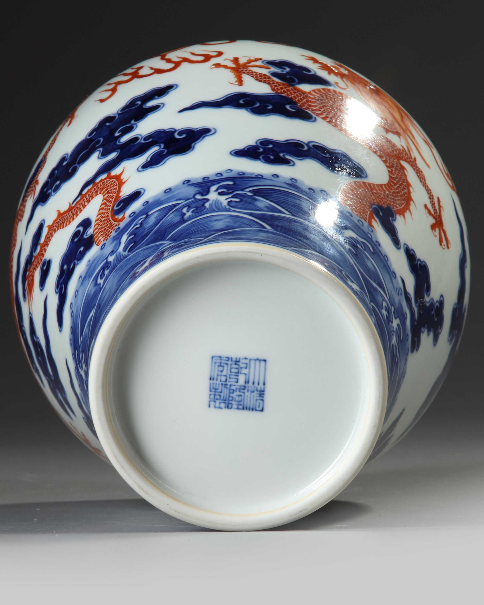 A CHINESE CORAL-RED DECORATED BLUE AND WHITE MEIPING VASE, 20TH CENTURY