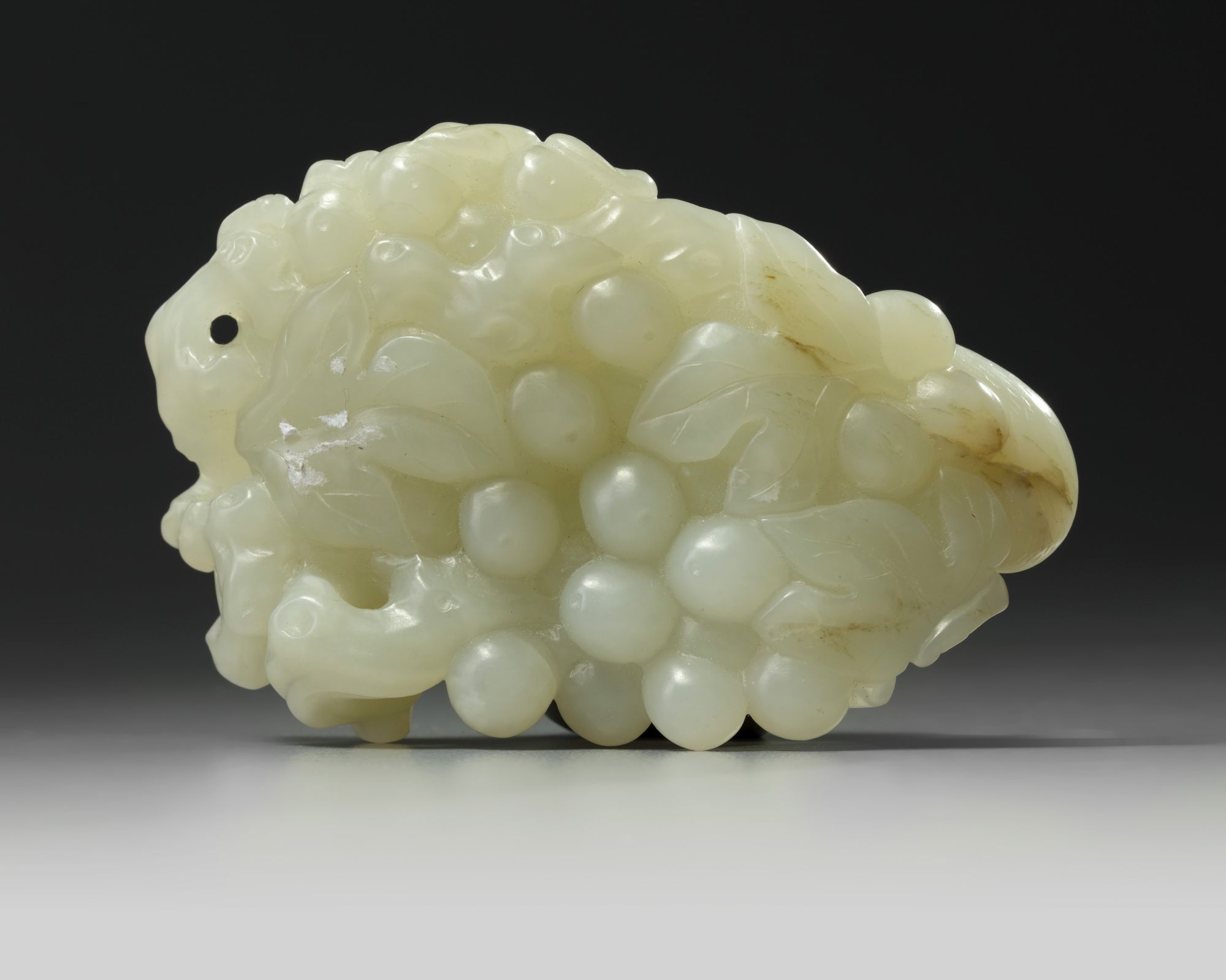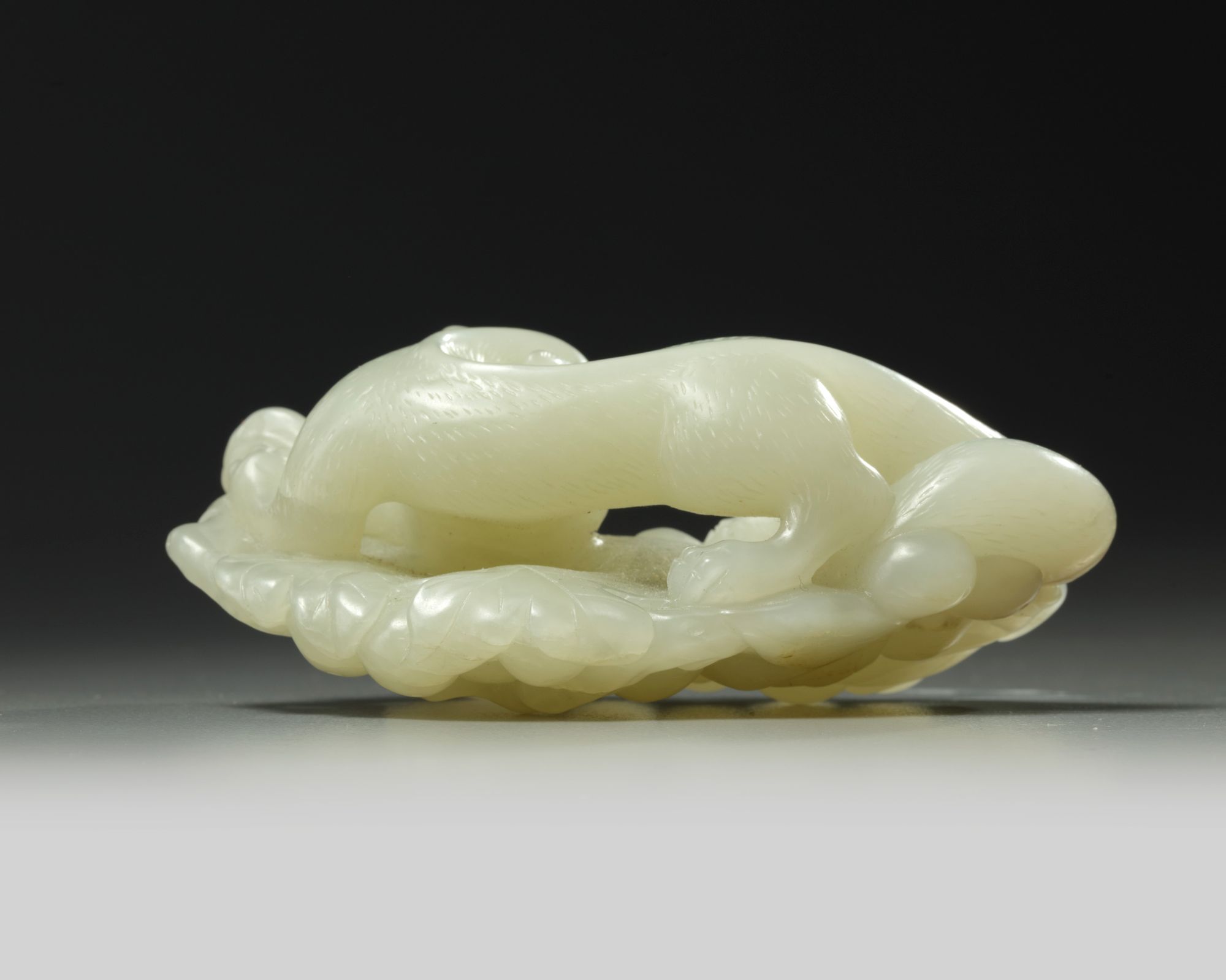 The squirrel is carved with a bushy tail, crouching upon a bunch of grapes on a leafy gnarled stem. The stone is of an even white tone.