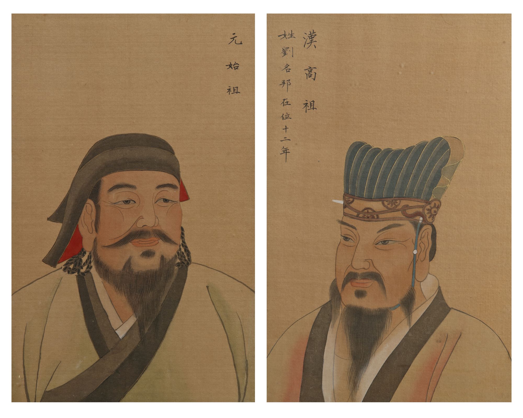One painting depicts Emperor Gaozu of Han and is entitled with his emperor name and birth name and dates. The other painting depicts a further figure entitled 'Yuan Shi zu', possibly Kubilai Khan.