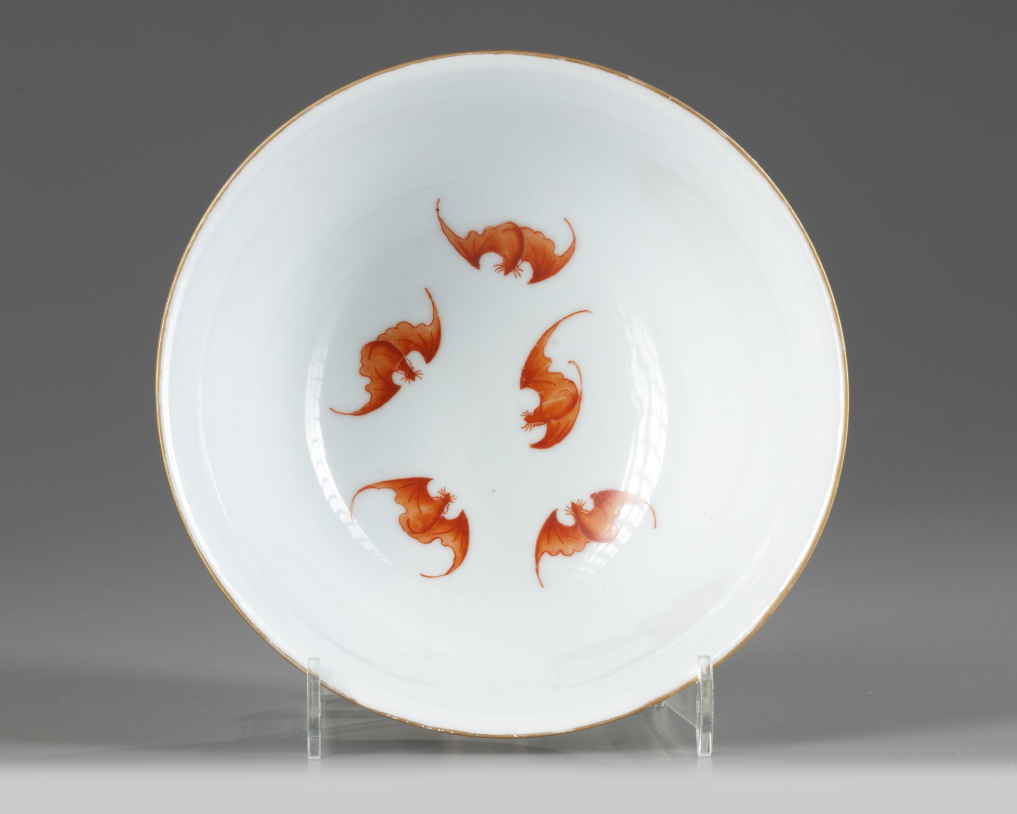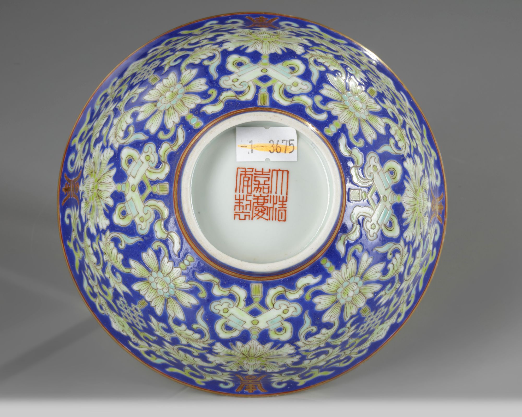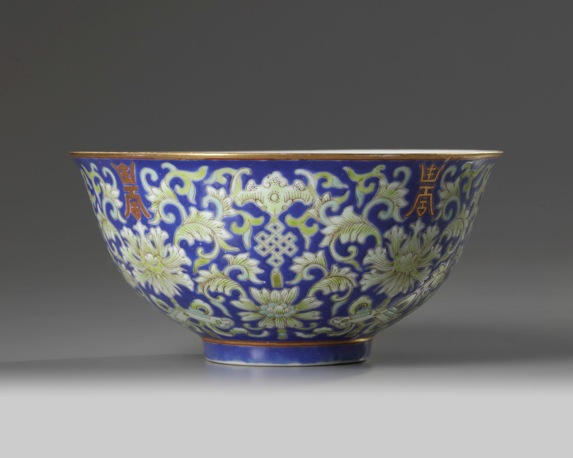 The bowl is decorated with alternating gilt shou characters and the endless knot on a ground of scrolling lotus. The base with an apocryphal Jiaqing mark.