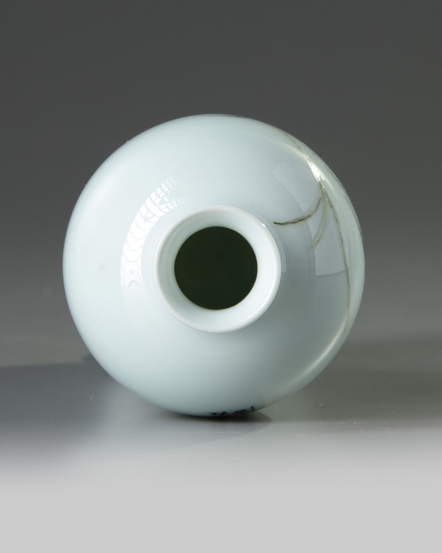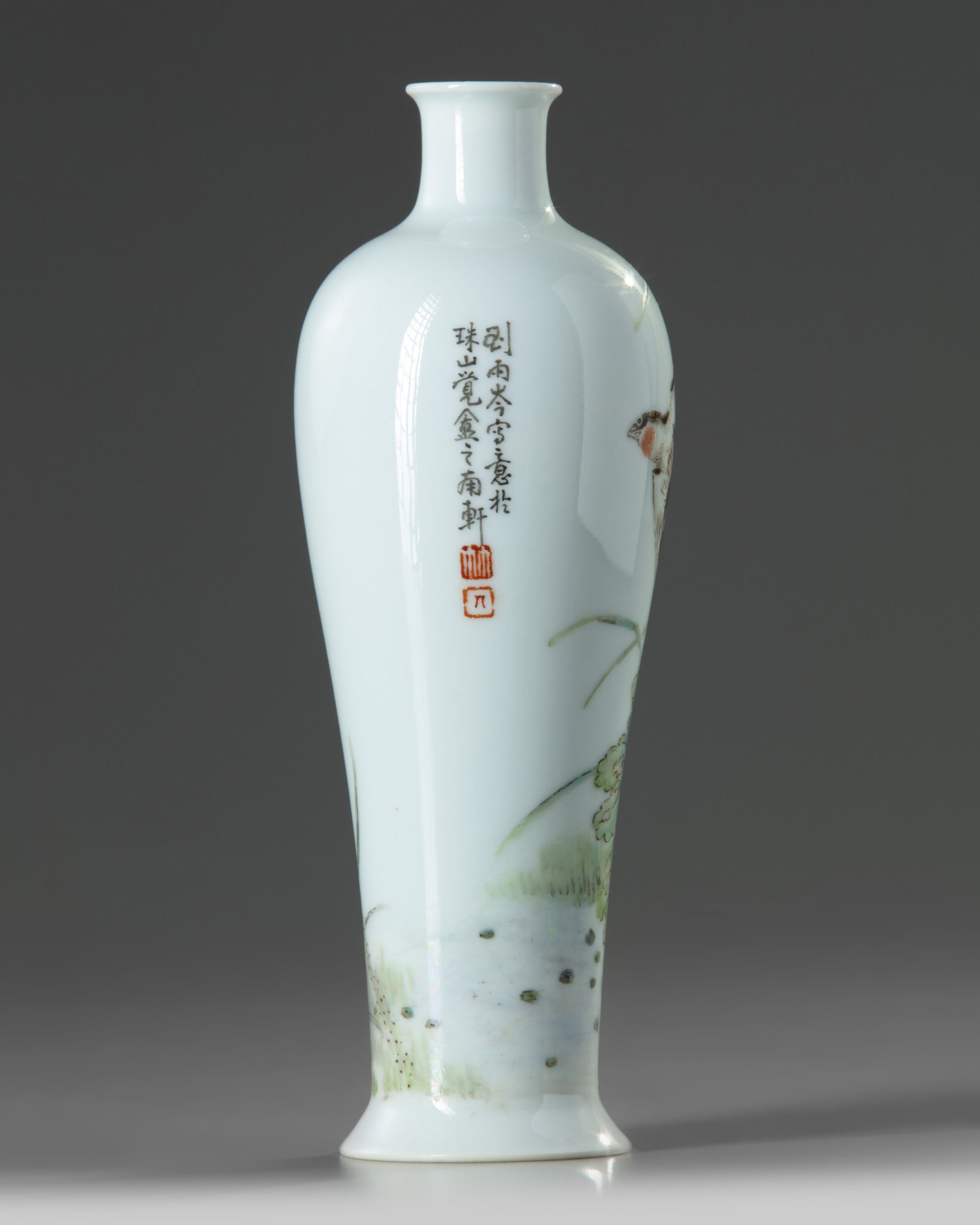 The vase is delicately decorated with two birds in flight amongst a leafy lotus flowers and water reeds. The reverse is inscribed with the signature of Liu Yucen and the base is marked 'Jue An' in iron red.