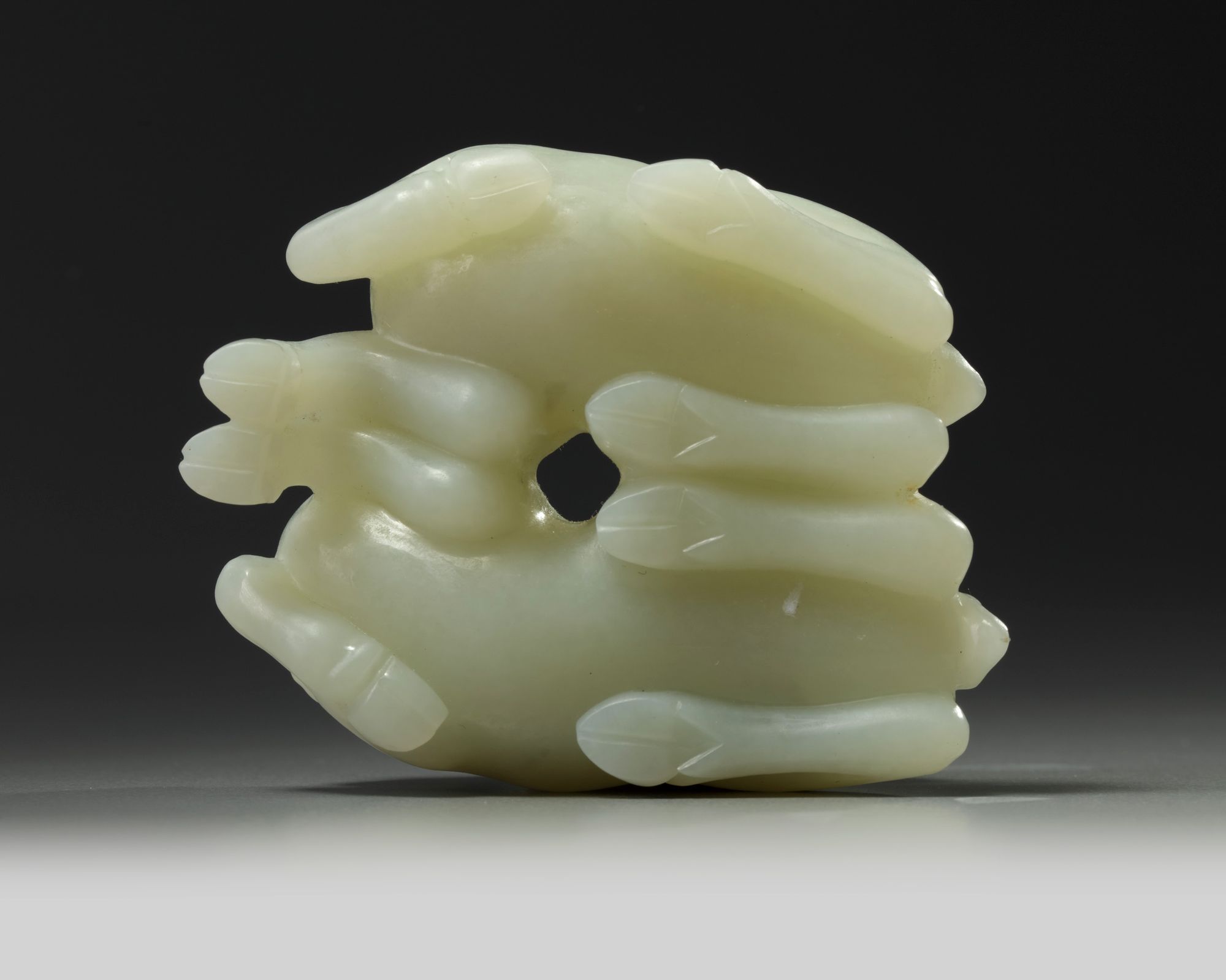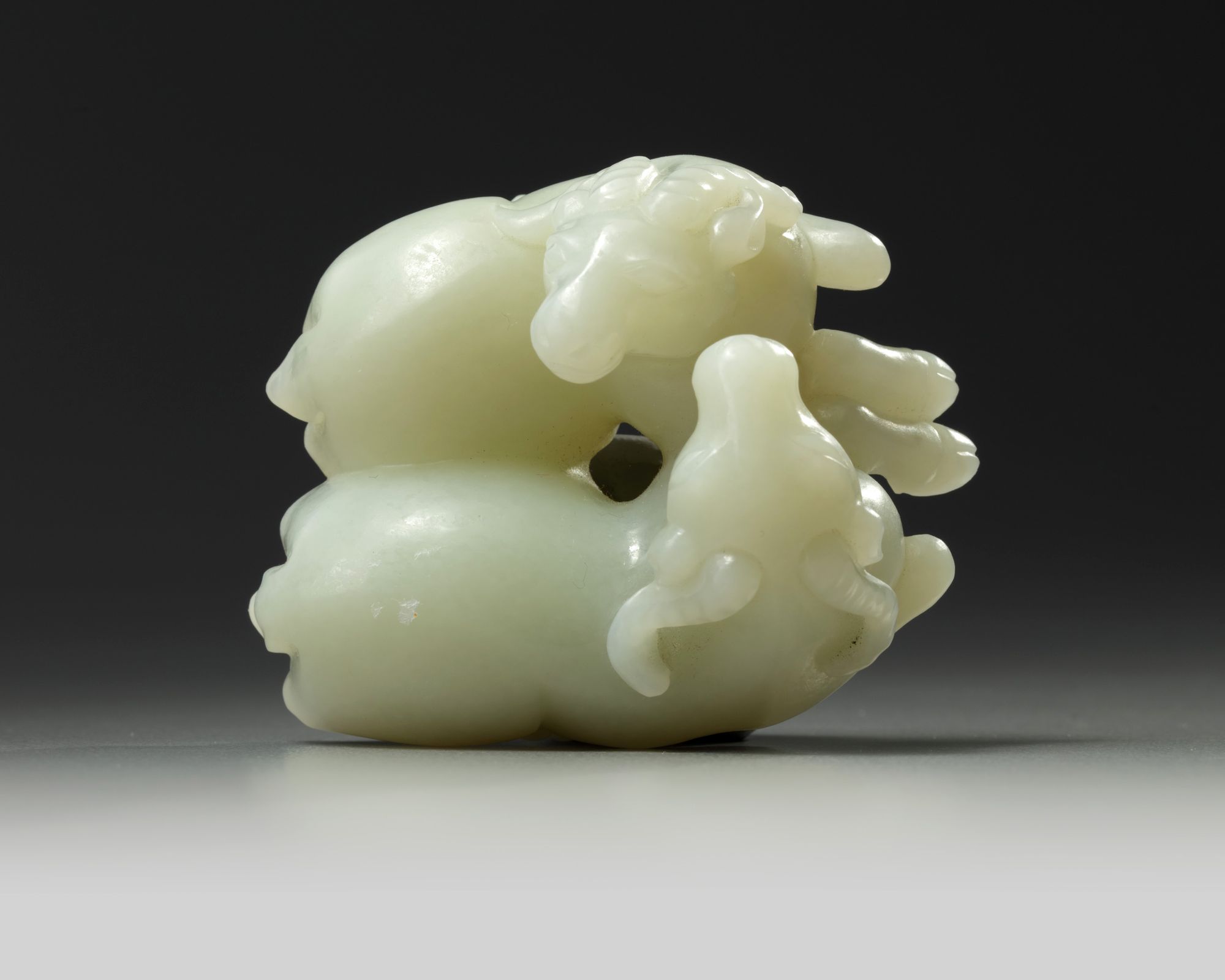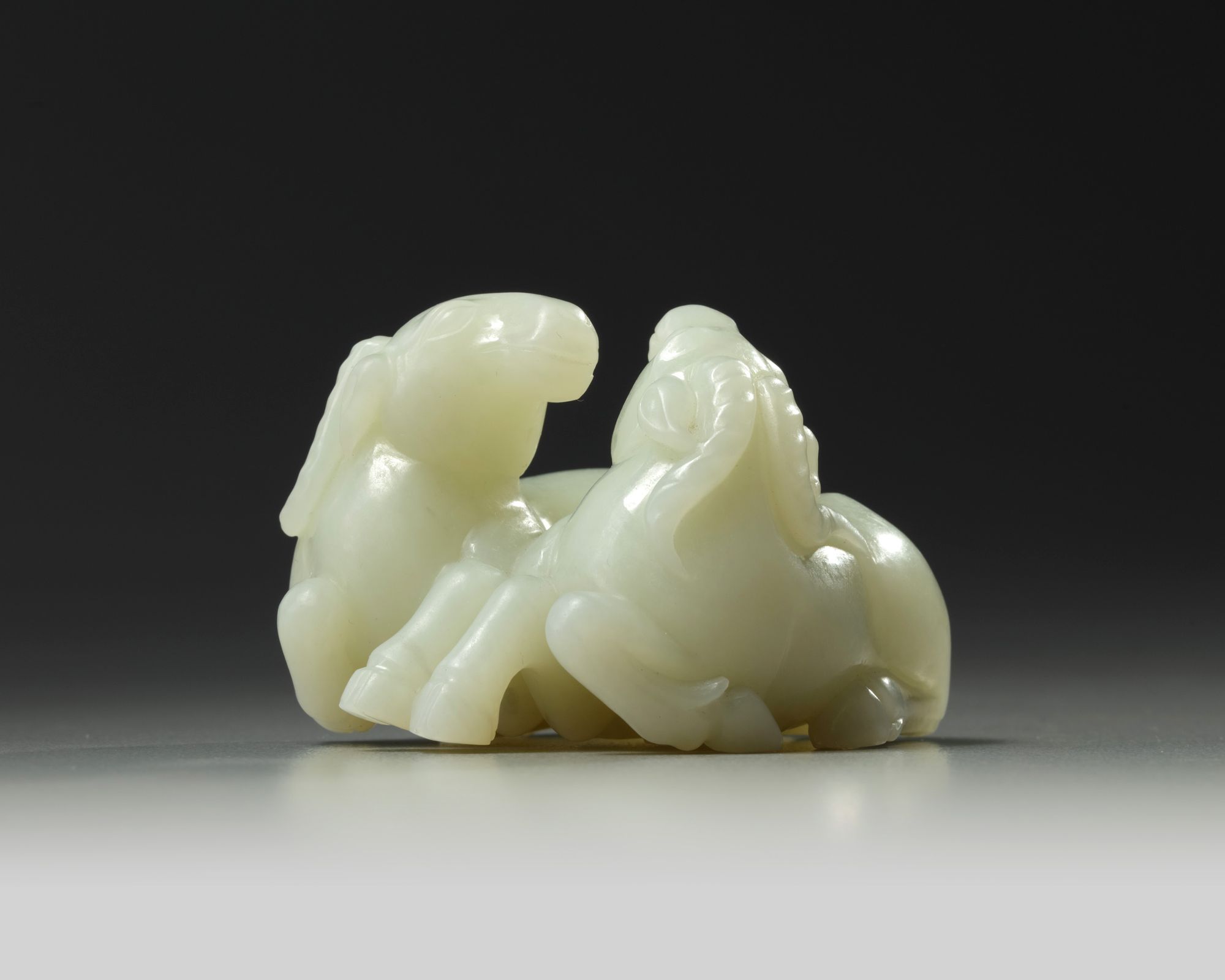 The piece is carved in the round with two ram recumbent next to each other, each with one of their front legs tucked under them. The stone is of an even pale tone.