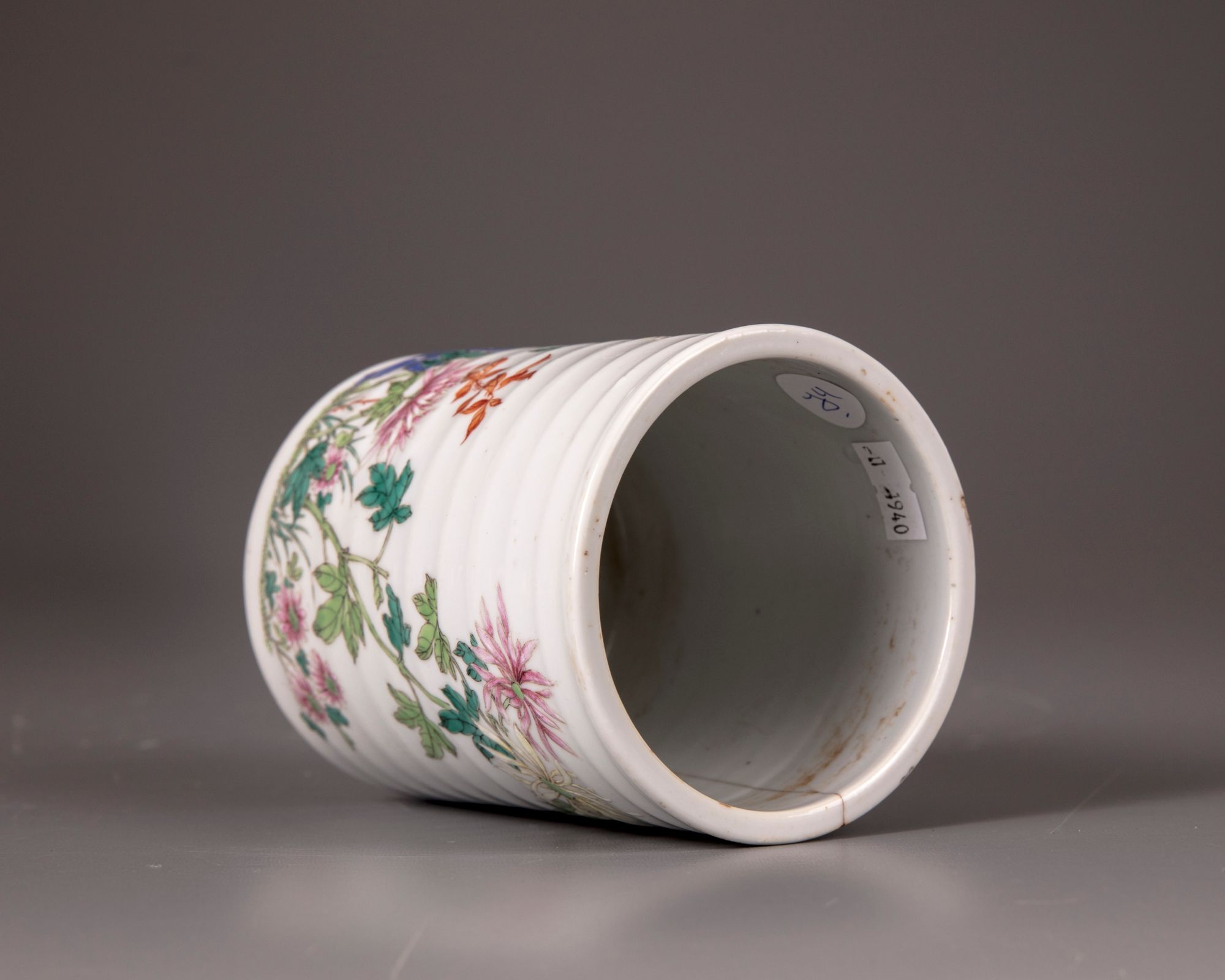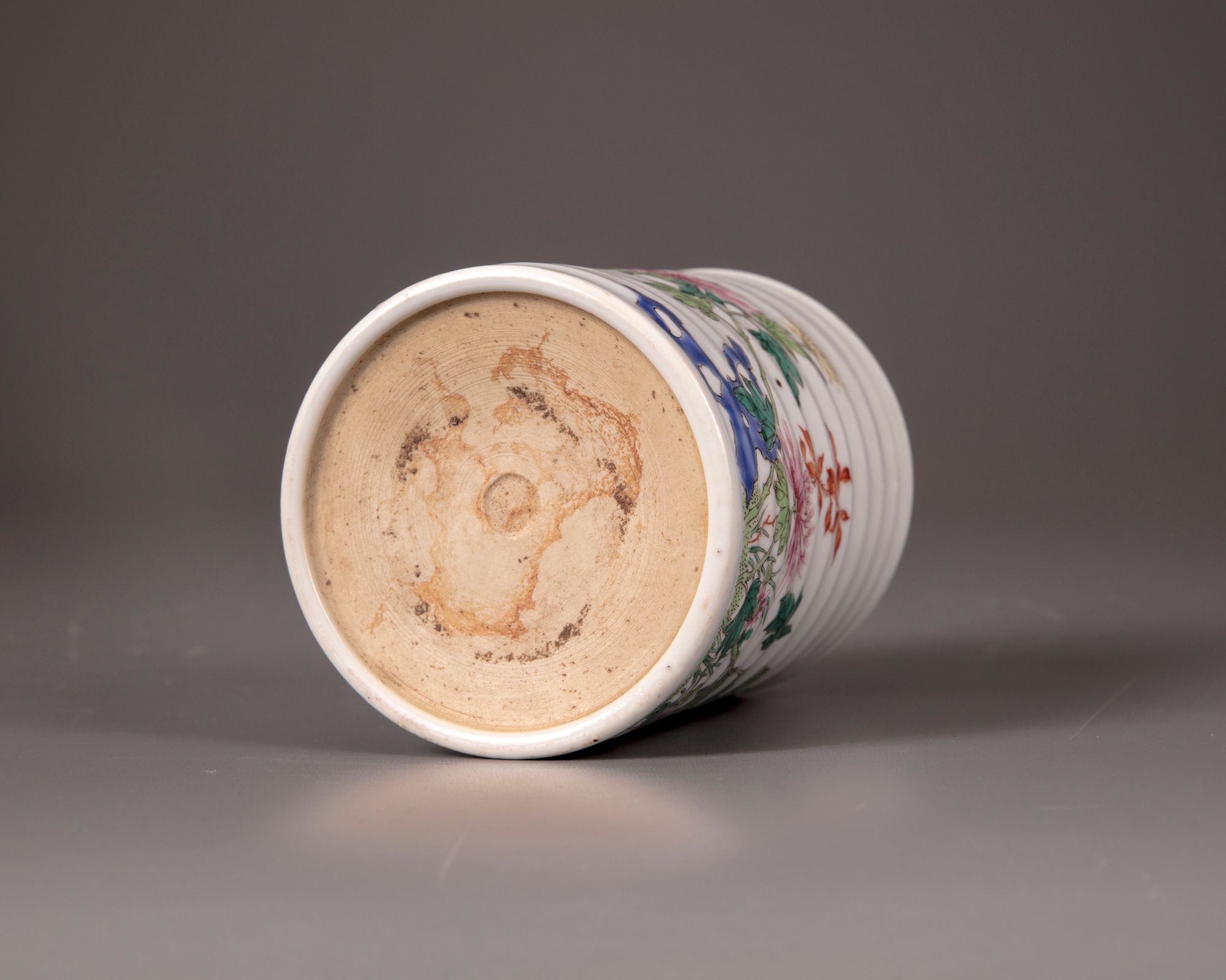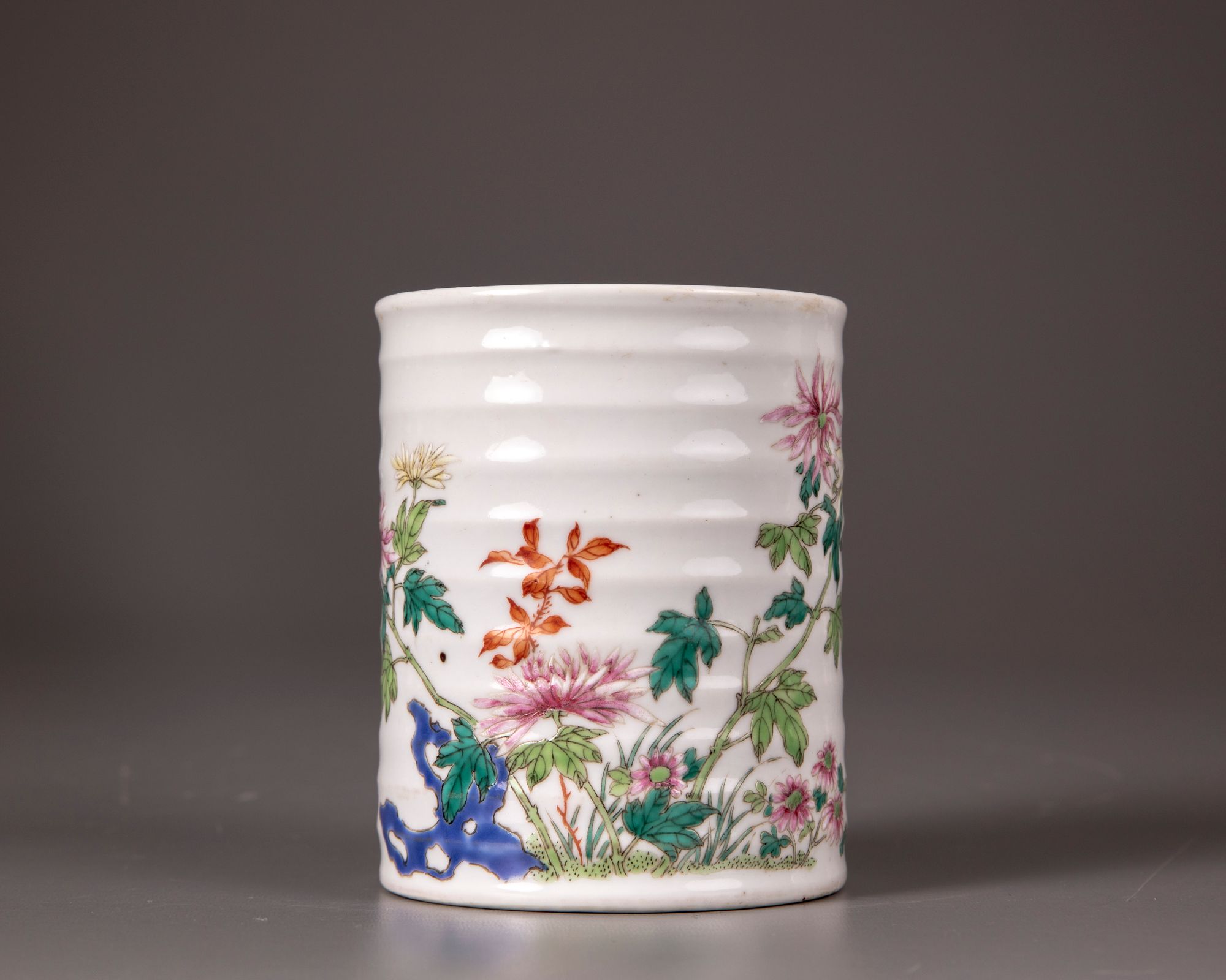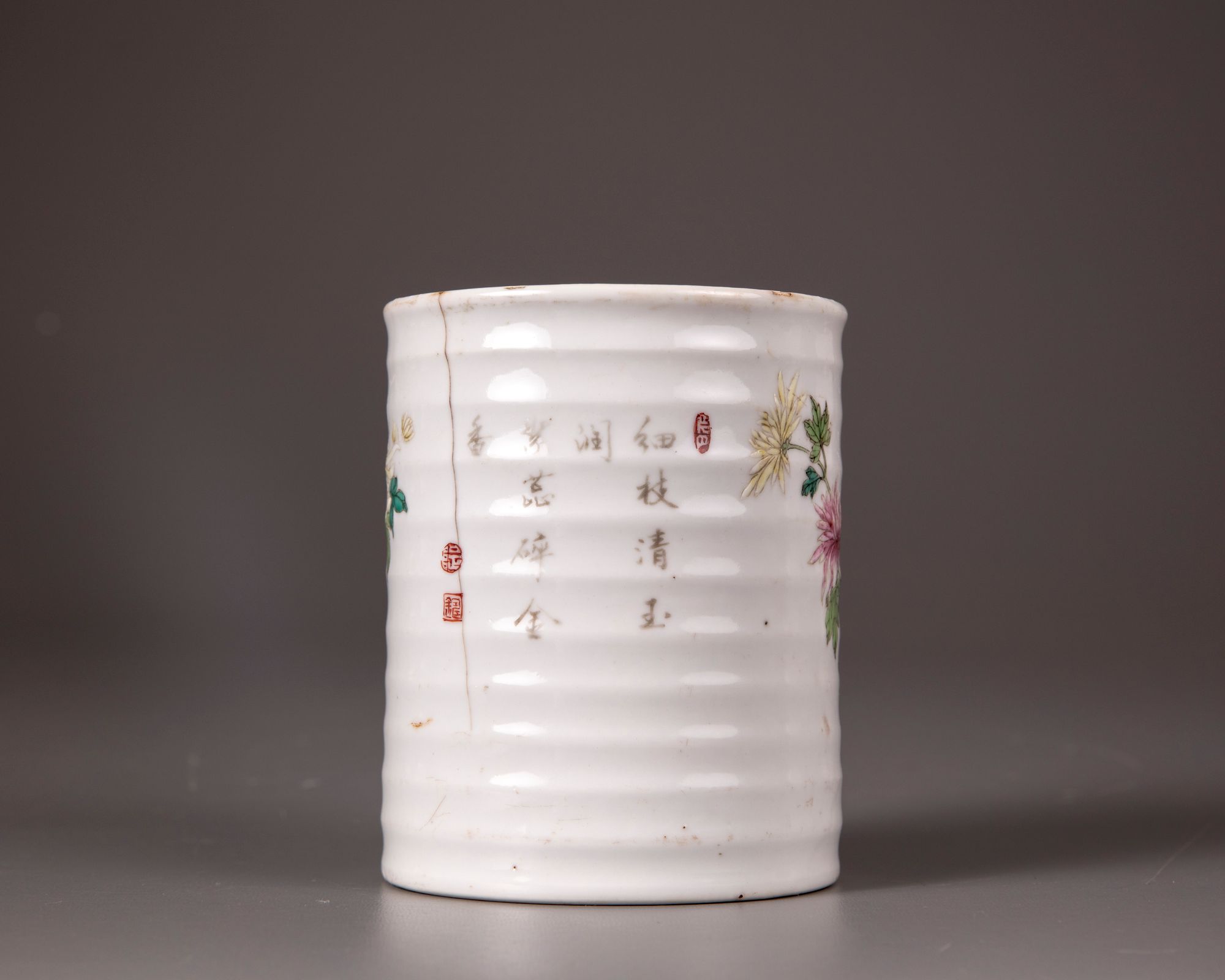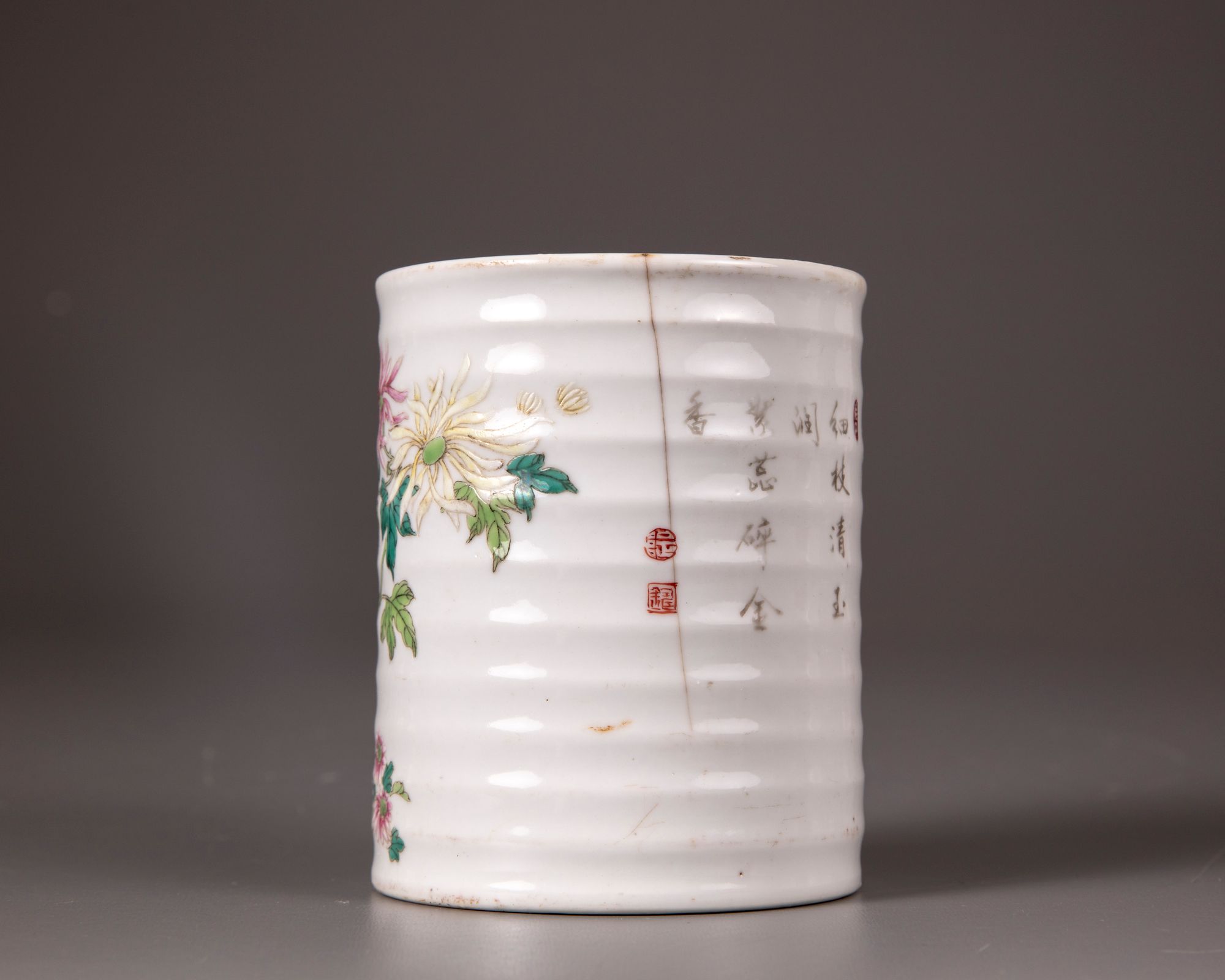 The brush pot is decorated with chrysanthemum, asters, and further flowers and leaves growing beside a rock. The reverse is inscribed with an excerpt from the Tang poet Chang Xuan's poem about chryanthemums, which represents the ninth month, and two iron red seal marks.