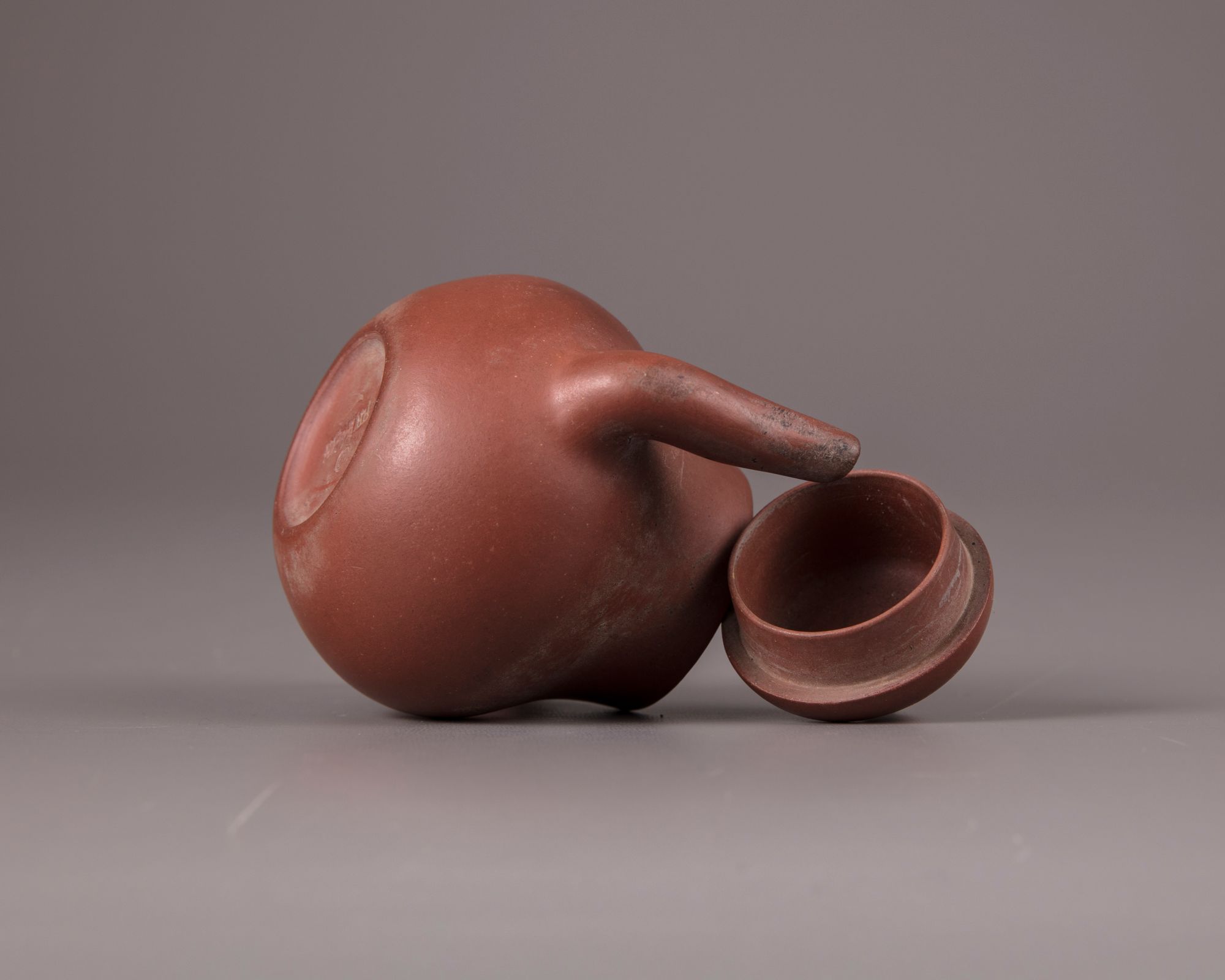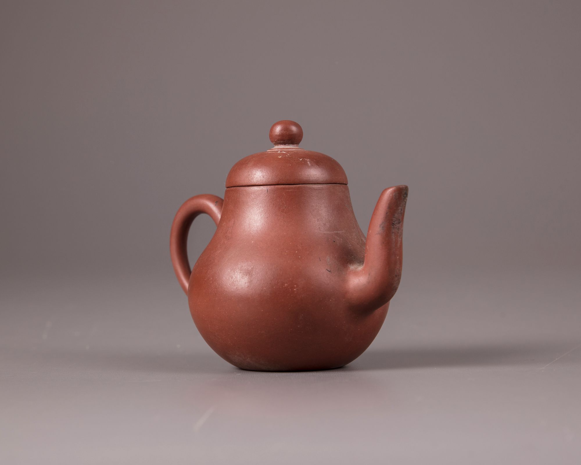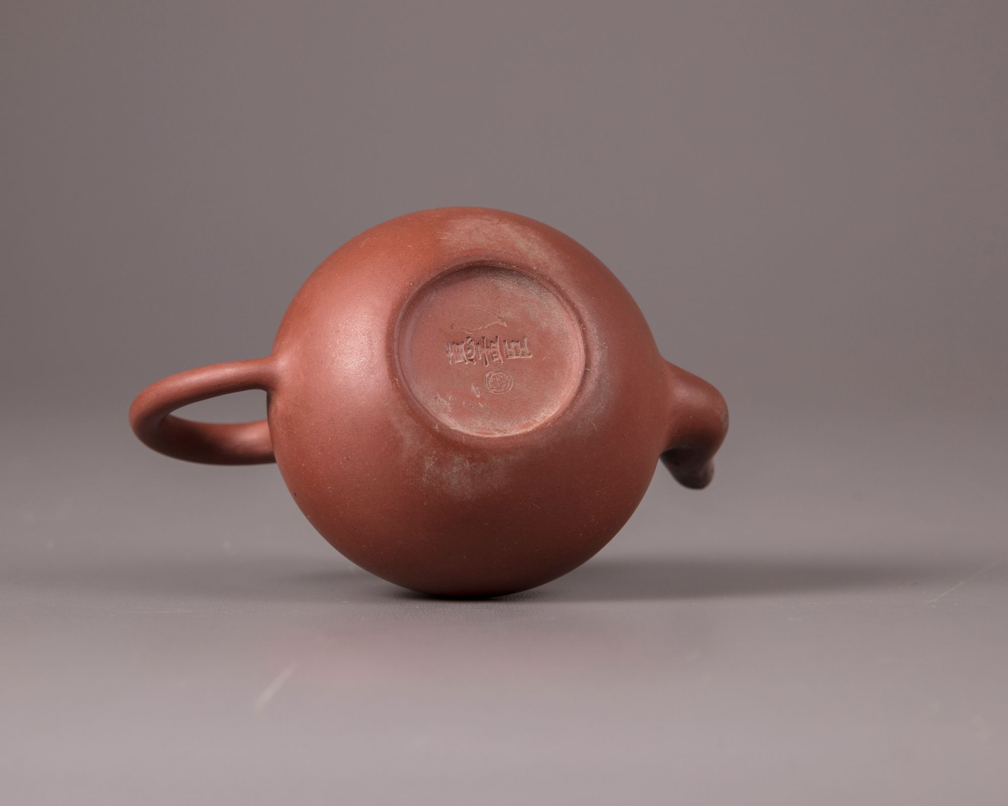 The pear shaped teapot is modelled with a thin handle and s-shaped spout, the base is marked Hui Mengchen, one seal reading 'Hui' and an artemisia leaf. The domed cover is surmounted by a ball finial.