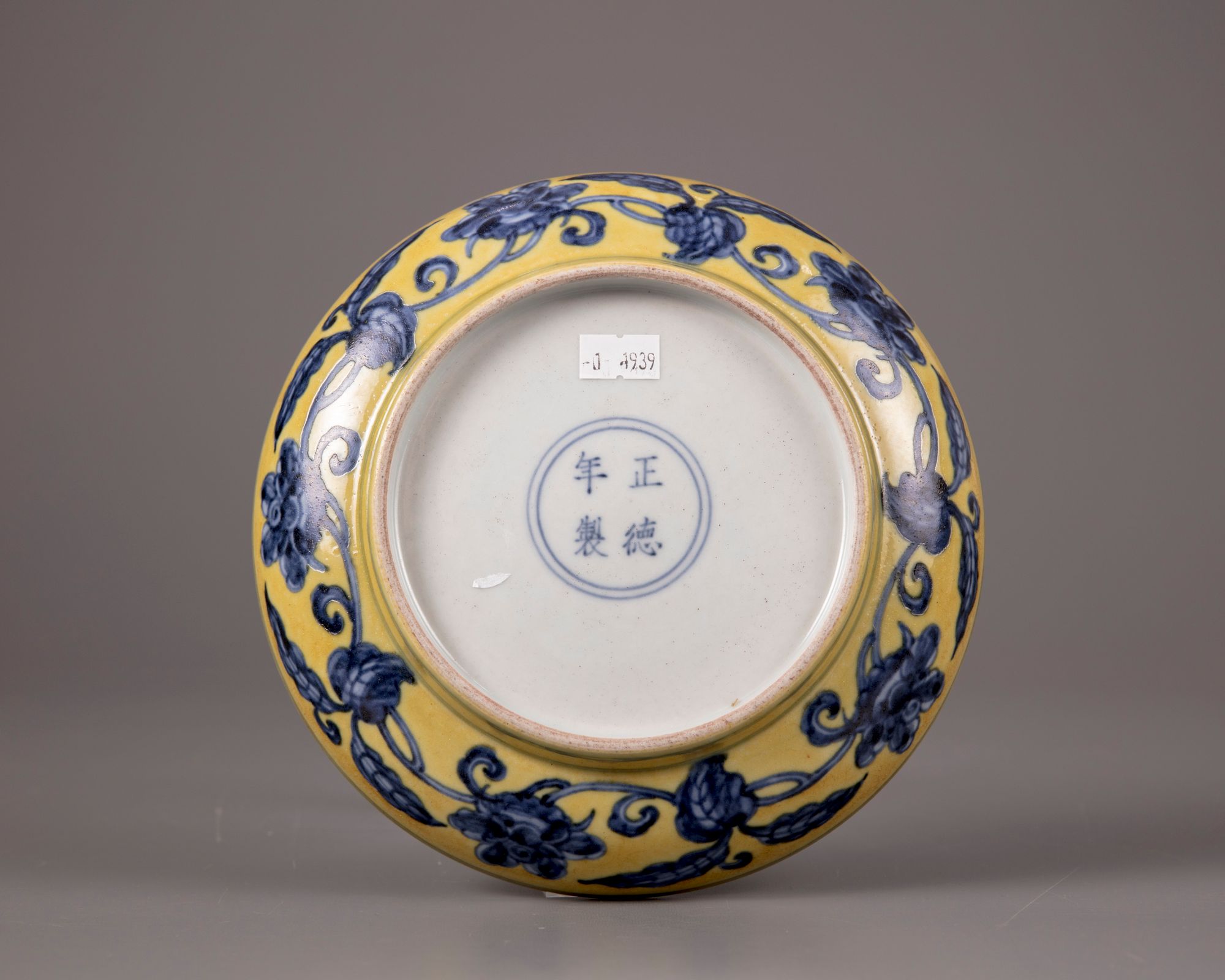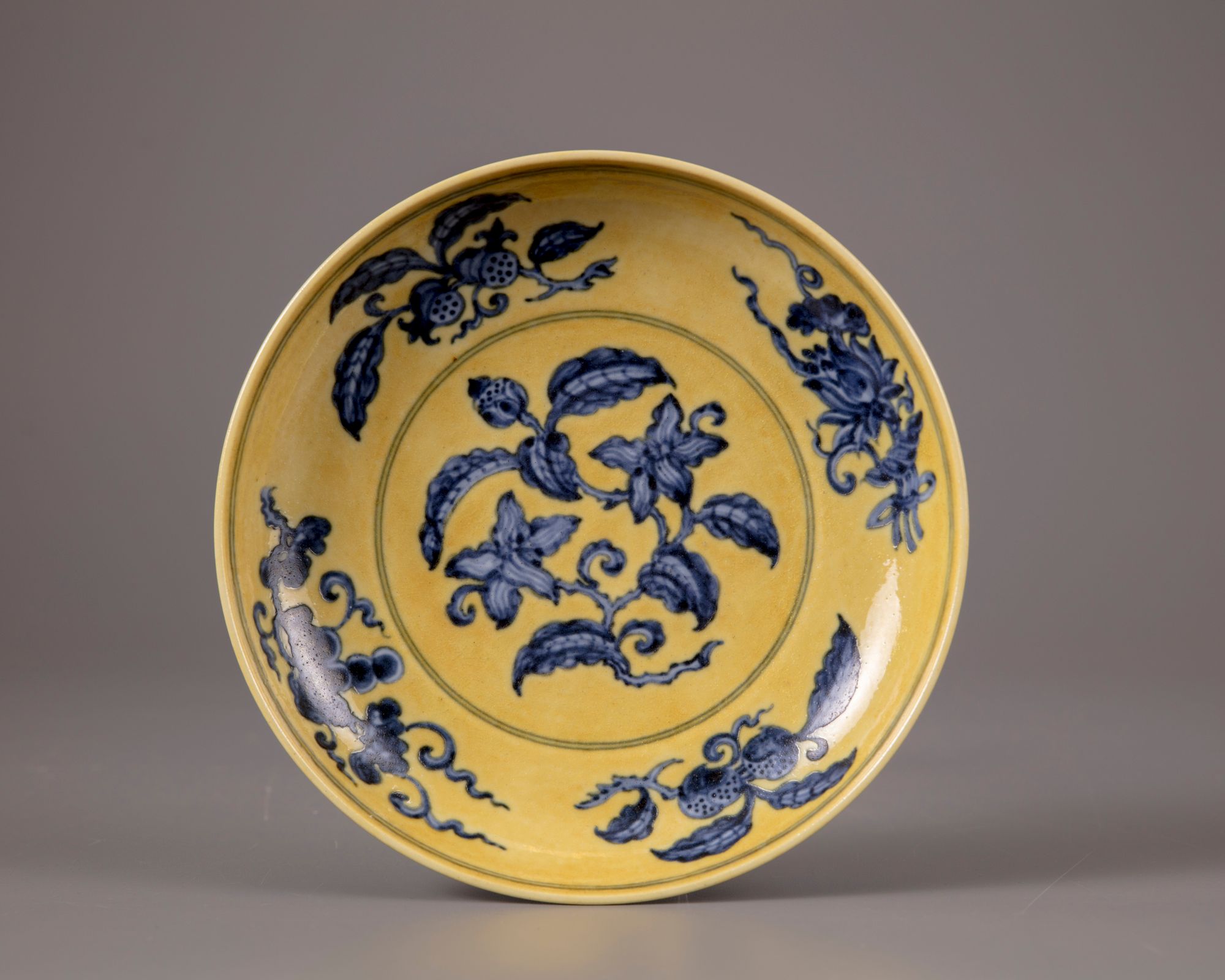 The dish is decorated with branch of flowering and budding gardenia and the cavetto is decorated with pomegranates, peaches, grapes and ribboned lotus. The exterior is decorated with a scrolling lotus band. The white-glazed base with an apocryphal Xuande mark.