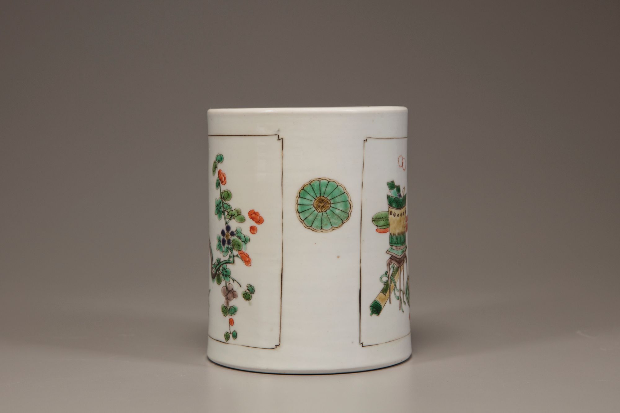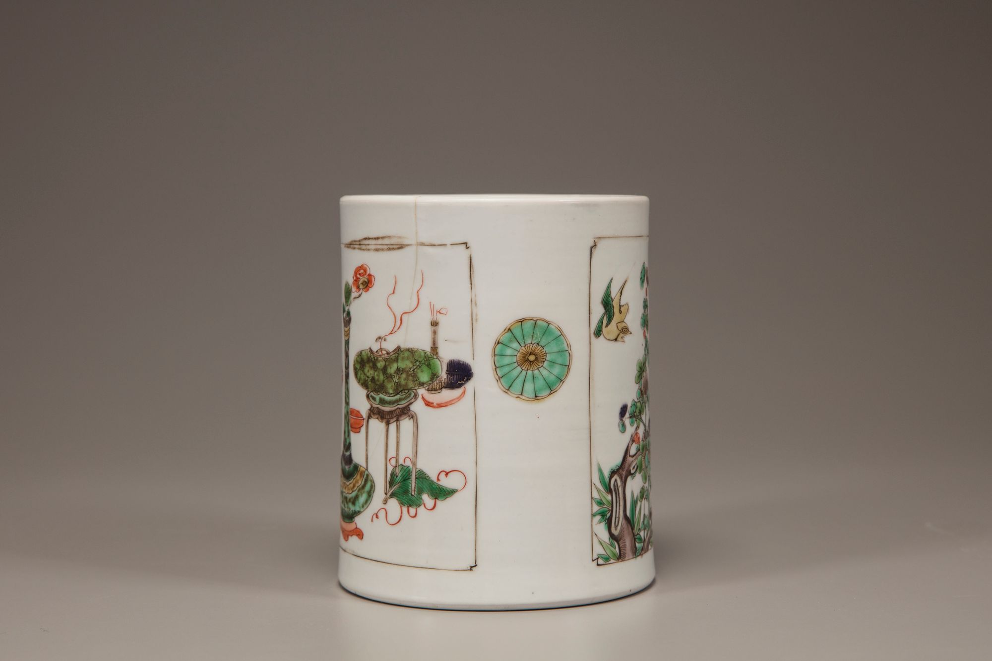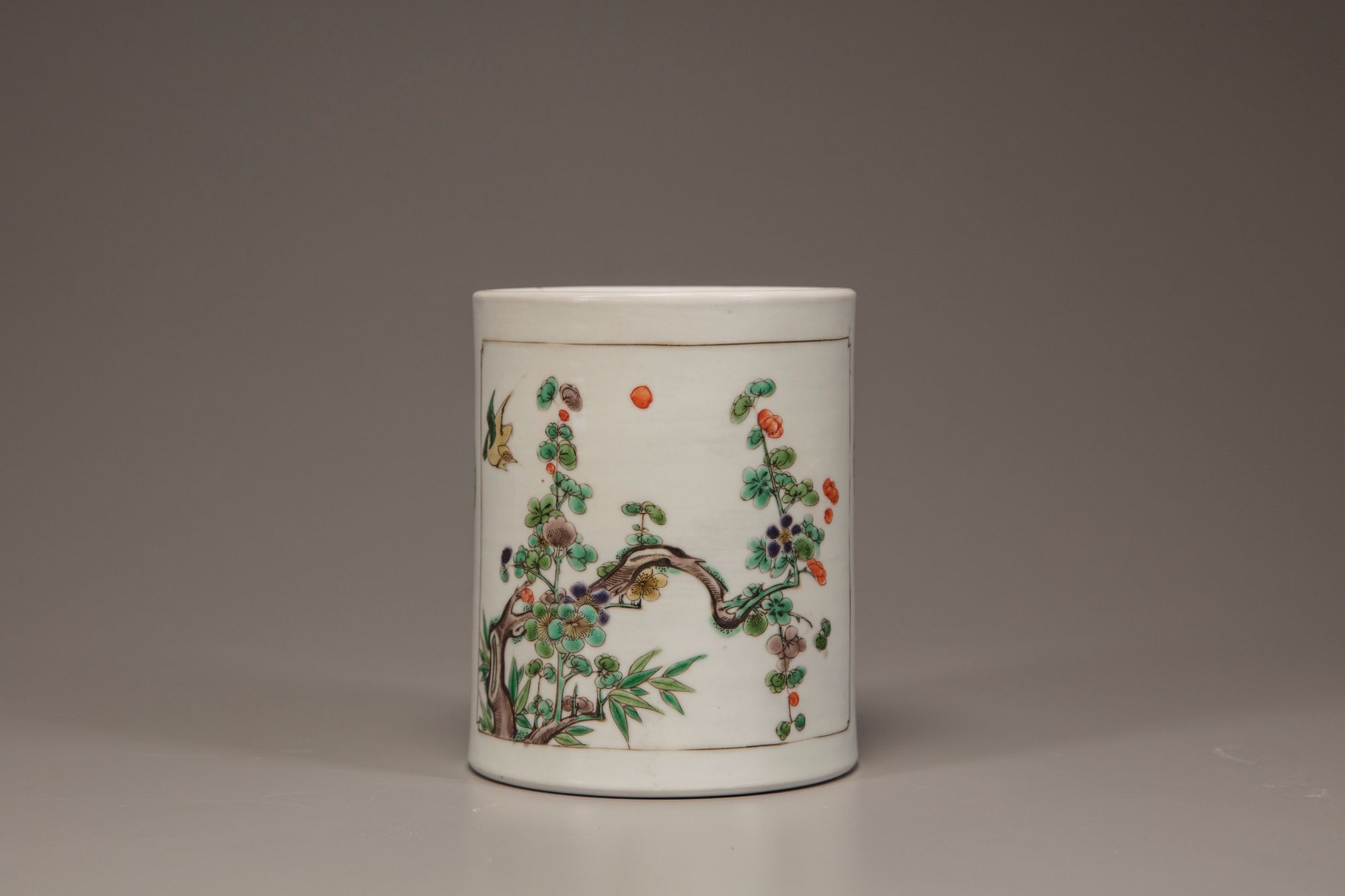 The brush pot is decorated with two panels, one depicting a bird in flight amongst flowering prunus, and the other with enclusing a multitude of precious objects. The two panels are separated by a chrysanthemum flower head.