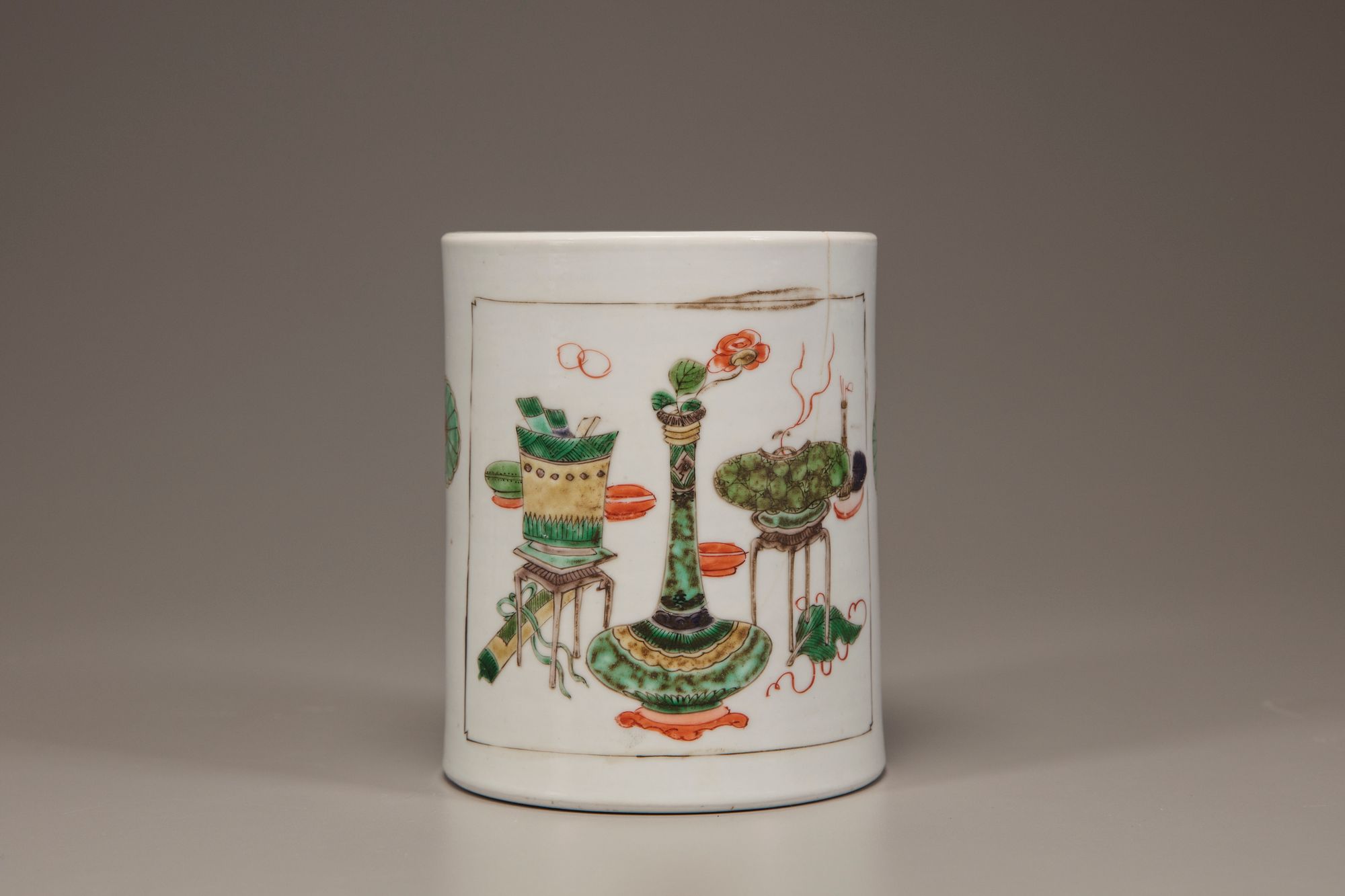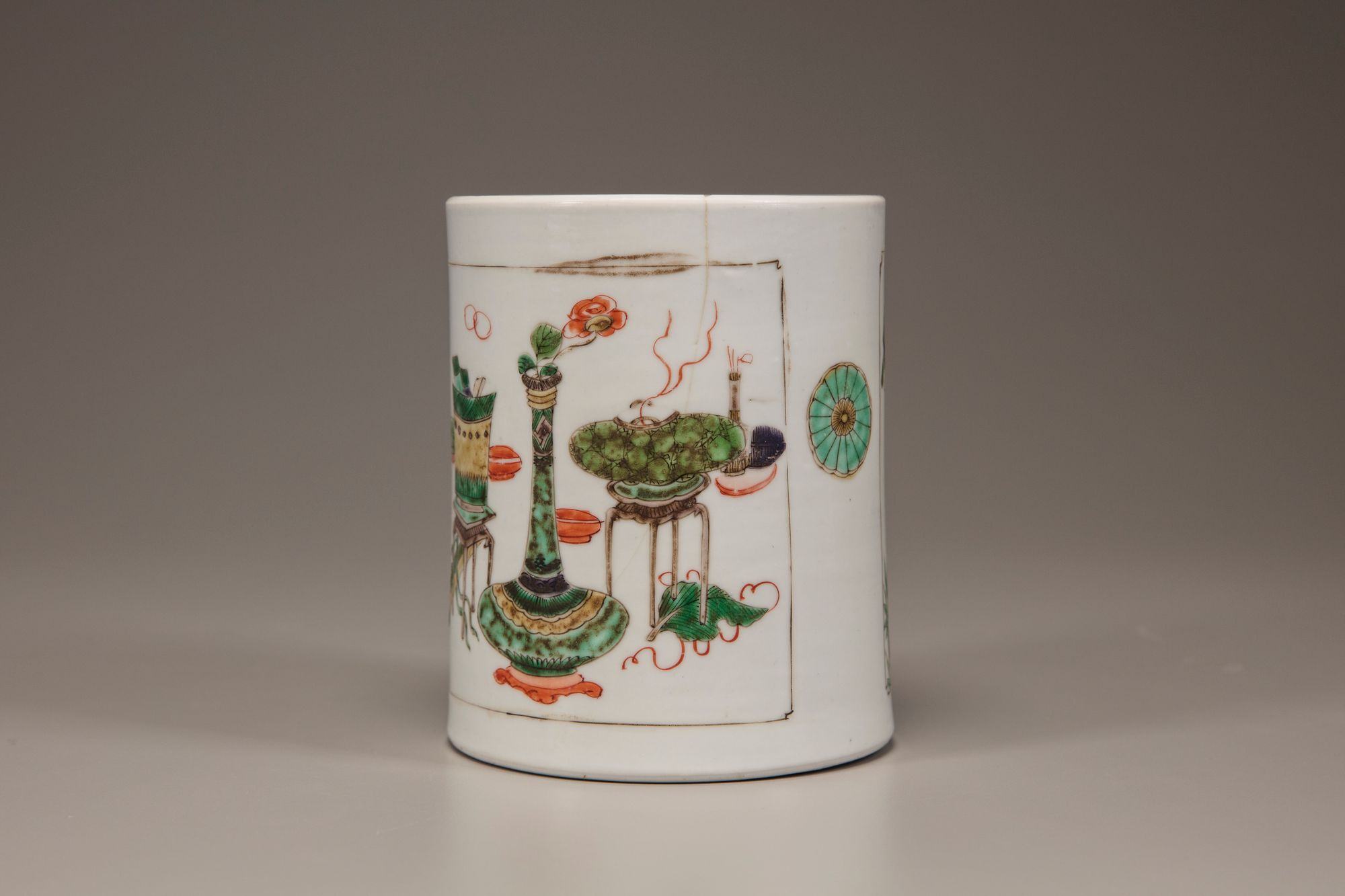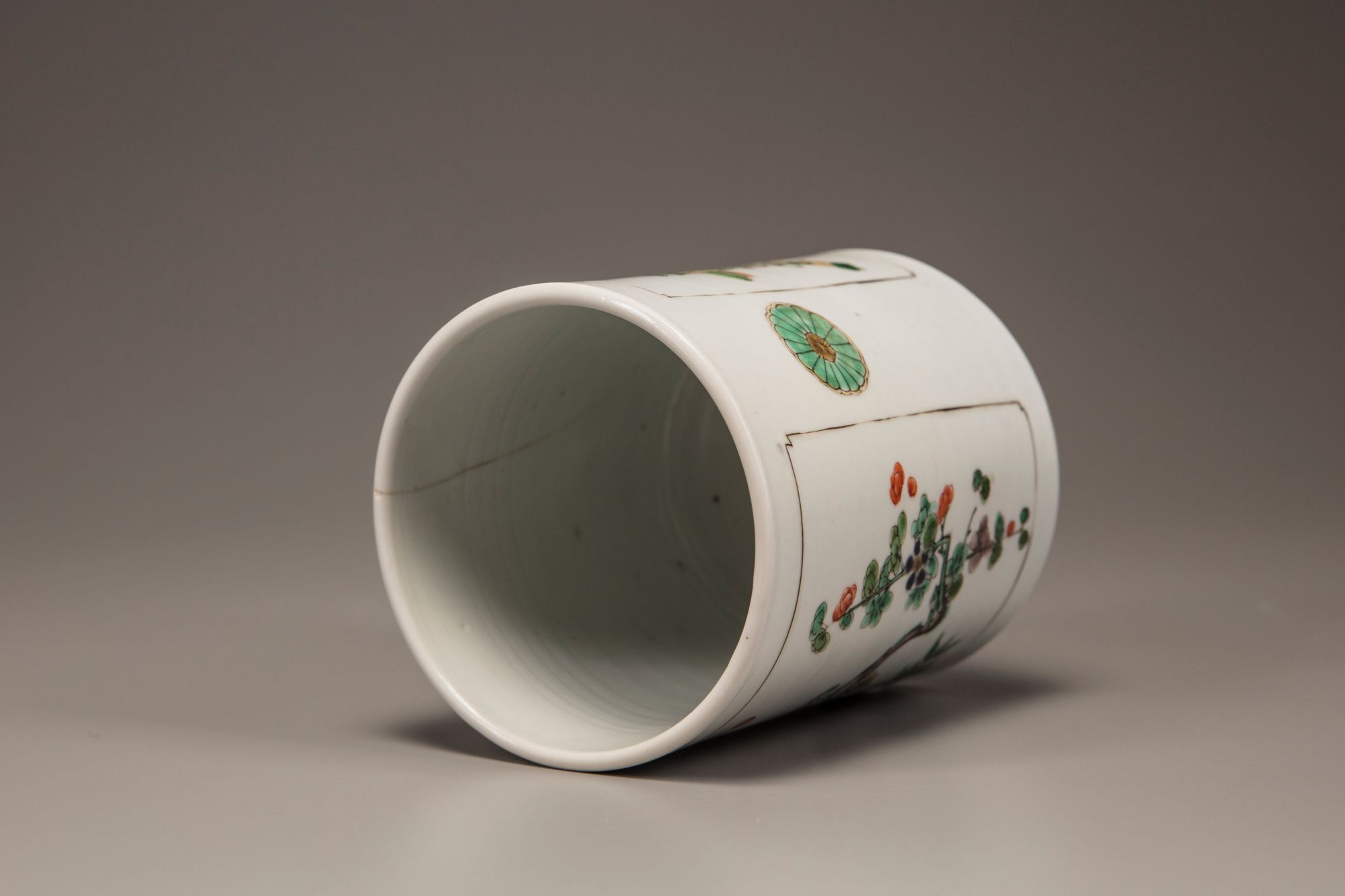 The brush pot is decorated with two panels, one depicting a bird in flight amongst flowering prunus, and the other with enclusing a multitude of precious objects. The two panels are separated by a chrysanthemum flower head.