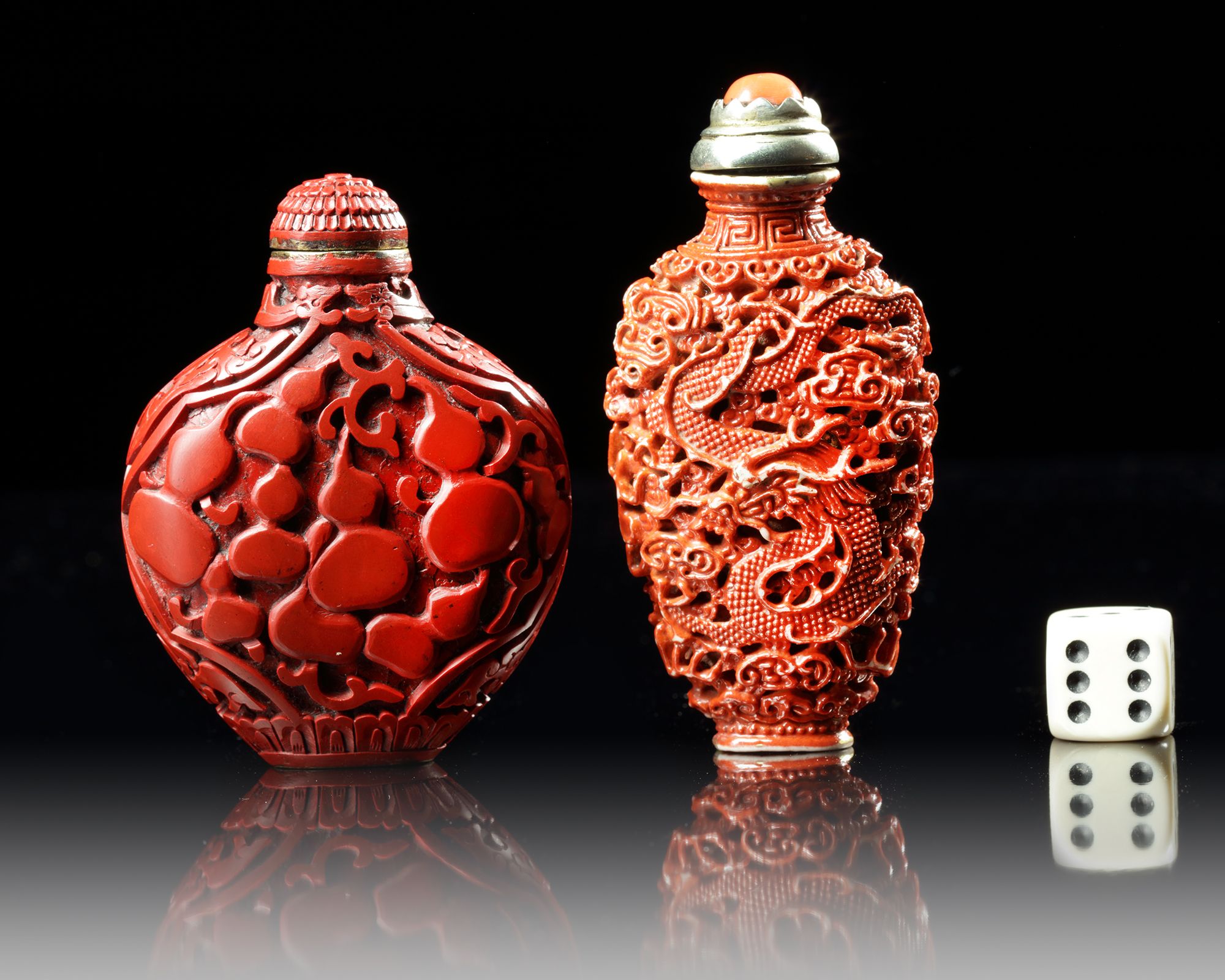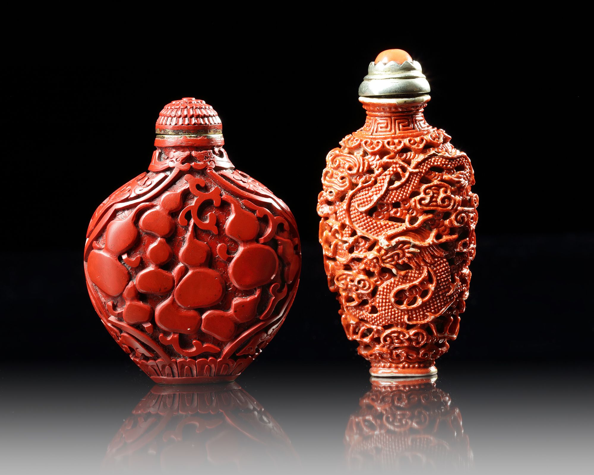 One is a cinnabar lacquer snuff bottle carved in relief with a multitude of gourds on a vine, and the other is an imitation-cinnabar lacquer snuff bottle in porcelain glazed in iron red, moulded in relief with a dragon and phoenix.