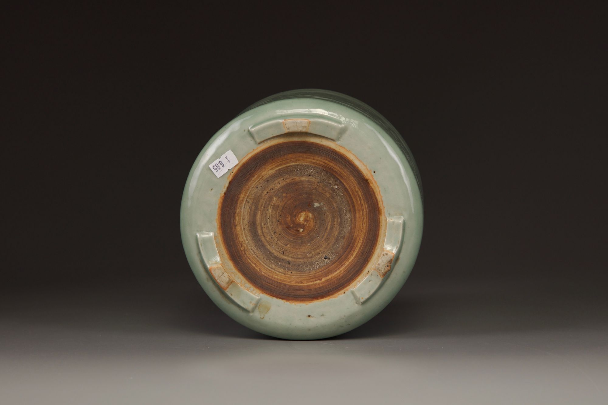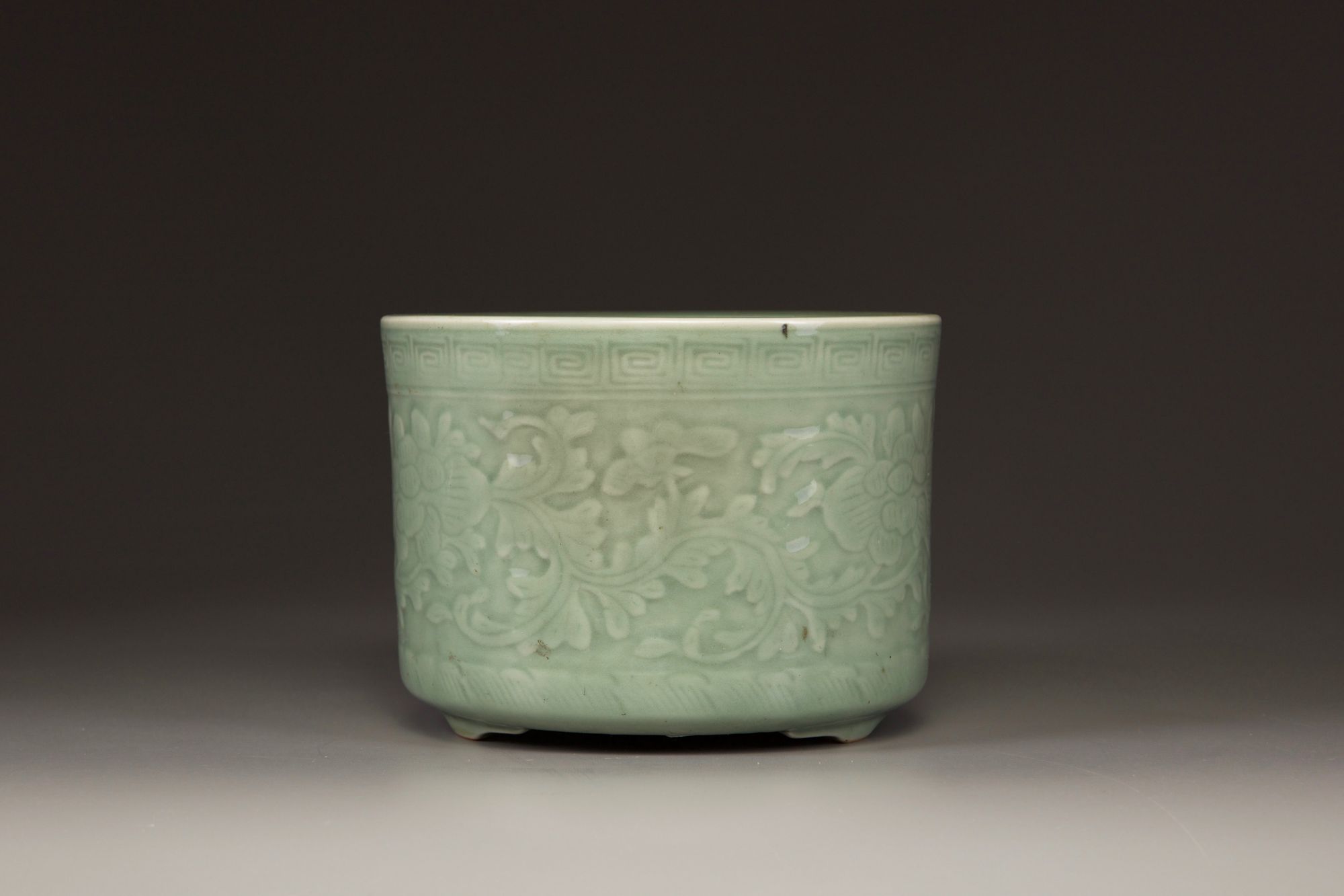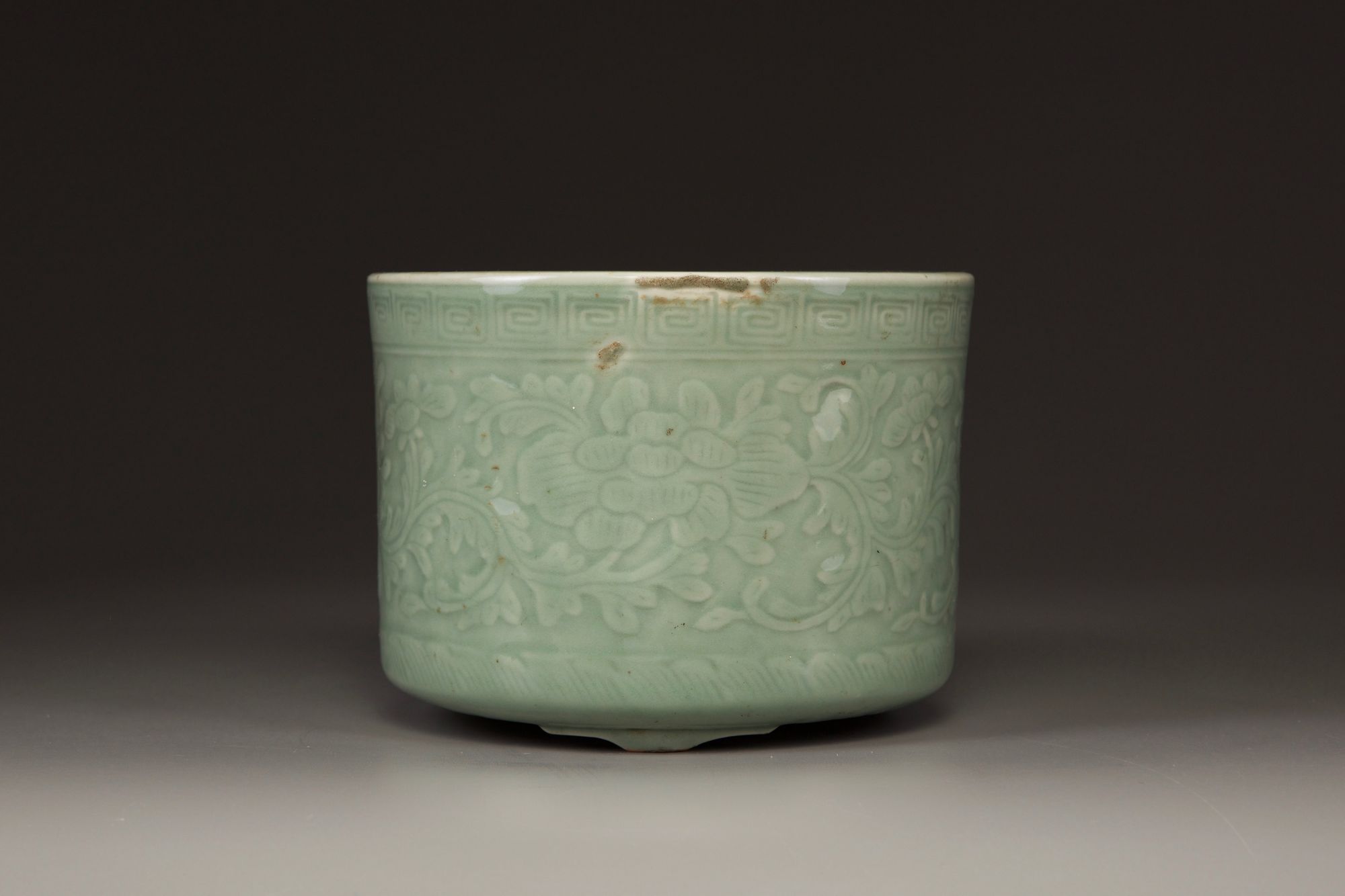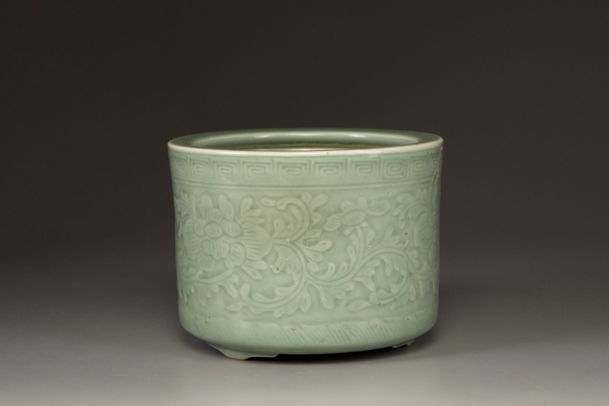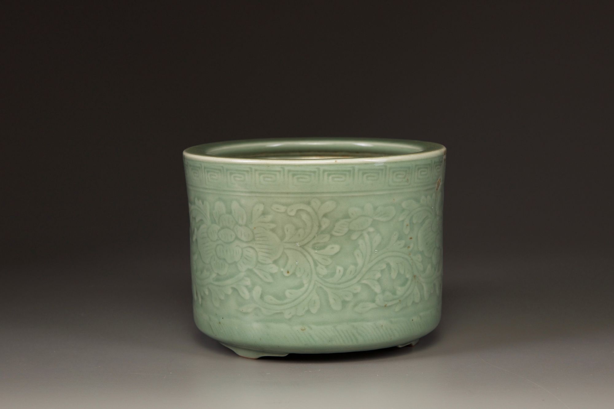 The cylindrical censer is decorated with a wide band of leafy peony sprays between a squared scroll band to the rim and petal band to the foot. It is covered with an olive-green glaze save for a circular section to the base.