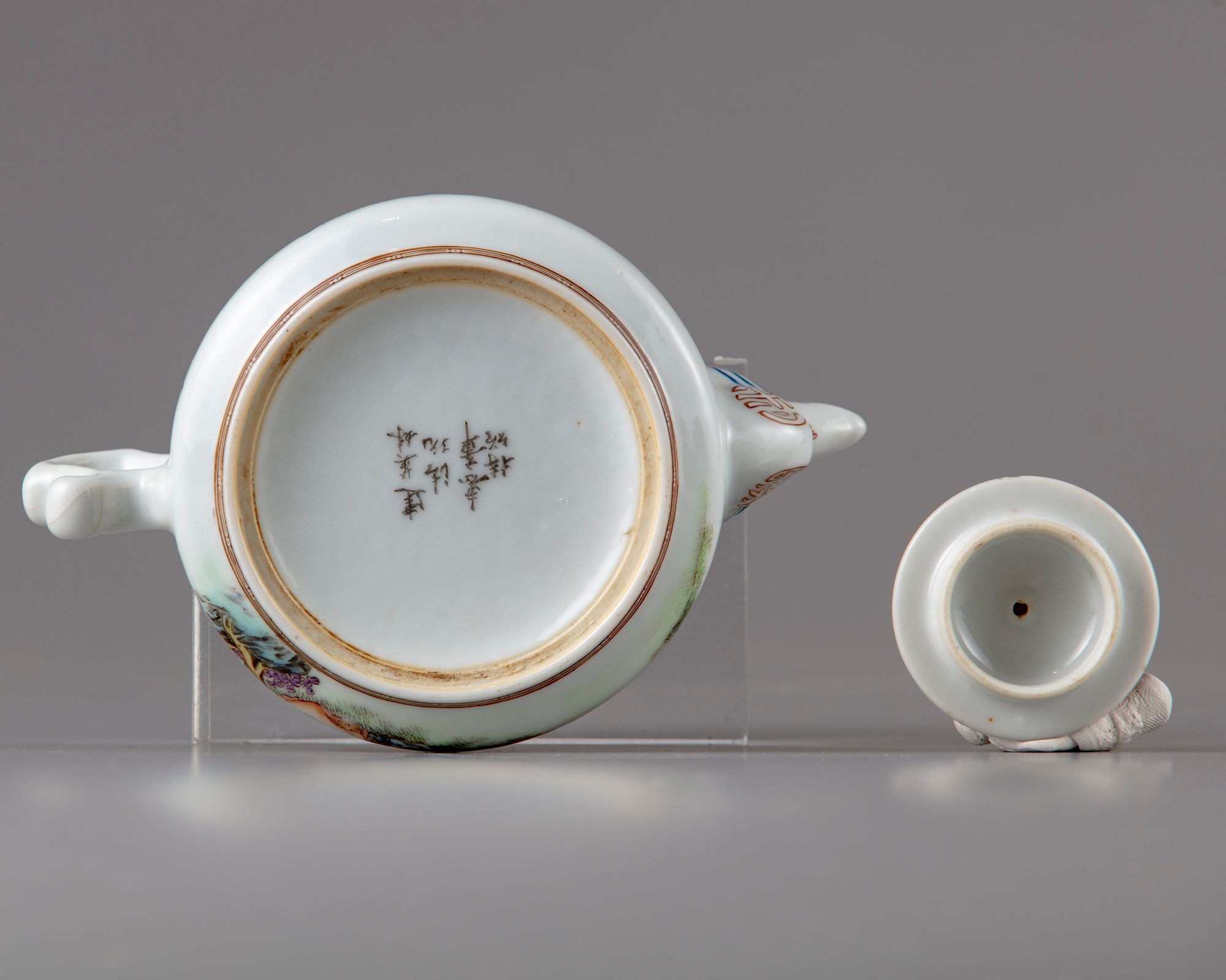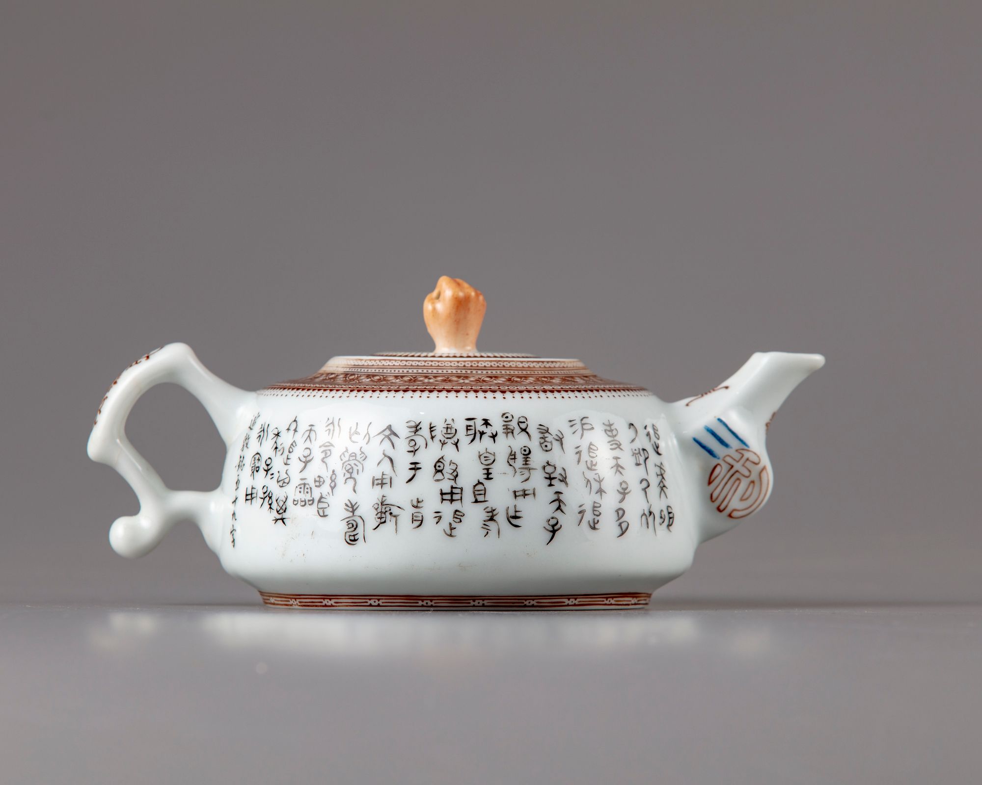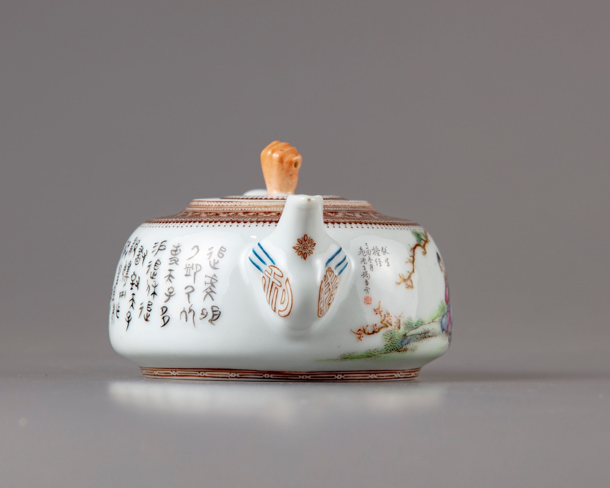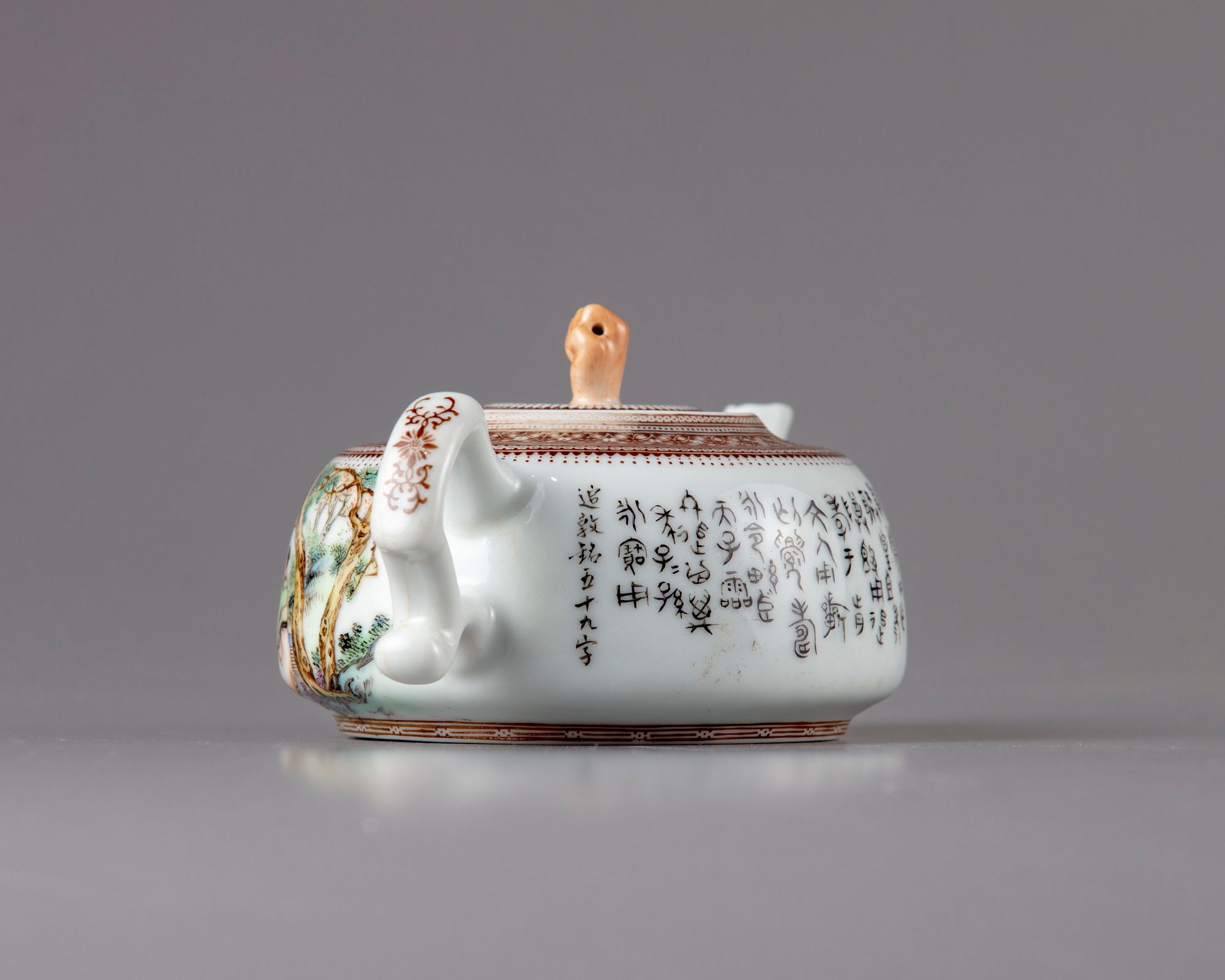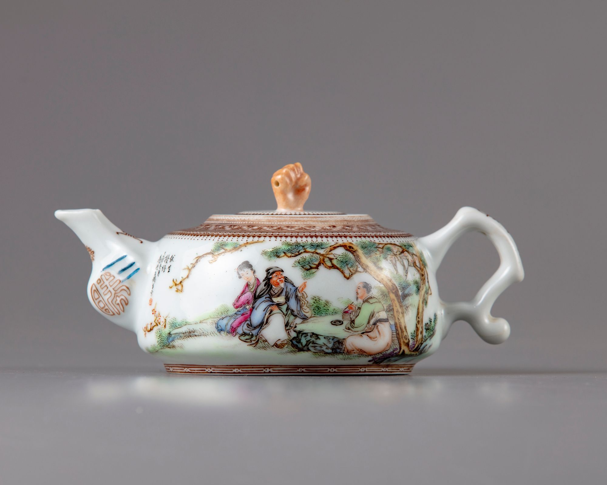 The teapot is decorated with two figures with a lady ,seated under a tree in a landscape, the reverse with a Chinese calligraphy " poem".The spout with a shot character the cover with a hand shaped handler and decorated with a key fret chain.