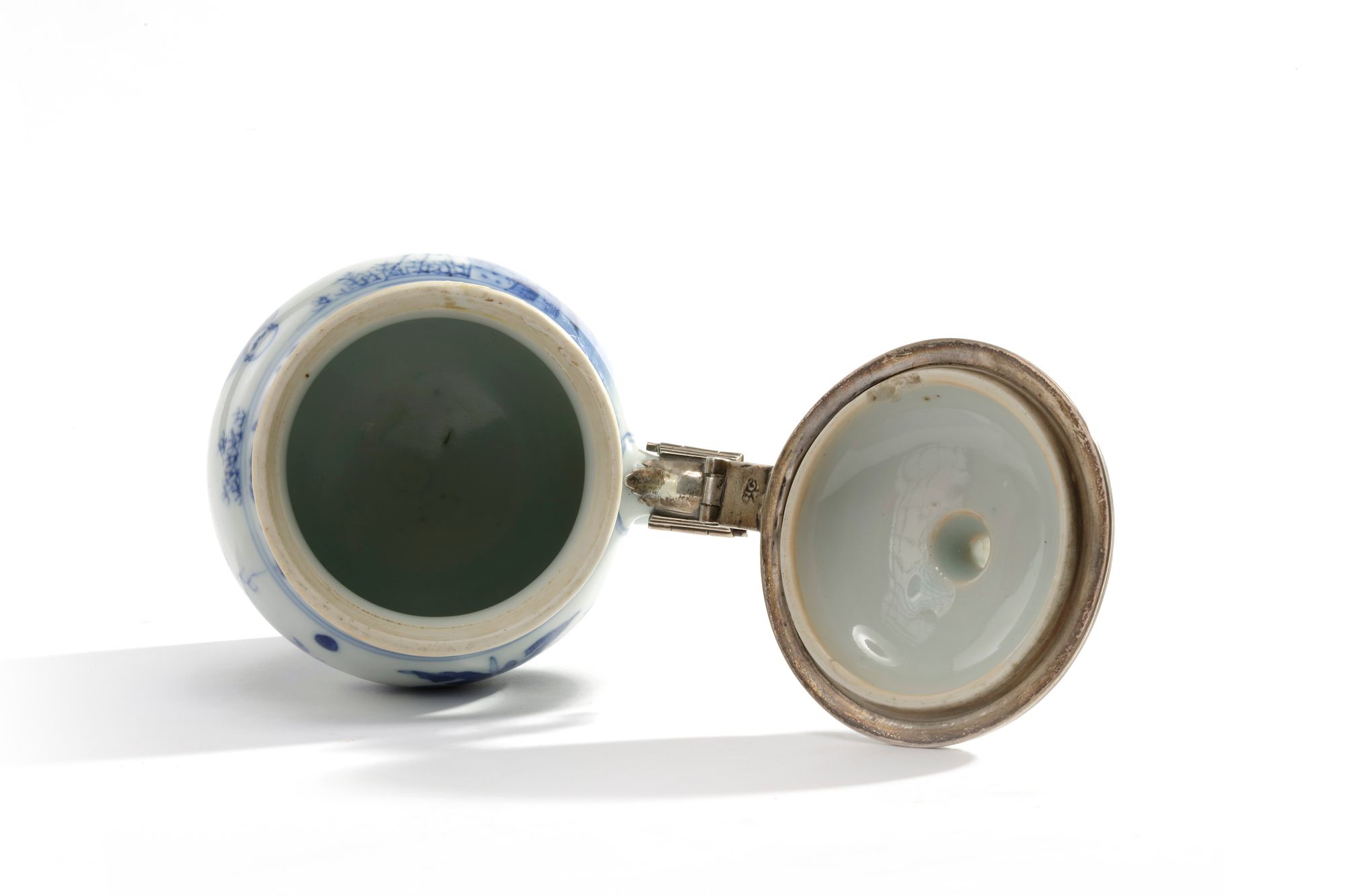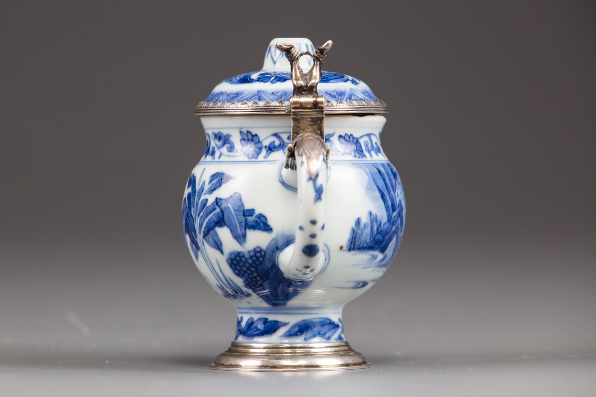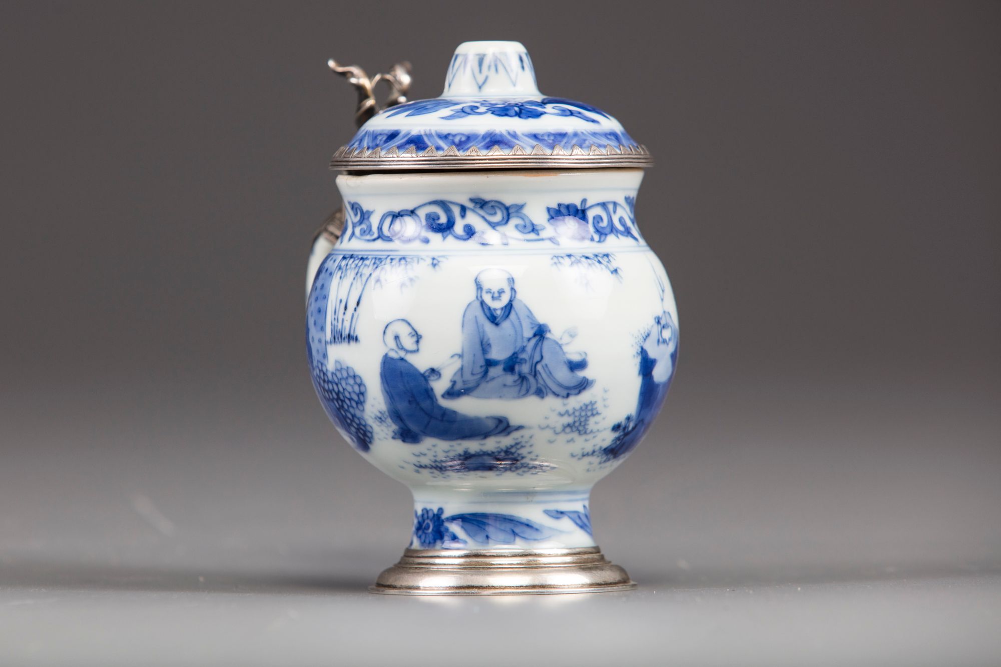 The bulbous body decorated with a continuous scene of two Luohan seated next to a censer on a rocky base amongst plants and plantain, all below a scrolling floral band. The foot is decorated with a further floral band. The domed cover is similarly decorated with a pierced finial. The silver mounts to the rim of the cover and to the foot, the hinge is modelled as a ram's horns.